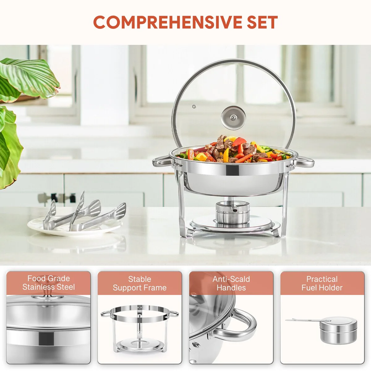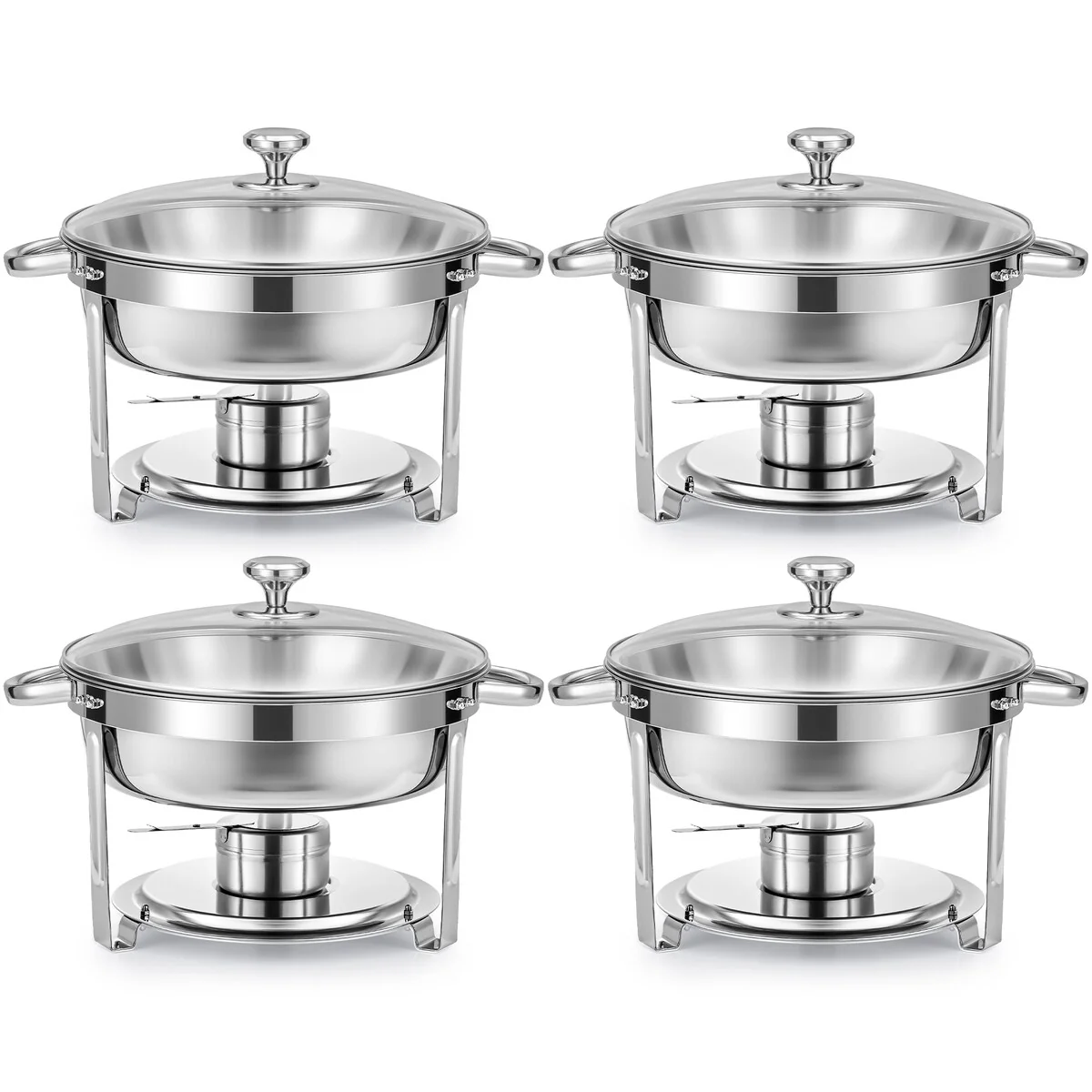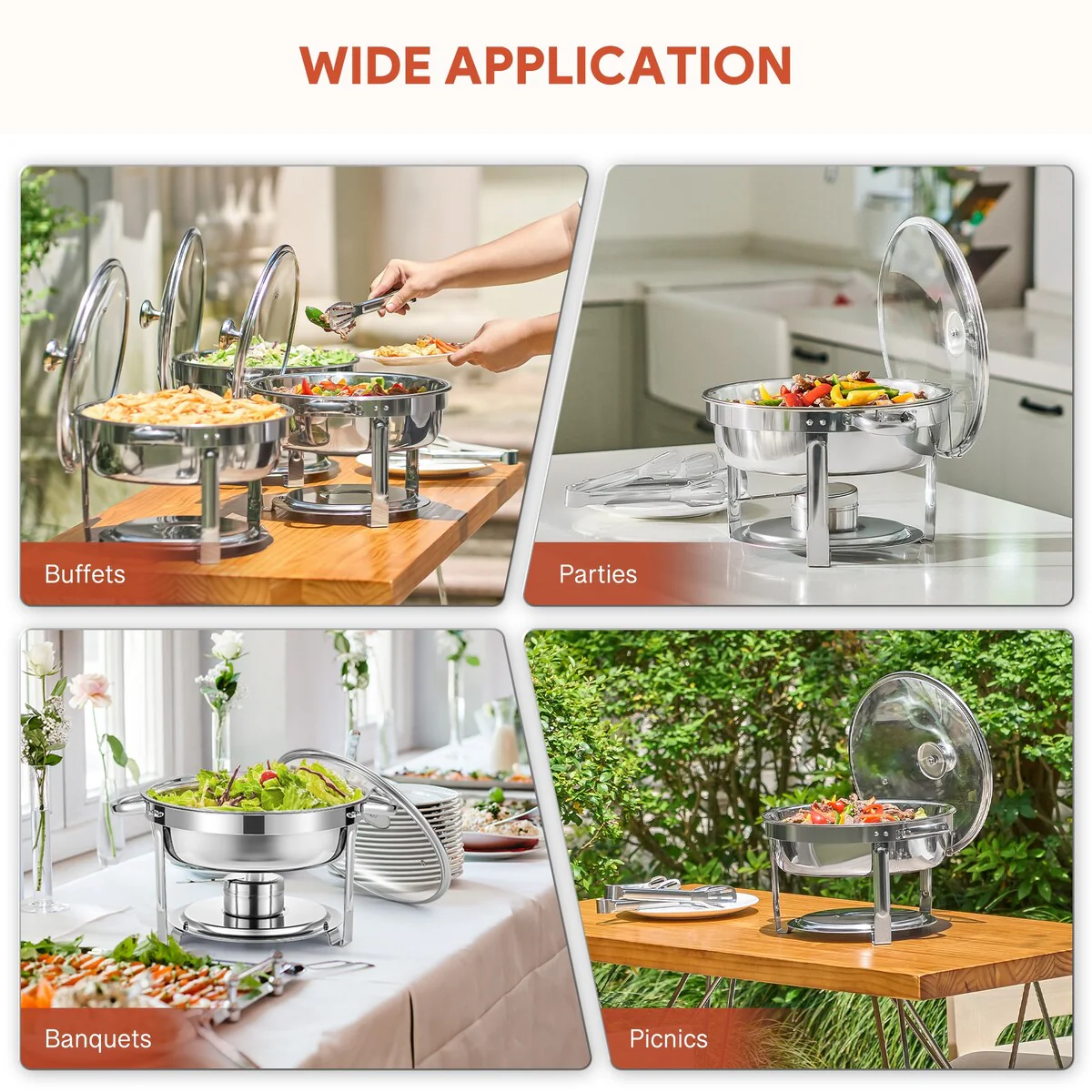 Get ready to wow every guest at your table with our chafing dish buffet set. With its generous 6 qt. capacity, it keeps the food flowing and the party going strong. But that's not all—this chafing dish set does double duty by keeping your dishes warm and your desserts or drinks chilled. Crafted from sturdy stainless steel, our buffet chafer set makes cleanup a breeze and keeps your culinary creations safe for all to enjoy. Plus, the clear glass lid allows you to sneak a peek at the mouthwatering dishes inside. Whether it's a wedding, a party, or just a fun get-together, this round chafing dish set has got you covered!
