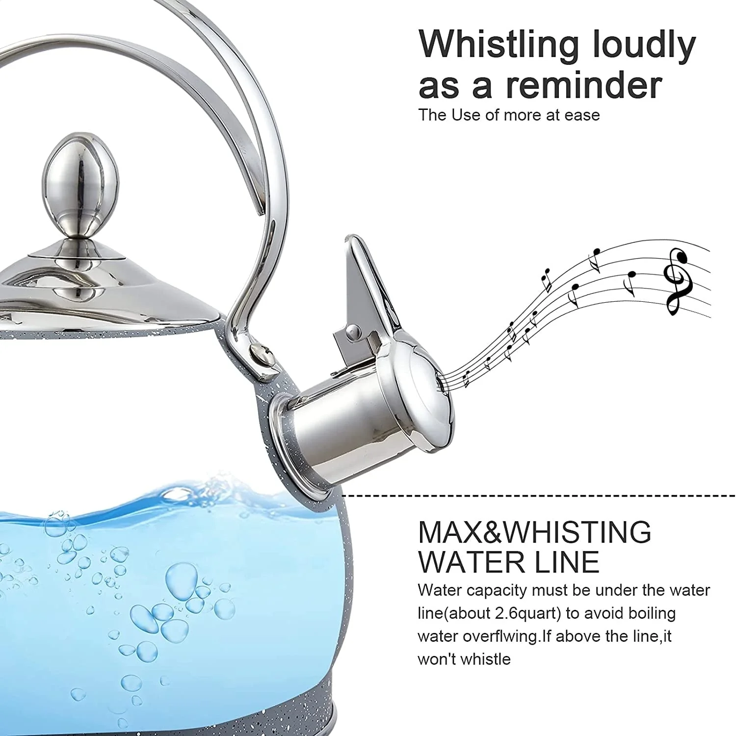 - Loudly whistle: When the water is boiling, the whistling kettle will automatically emit a whistle, so you can hear a unique and loud whistle. When you are focusing on other issues (such as housework, watching TV or games), the whistle on the tea kettle will attract your attention. Time-saving, simple, and stress-free.