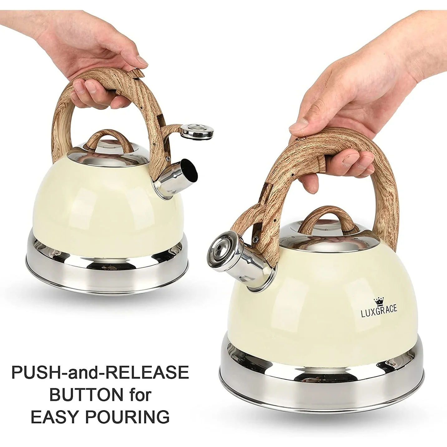 This 3.0 Quarts whistling stainless steel stovetop tea kettle is crafted of high quality stainless steel. Whistles when boiling, can be used on gas, electric, induction, halogen, and radiant stovetops. The tea kettle heats up quickly and retains heat well. Convenient trigger mechanism on the handle allows for the safe and easy pour. Removable lid for easy filling and convenient one finger flip spout for easy and safe pouring.The powder coating finish on the kettle body, this sophisticated design tea kettle is also perfect embellishment for your kitchen.