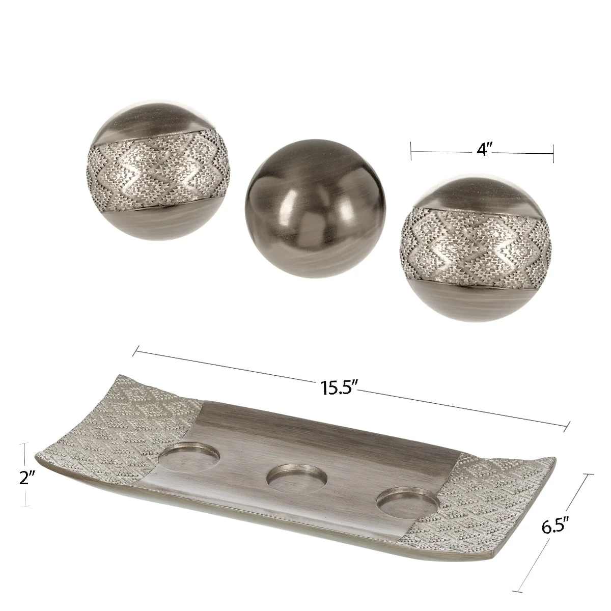 Elevate your home decor with the Dublin Decorative Tray and Orbs/Balls Set. This stunning collection features a rich brushed silver hue and metallic-looking sheen that will accentuate your space. The unique mix of sharp and smooth lines, along with the textured diamond-shaped pattern, creates a one-of-a-kind look that will complement any contemporary, rustic, or industrial decor. Each piece is made with great attention to detail, and the orbs/balls have protective bottoms to prevent table scratches. With this set of 3, you'll get great value for your money.