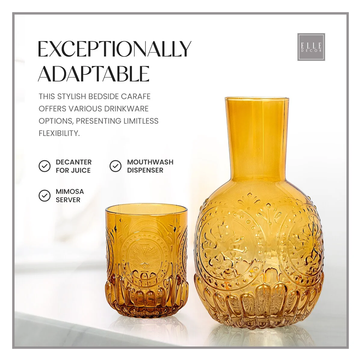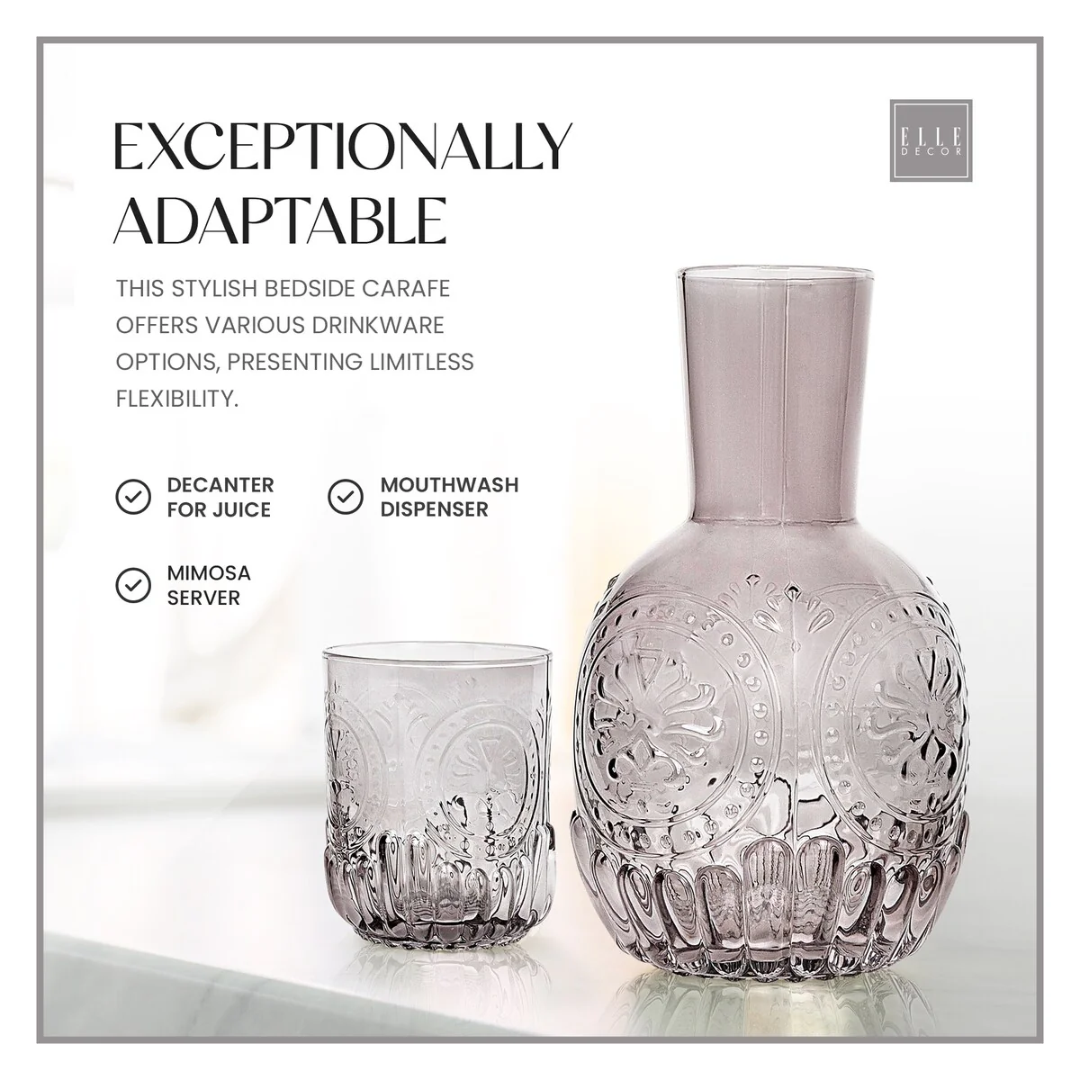 The 2-Piece Bedside Carafe Set by Elle Décor is an expertly crafted set made of glass that includes a carafe and a tumbler, making it an excellent addition to any bedside table. The contemporary design features a vintage style relief and etched glass design that adds sophistication and beauty to any space. With a 30-oz capacity and measuring 4.52'D X 8.26'H inches, the carafe can hold enough water to keep you hydrated throughout the night. Additionally, it can be used to store other drinks like herbal iced tea, refreshing juice, or mouthwash. This nightstand water carafe and glass can be used to enhance the decor of various settings, such as a nightstand, buffet table, bar, or fireplace mantle.