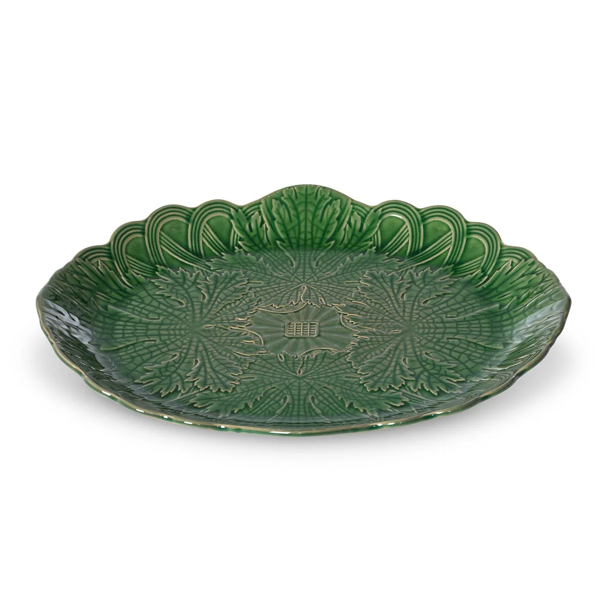 A functional work of art, this vibrant green glazed serving plate features an ornate pattern of grape leaves and fruit interlaced with a woven basket pattern.