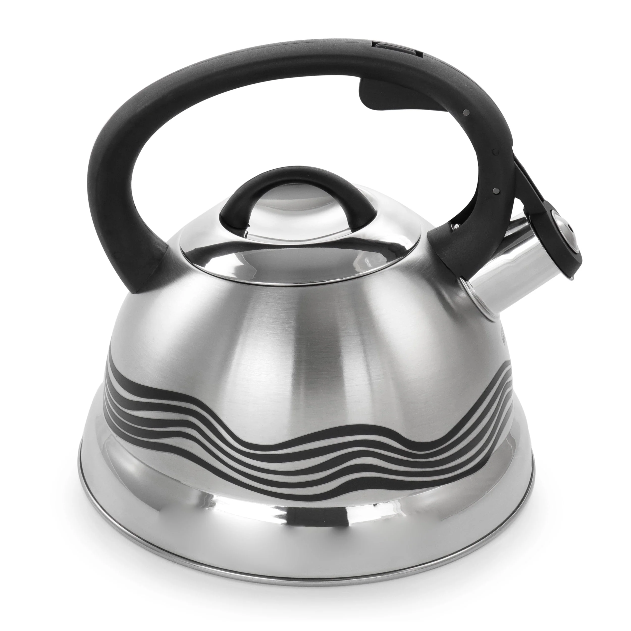 Jump start your morning with the Mr. Coffee Cagliari 1.75 Quart Stainless Steel Whistling Tea Kettle with Stay Cool Handle. Features unique black stripes that change colors when the kettle is heated. The flip open spout includes a built in whistle to indicate boiling water. Its bakelite handle stays cool under heat for safe and easy handling. Serve guest with herbal tea, artisanal pour over coffee, or a comforting cup of hot chocolate!