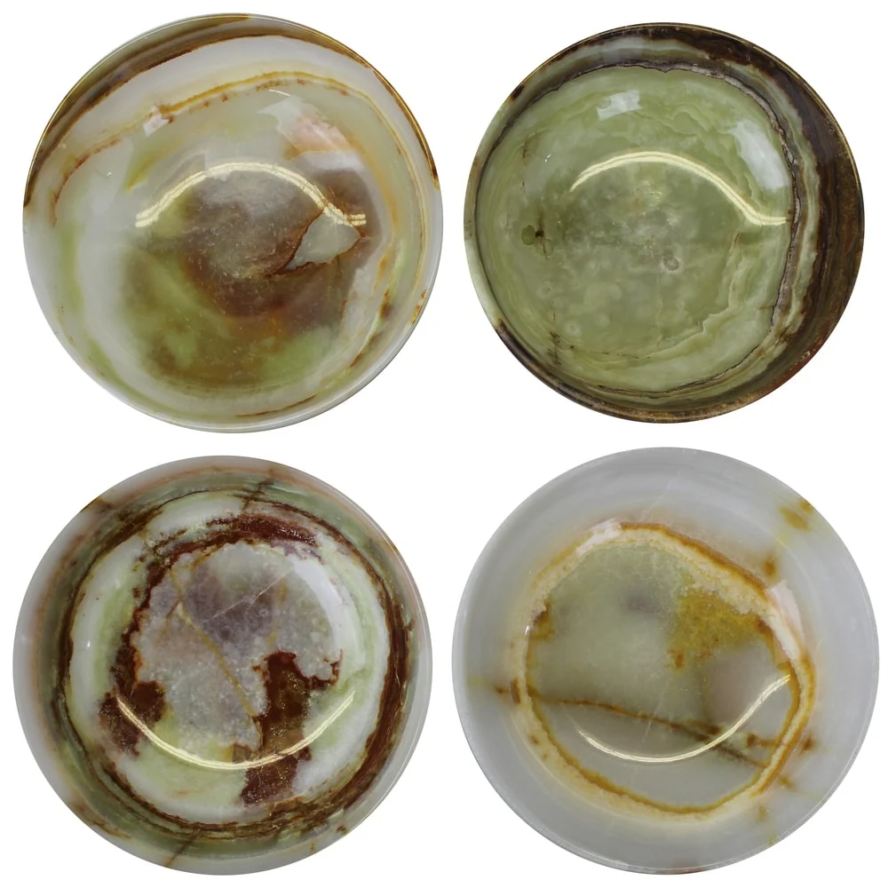 Elevate your home decor with this set of four Natural Geo Decorative Handcrafted 6' Onyx Bowls. Each bowl is uniquely handcrafted by skilled artisans, making them one-of-a-kind pieces. These modern and abstract bowls are perfect for adding a touch of elegance to your tabletops and shelves while complementing any decor. The smooth finish and multicolored (green, red, brown, white) onyx material give these bowls a beautiful and natural aesthetic that will surely impress your guests.