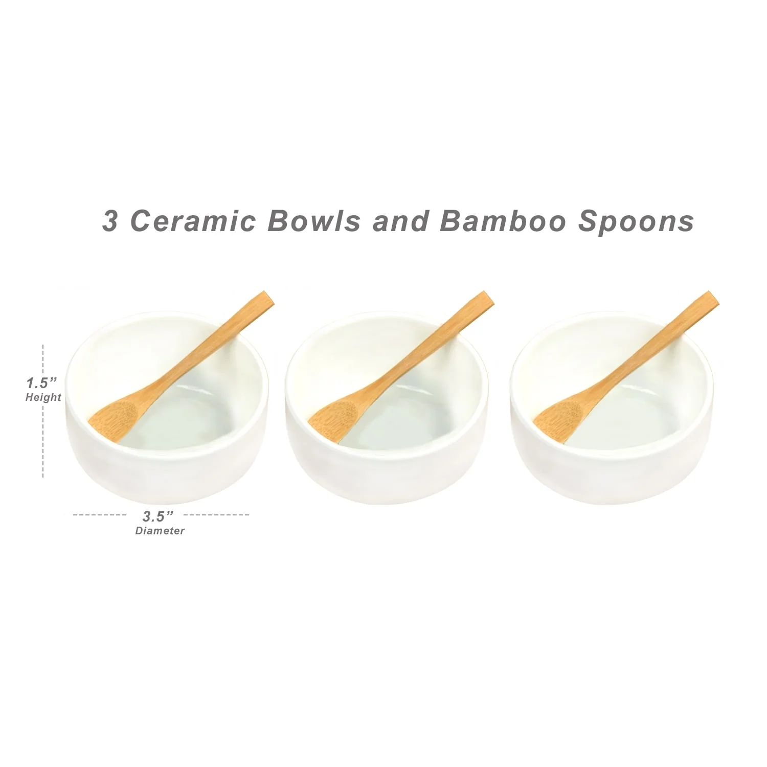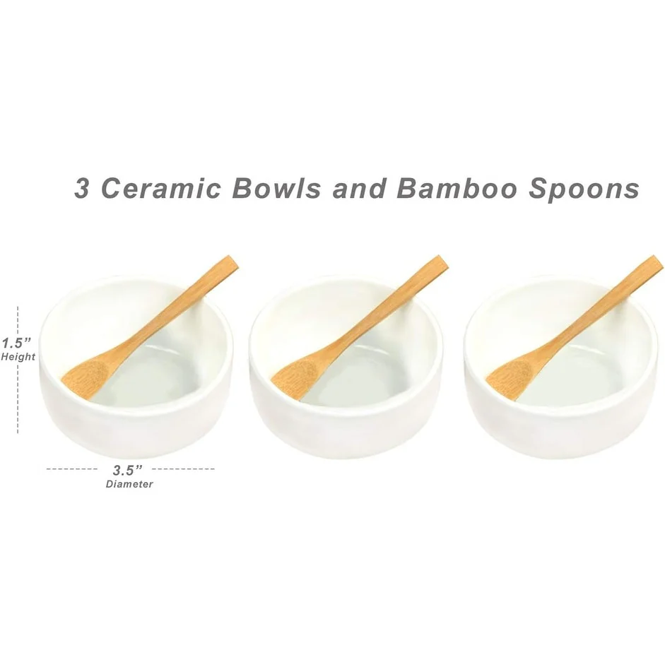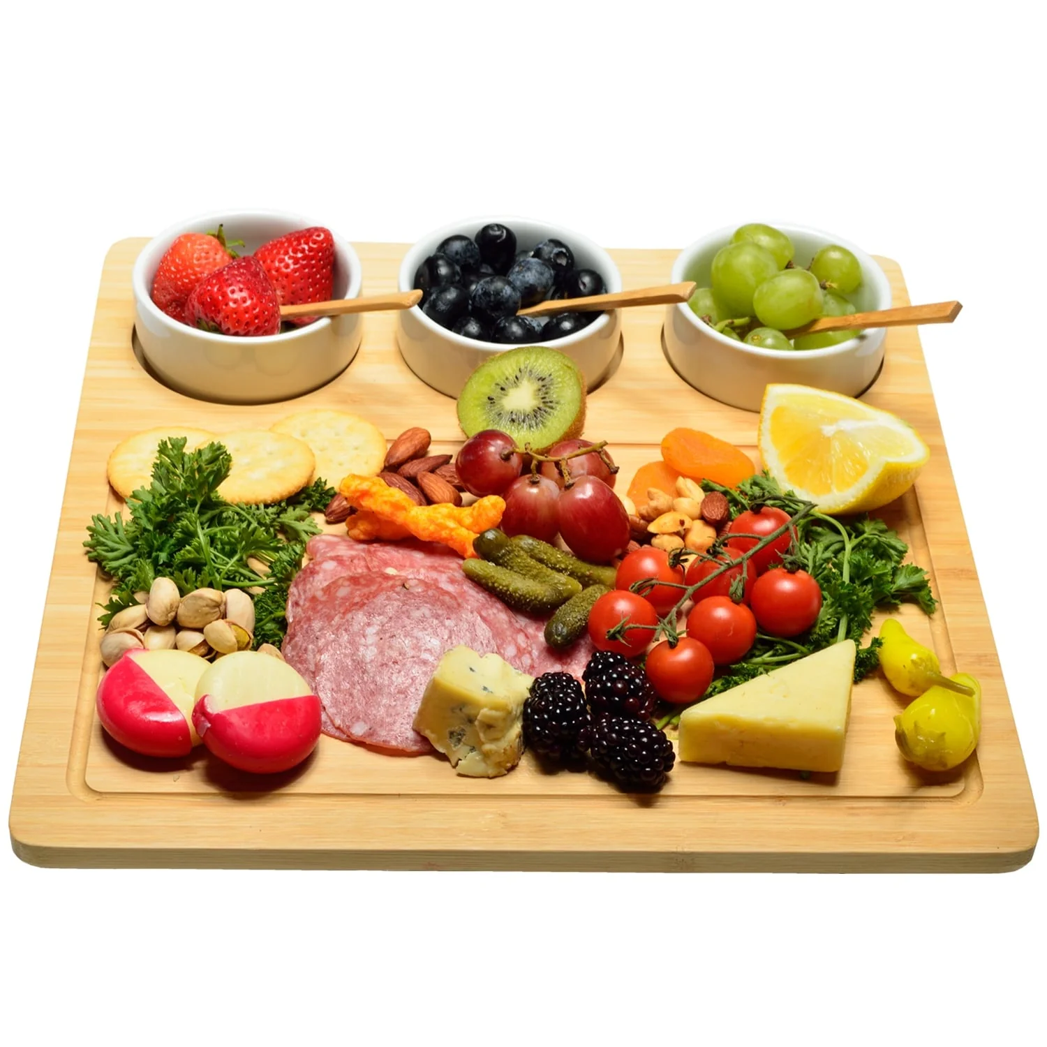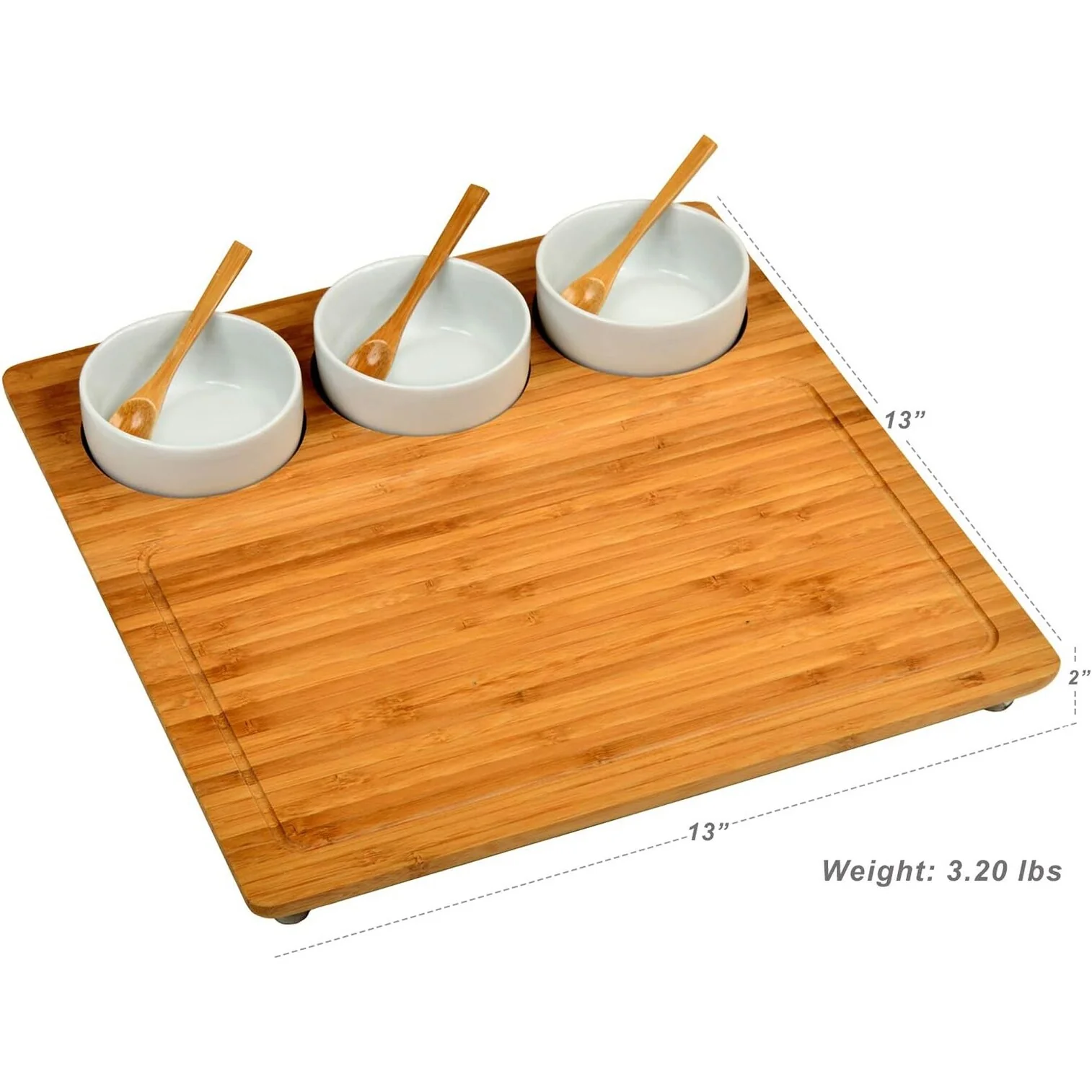 This unique Bamboo Serving Tray includes three removable ceramic bowls and 3 small bamboo serving spoons. The bowls are inset in the board for stability but are removable to re-fill and/or clean. The board has gracefully rounded corners, a milled juice grove, and permanent clear protective, non-slip feet. It's a great size for a casual party and makes an excellent wedding or welcome gift. Lifetime Warranty.