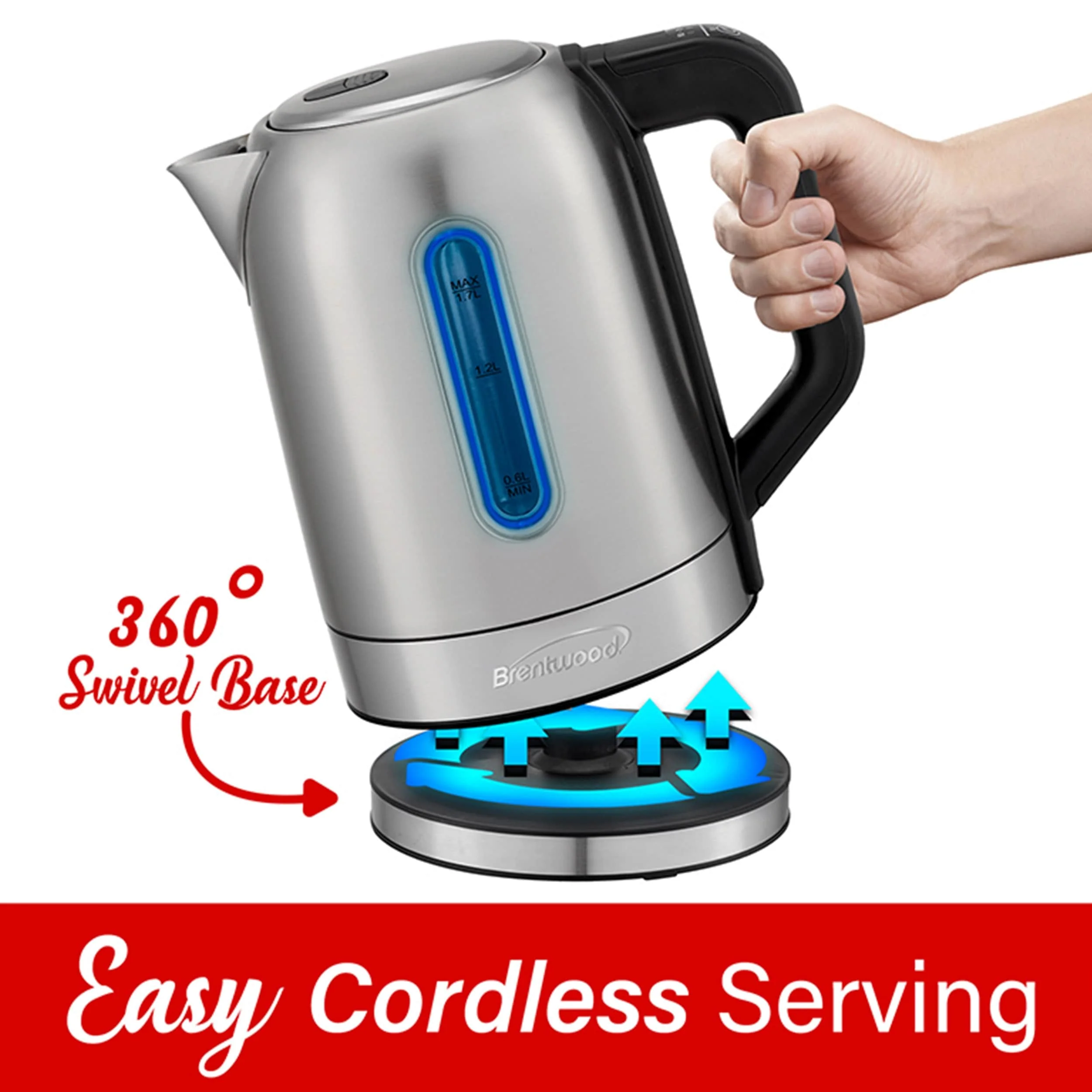 The powerful 1500 watt 1.7L Cordless Digital Stainless Steel Kettle with 5 Temperature Presets heats water faster than a microwave and safer than a stove top kettle. Water boils within minutes with a single push of a button. Use any of the 5 digital presets for precise temperatures perfect for green, delicate, white, and black teas, espresso, pour over coffee, French press, and instant foods like oatmeal, noodles, and more. Gorgeous blue LED lights up the glass kettle while boiling. Cordless kettle lifts off the 360 swivel base for easy filling and pouring. Full glass kettle, concealed heating element and BPA Free parts keeps water free of impurities. Includes boil dry and overheat protection for added safety. Unit automatically shuts off once water reaches a boil.Color: Black, Silver5 Precise Temperature PresetsQuickly Boils in Minutes7 Cups / 1.7 LitersBlue LED Power Indicator LightEntirely BPA FreeConcealed Heating ElementStainless Steel Hot PlateCordless OperationSwivel BaseCord Storage Under BaseBoil Dry & Overheat ProtectionIncludes: Stainless steel kettle with electric baseItem Dimensions: