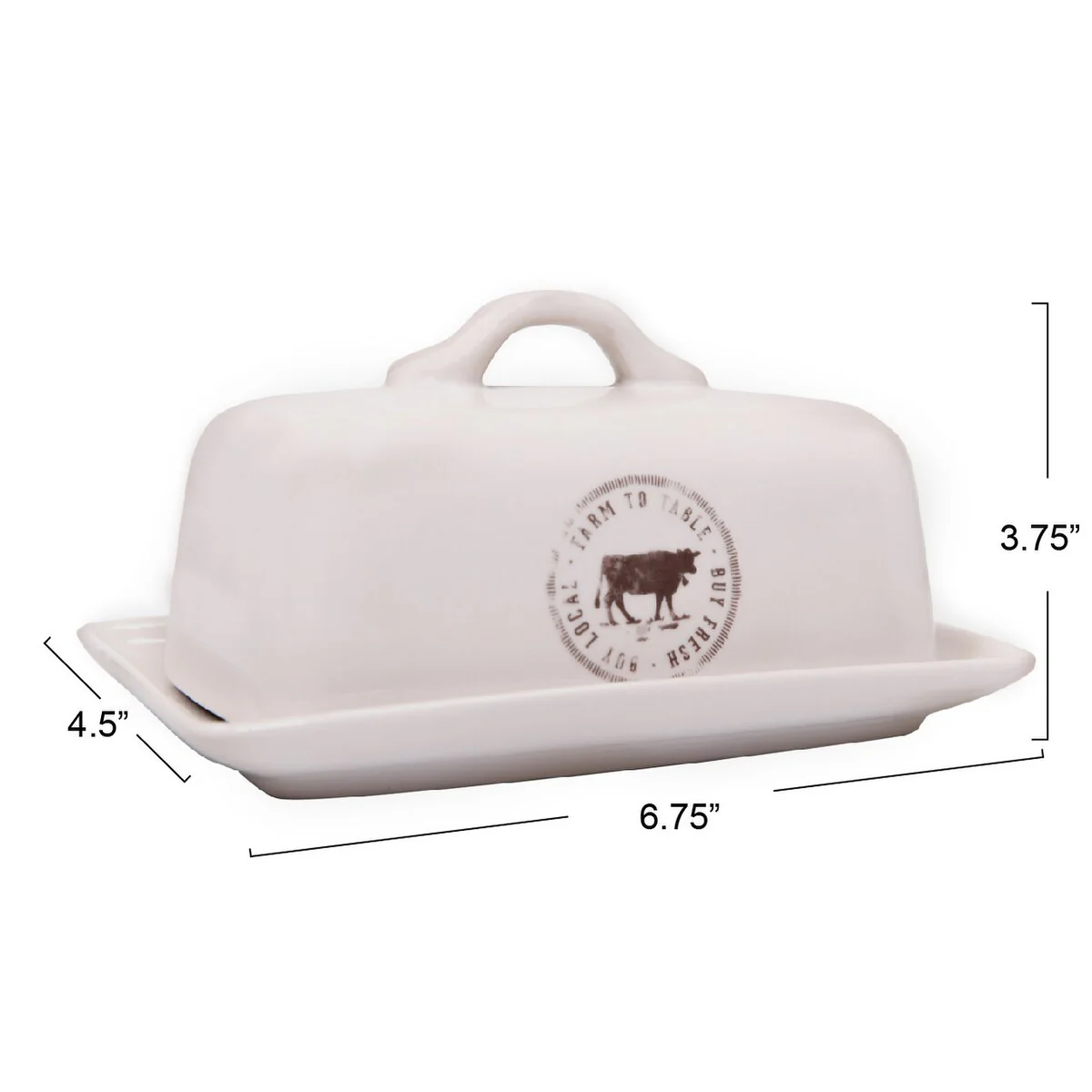 - This country-inspired, stoneware butter dish features a classic silhouette finished with a 'farm to table - buy fresh - buy local' stamp around a cow illustration