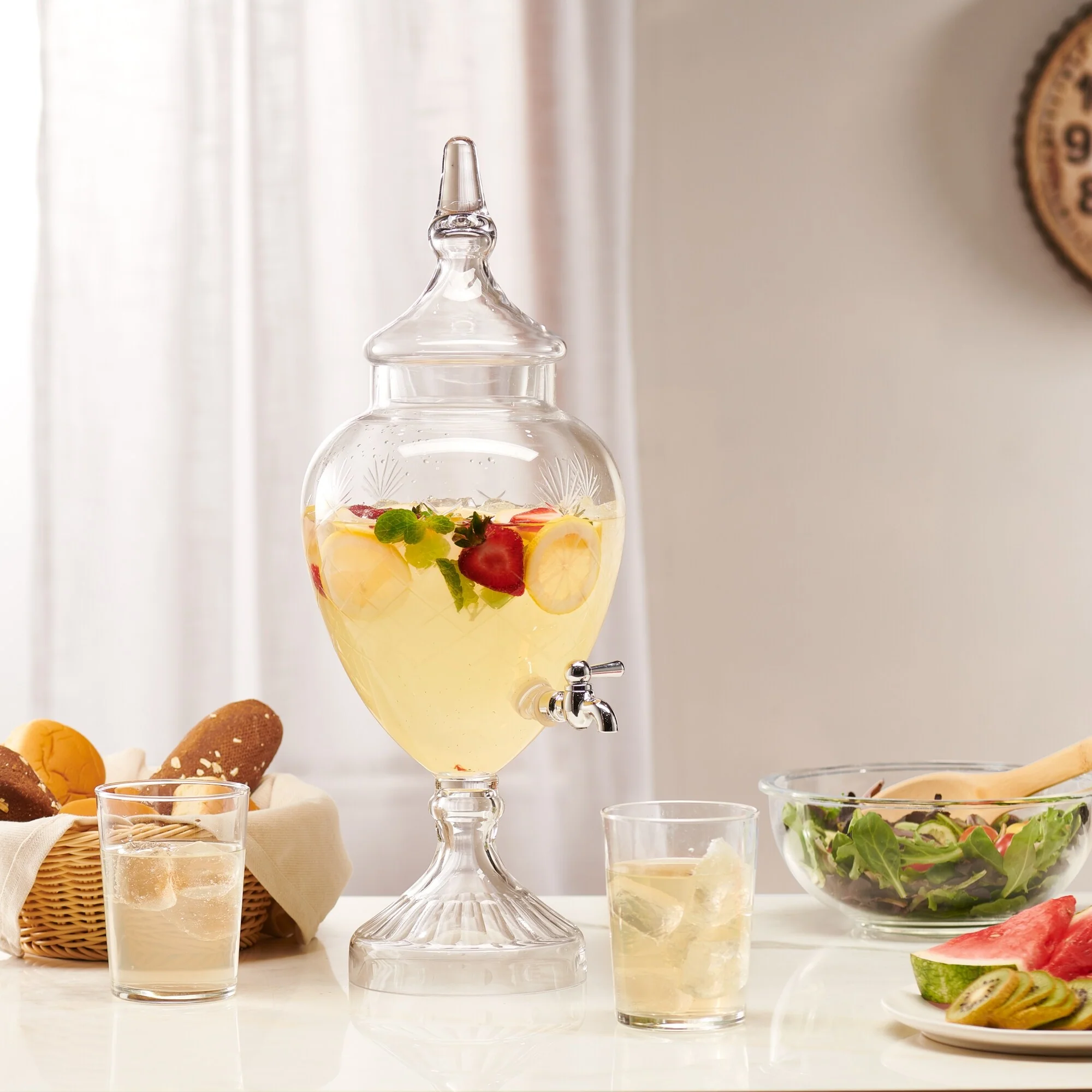 From sweet tea to freshly-squeezed lemonade and fruit punch, this 1 gallon Fifth Avenue Crystal Provence glass beverage dispenser makes serving eye-catching refreshments effortless! The sleek silver-colored spout on this non-insulated dispenser allows for easy dispensing so your patrons can conveniently serve themselves.Use this dispenser for your hotel breakfast bar, party, or event, and it's great for either casual or formal occasions.Made of durable glass with stylish etched detailing around the bottom of the container, this timeless piece is perfect for showcasing your colorful beverages.Simply lift the handle on the decorative, tiered lid to refill drinks or add sliced fruit for an infusion of flavors. Use this beautiful piece to enhance the look of your beverage service and serve your popular beverages in style!