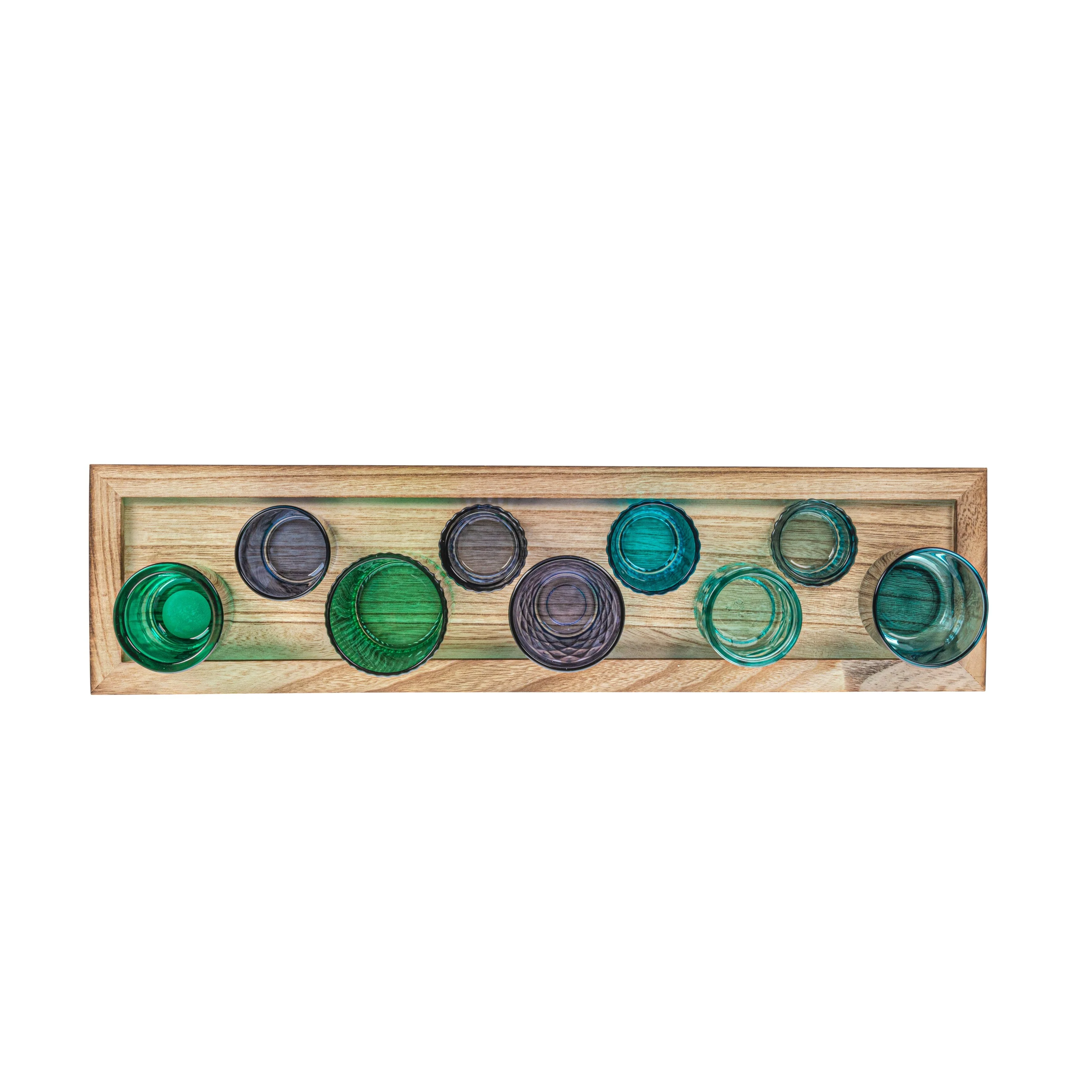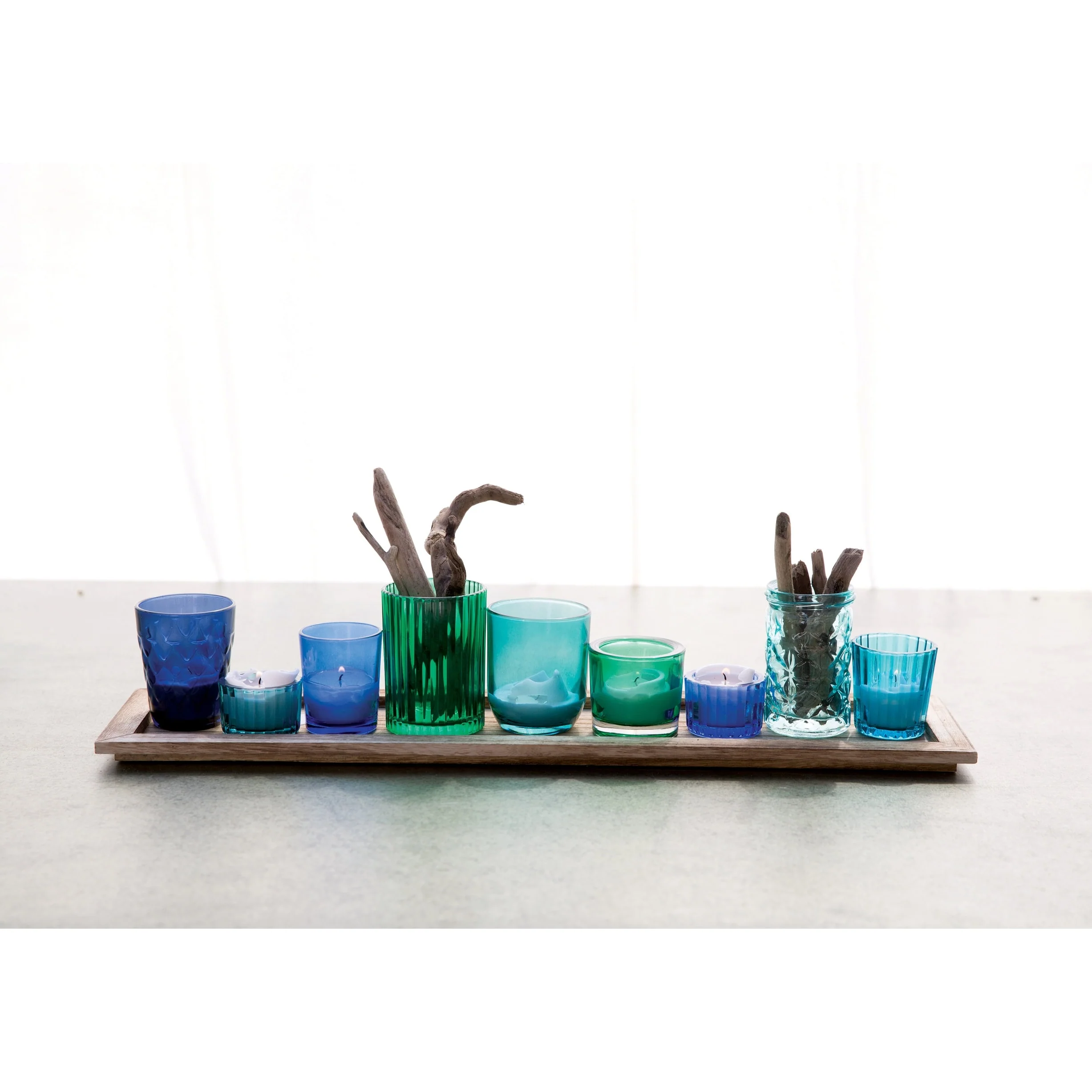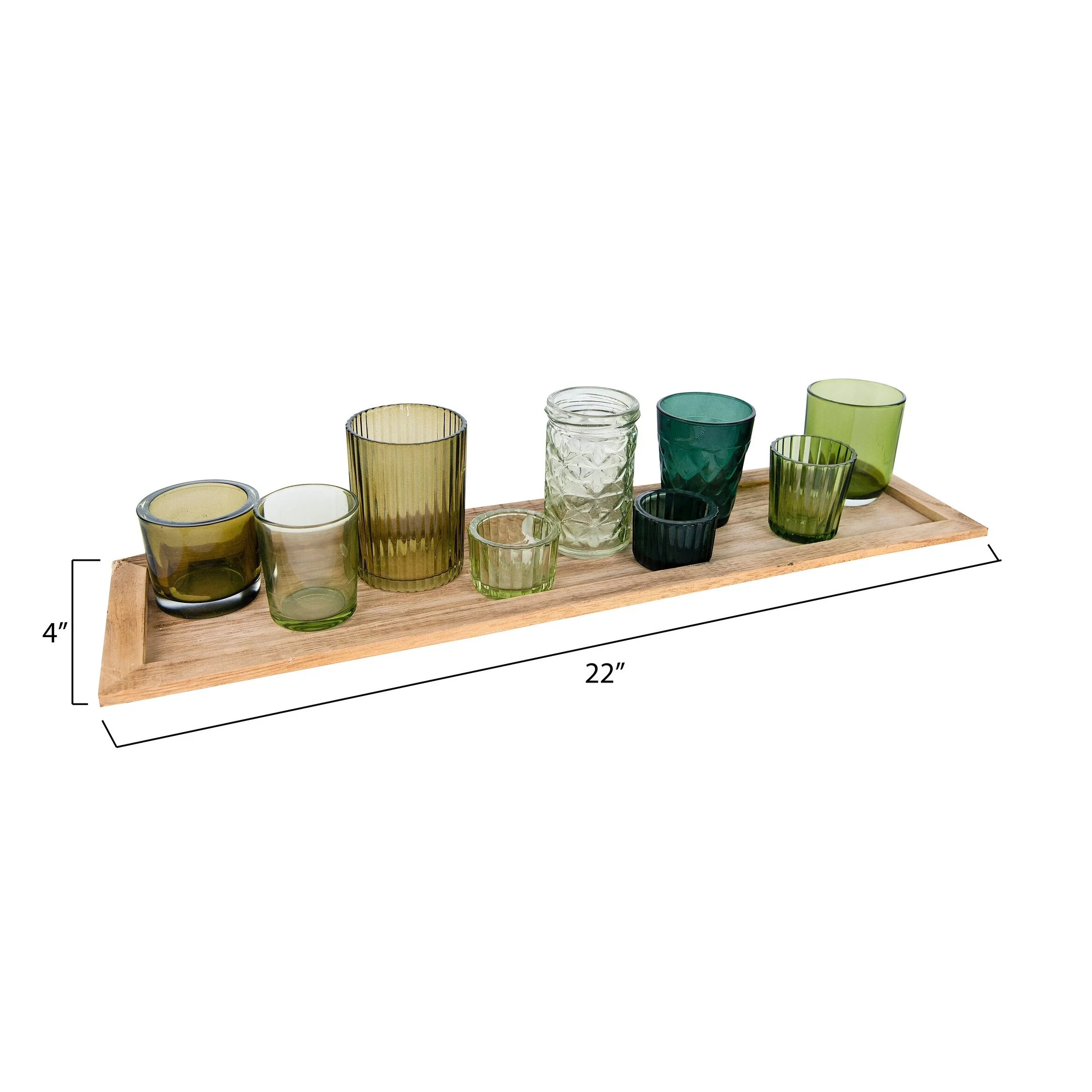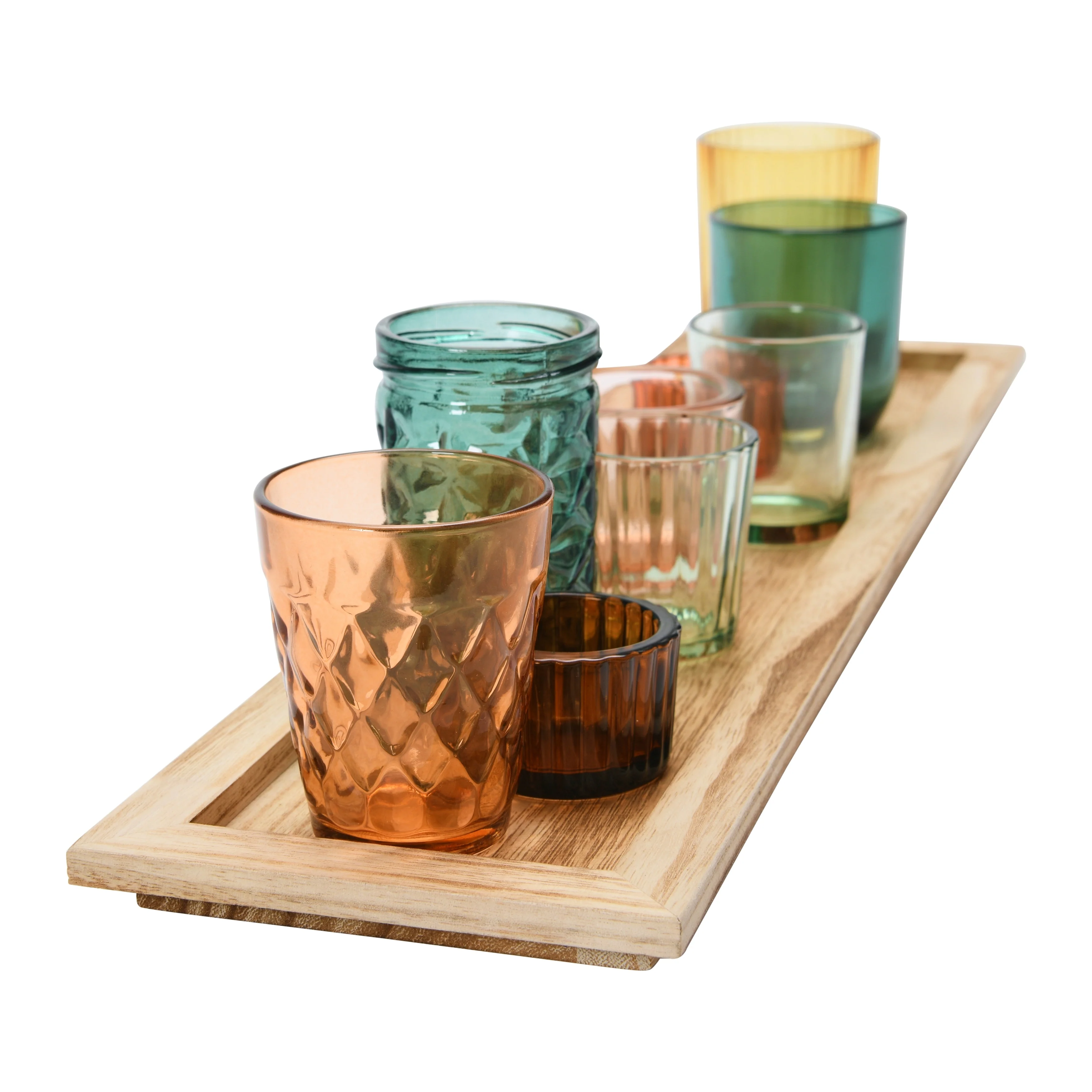 Illuminate the home with this set of glass votive holders on a wood tray. This set features 9 glass votive holders that have different sizes, shapes, and hues, creating a unique and vibrant look. The glass votive holders can hold one tea light candle each (not included), which creates a cozy and romantic atmosphere. The wood tray is made of solid paulownia wood that has a natural texture and color. The wood tray is easy to carry and display and adds a touch of rustic and elegant style to any space. Whether used as standalone pieces or with a matching set, these votive holders will be stunning accents for the mantelpiece, dining table, or console table.