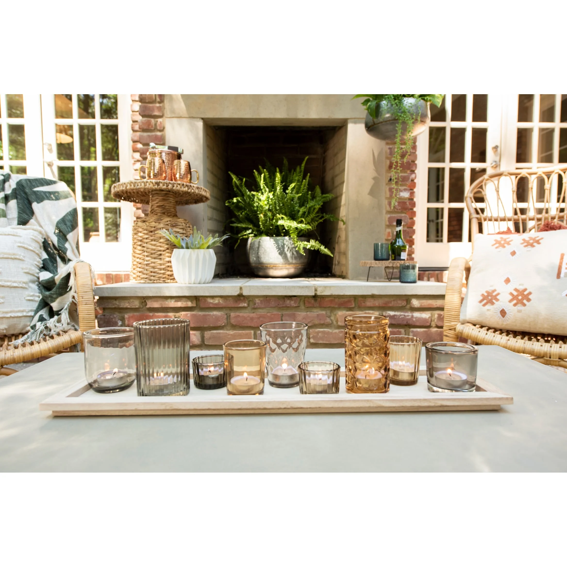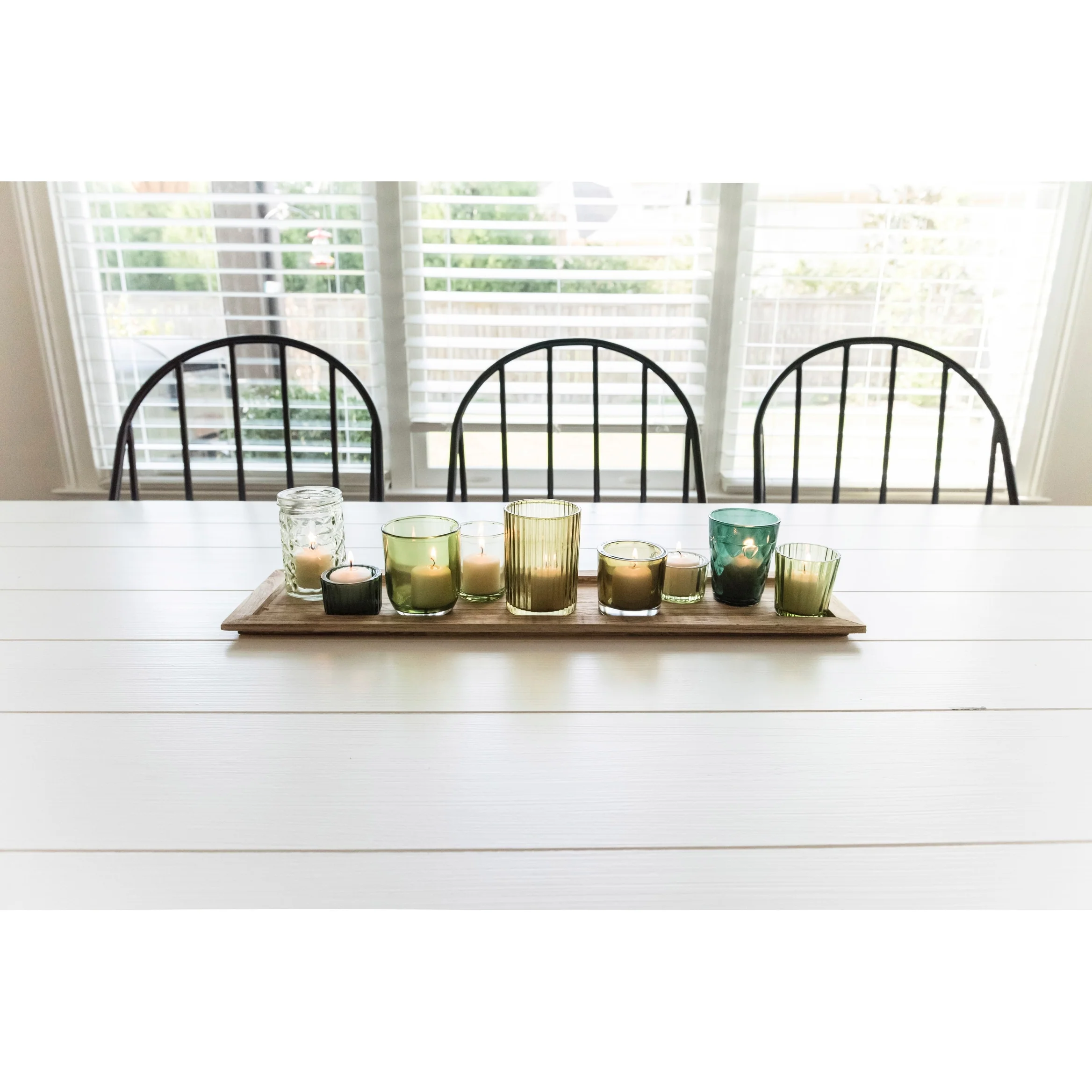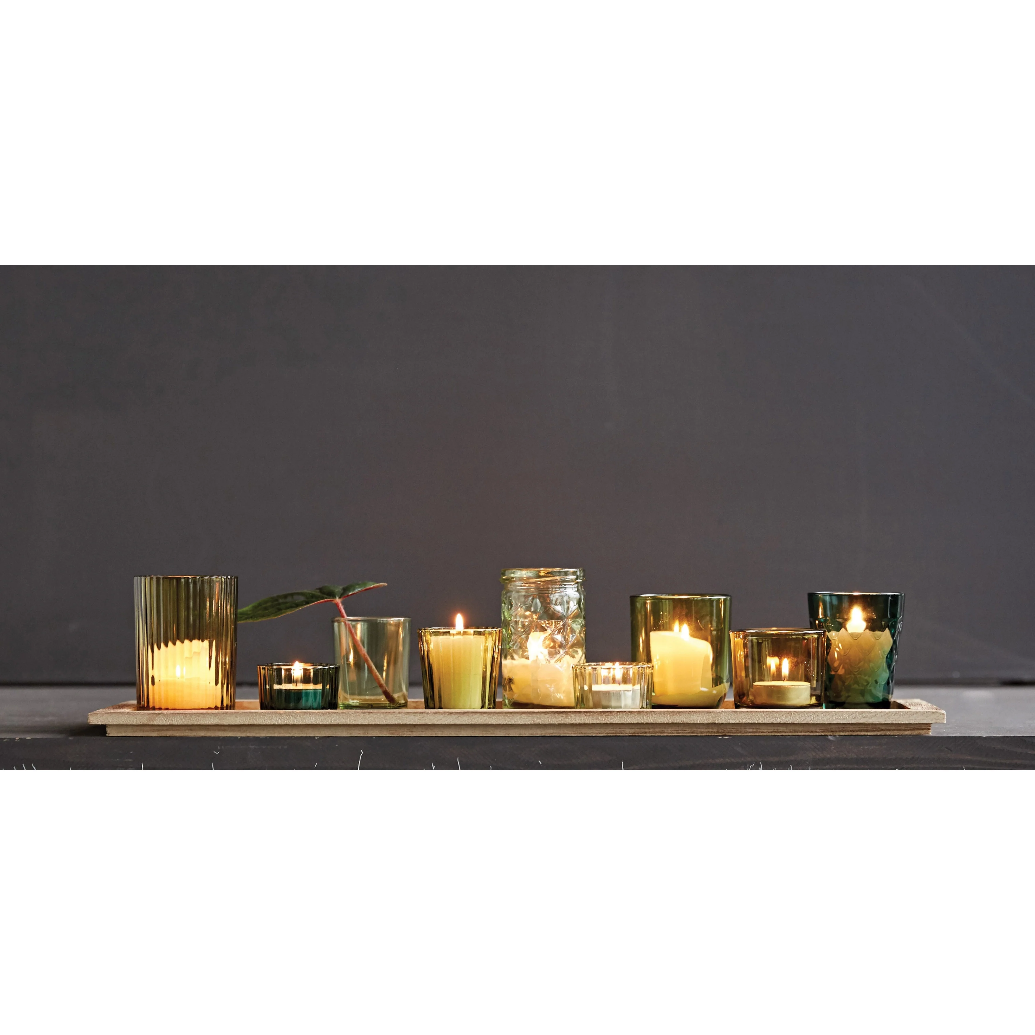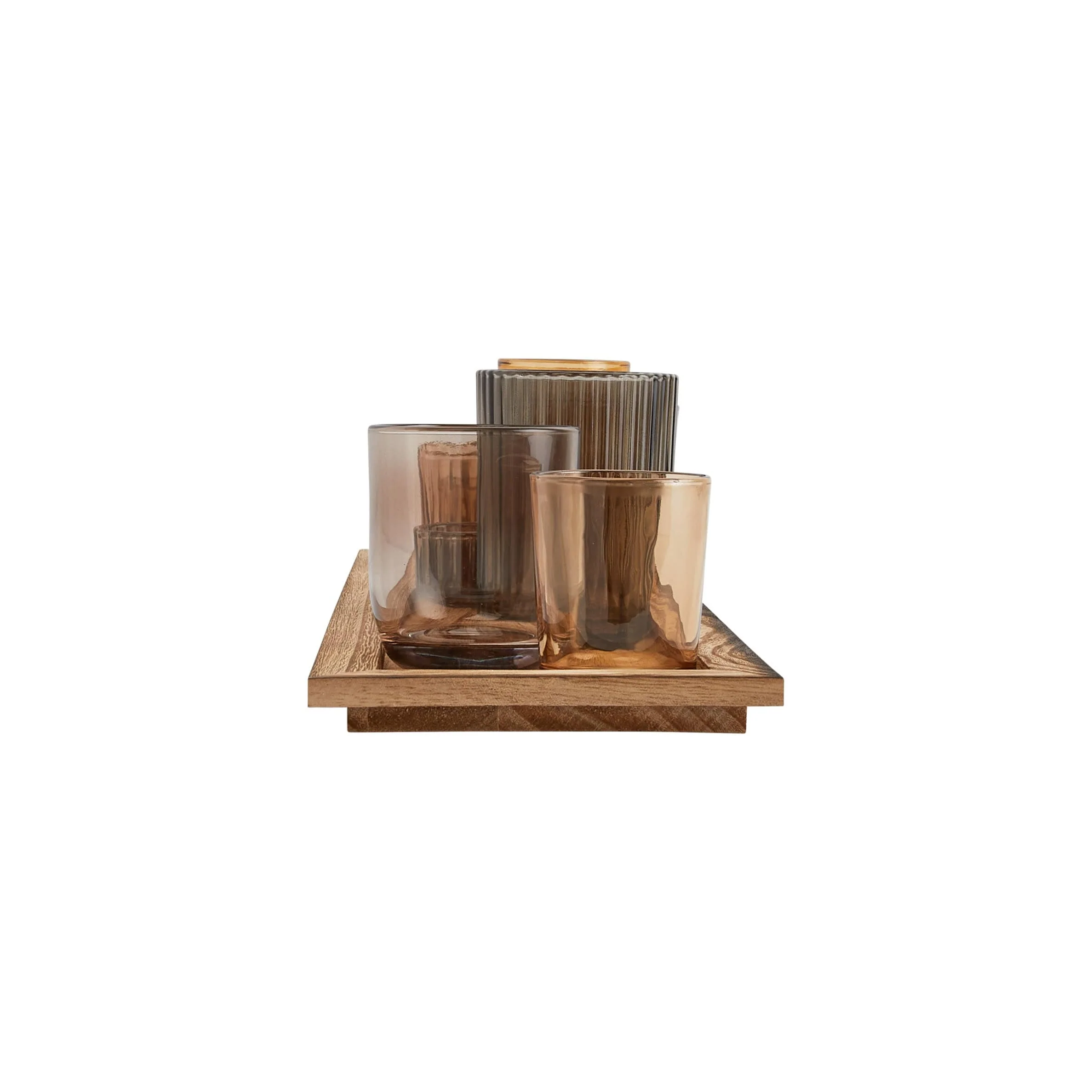 Illuminate the home with this set of glass votive holders on a wood tray. This set features 9 glass votive holders that have different sizes, shapes, and hues, creating a unique and vibrant look. The glass votive holders can hold one tea light candle each (not included), which creates a cozy and romantic atmosphere. The wood tray is made of solid paulownia wood that has a natural texture and color. The wood tray is easy to carry and display and adds a touch of rustic and elegant style to any space. Whether used as standalone pieces or with a matching set, these votive holders will be stunning accents for the mantelpiece, dining table, or console table.