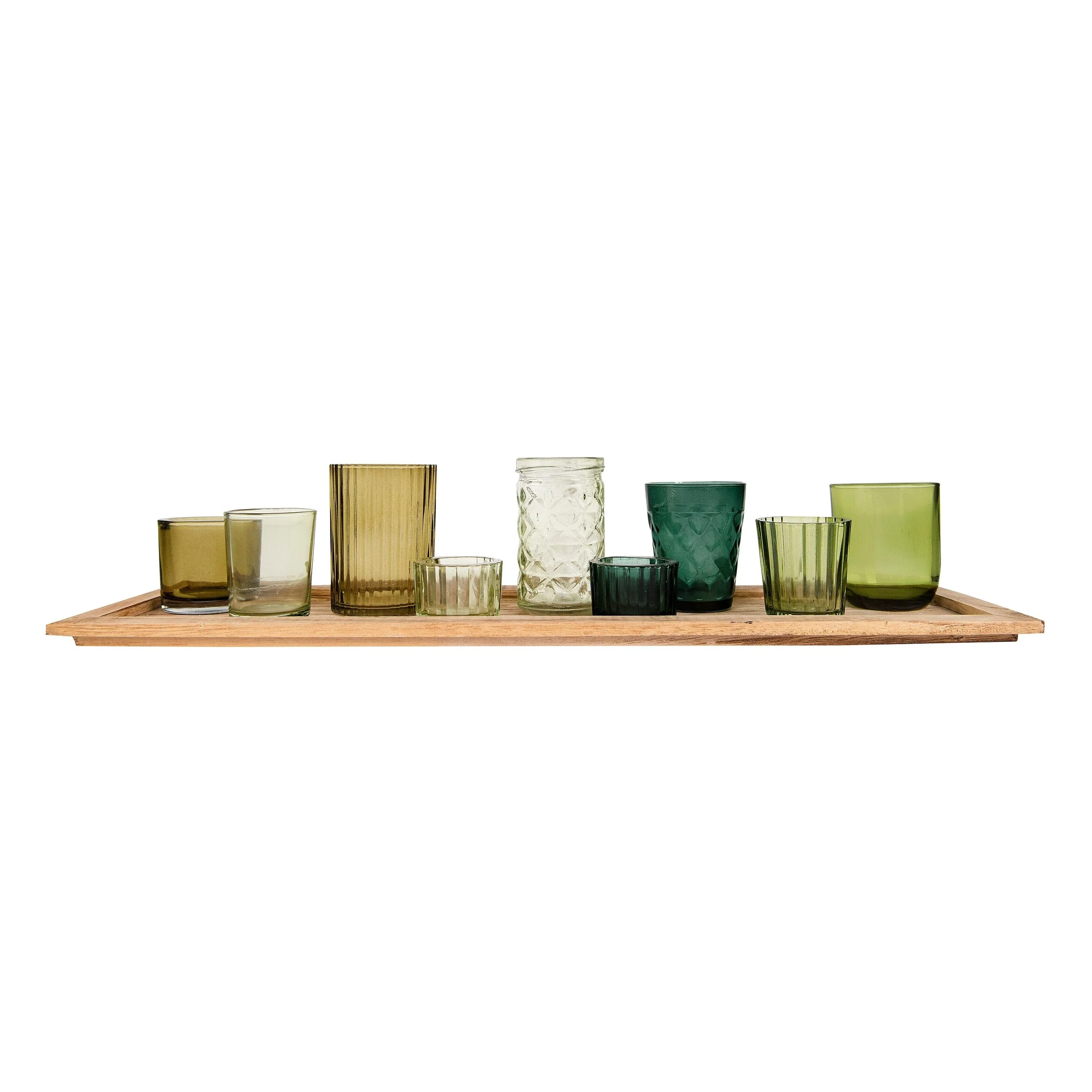 - A set of 9 glass votive holders of varying sizes, shapes, and hues of green and brown on a solid wood tray