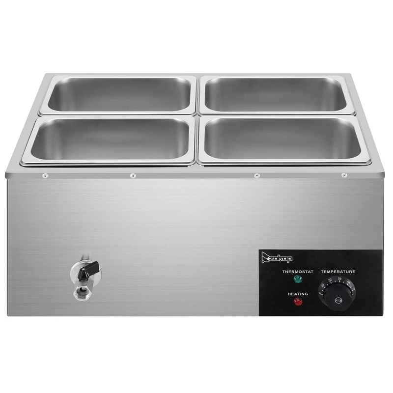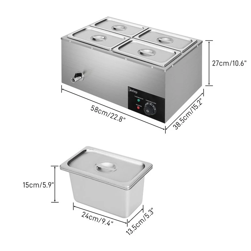 ZOKOP Bain Marie food warmer, including four 1/4 pans (5.3Qt/5L each), is made of thickened food-grade stainless steel, durable, anti-squeezing and easy-cleaning. Constant temperature control (30-85℃/86-185°F) keeps dishes warm as you wish. The catering food warmers are widely used to keep dishes warm, heat up milk and melt chocolate. This is a very cost-effective product, whether it is serving your home or a prosperous business.