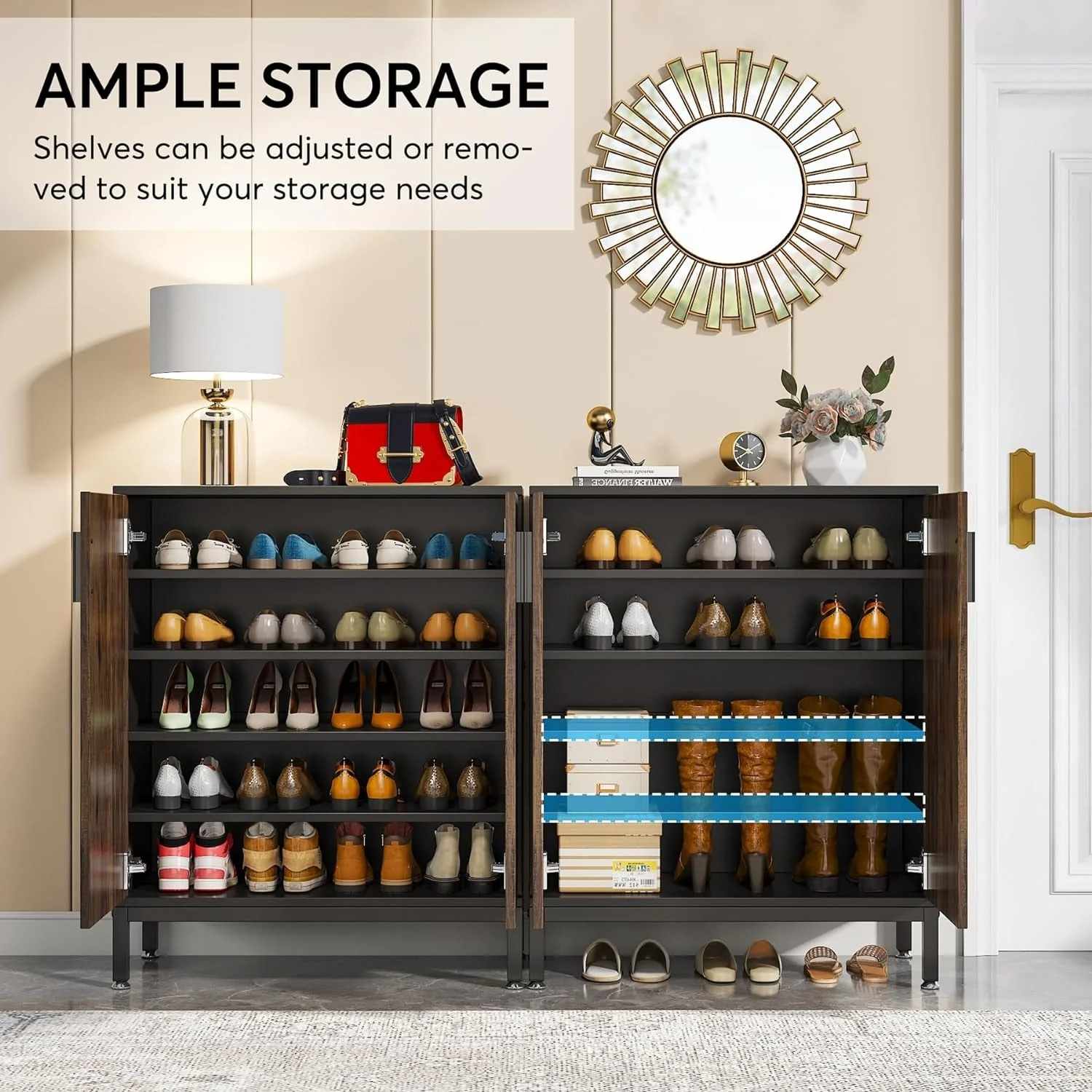 - Our shoe cabinet conceals 5 shelves with storage space for up to 24 pairs of shoes. Adjustable interior shelves can be removed for easy storing of heels, mid-boots, and more.