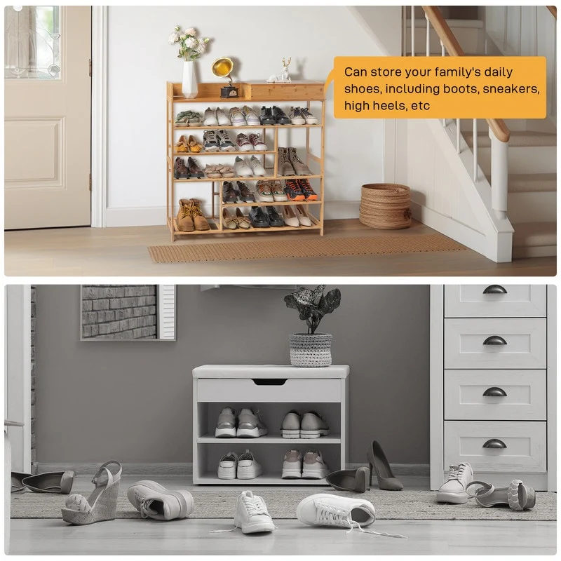 Boots in the entryway, flats, and pumps in four different rooms – if you can never find all your shoes, it's time to start keeping them organized with a piece like this. Perfect for helping organize any entryway, this shoe rack features six tiers of shelving organizing everything from boots to sneakers. And since it's crafted from sustainable bamboo, it's a great option for an eco-friendly accent in your home. This generously sized piece has room for organizing. Suitable for large shoes.