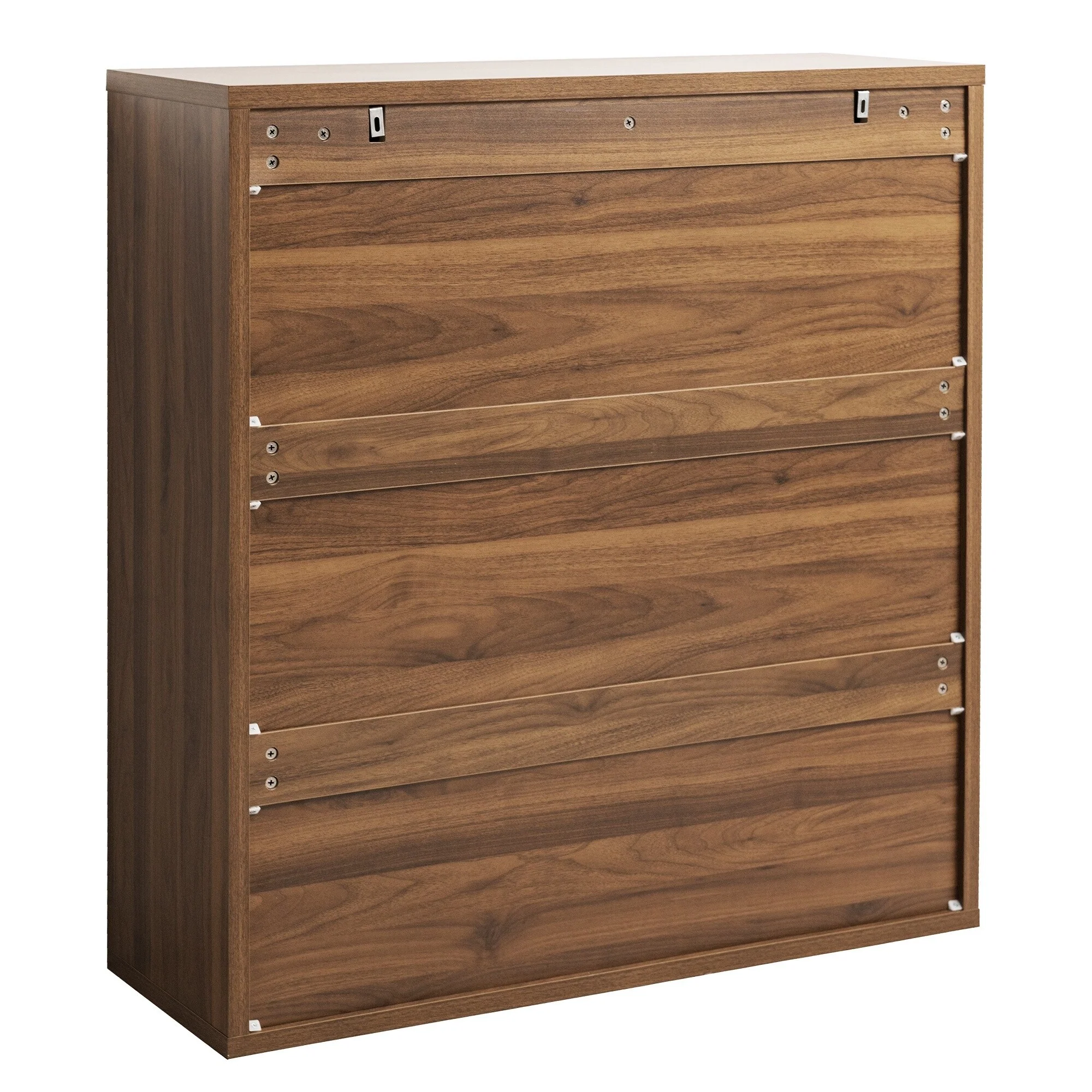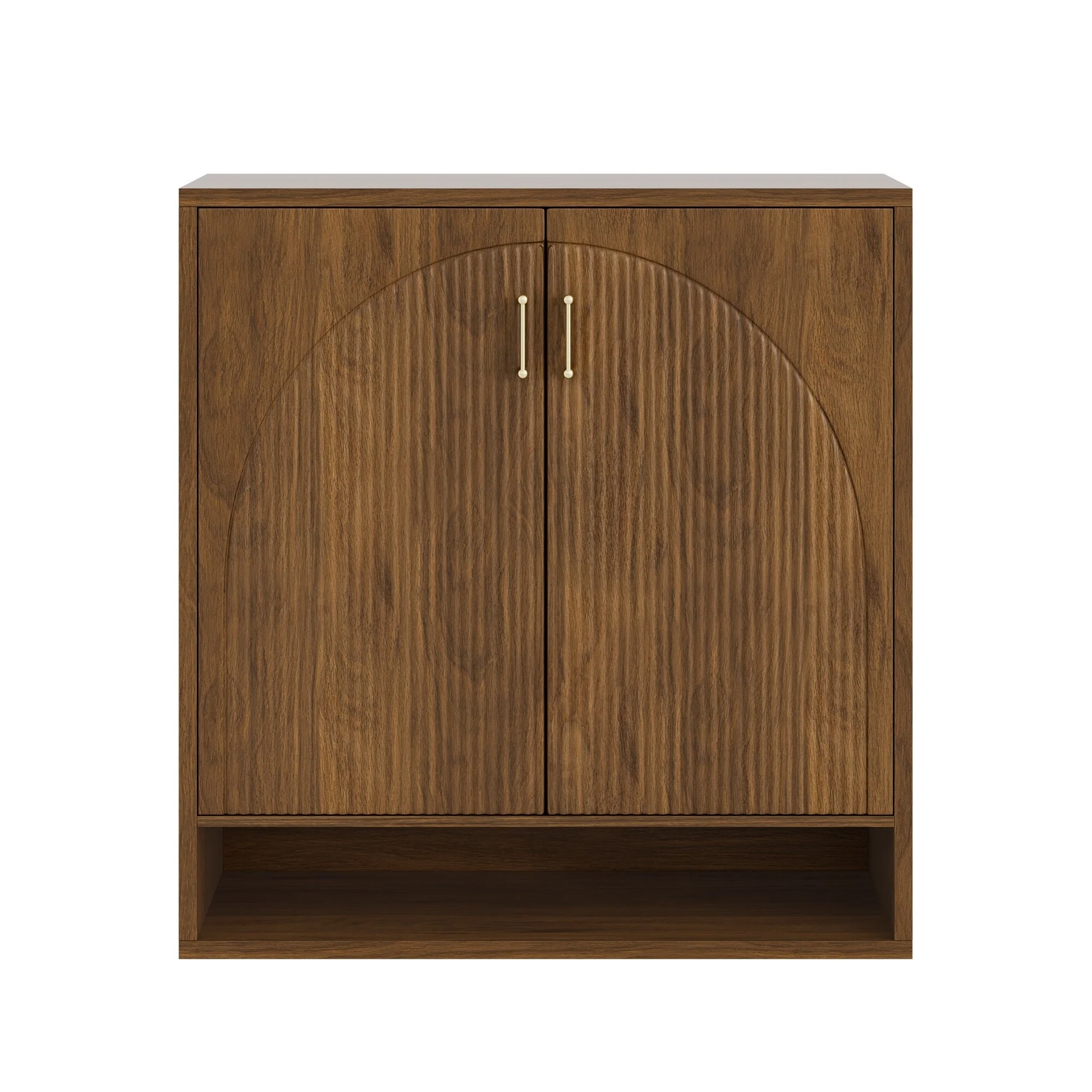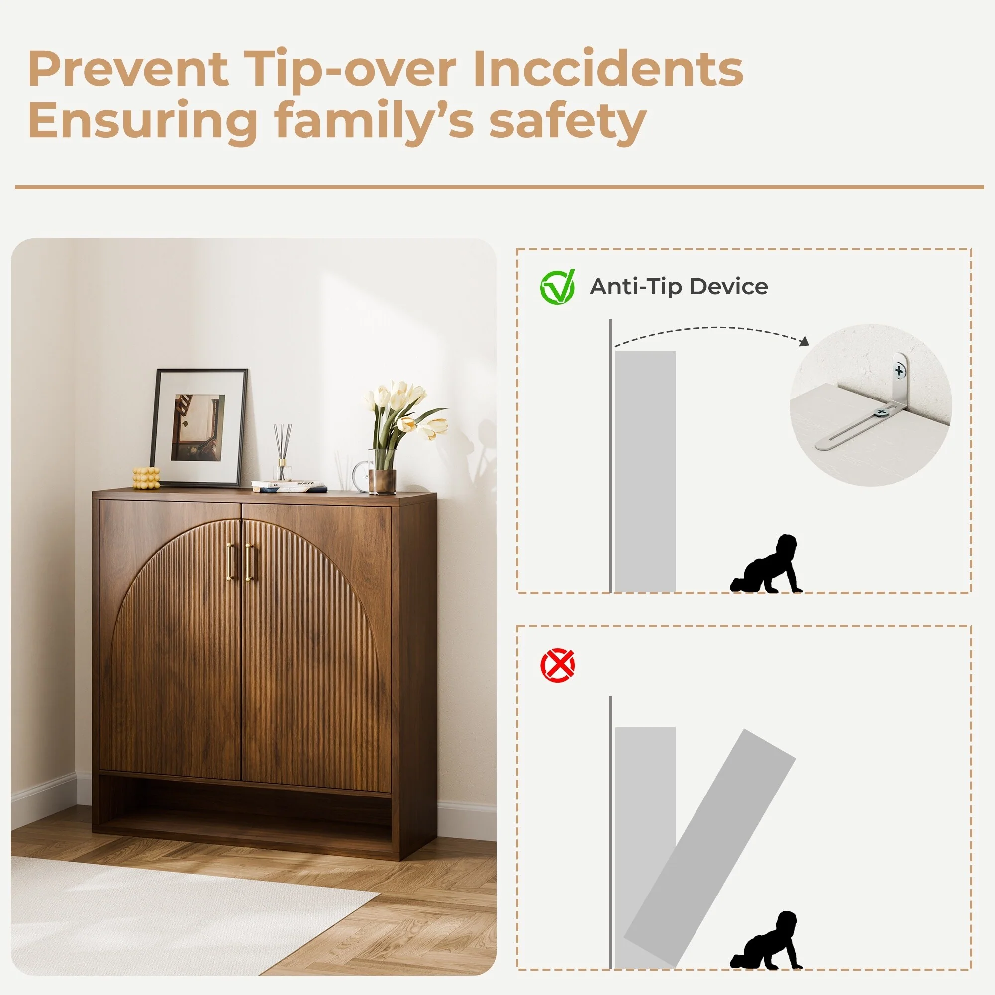 Inspired by mid-century modern aesthetics, this shoe cabinet features a stunning dual-texture finish: a smooth natural wood-grain surface paired with fluted arched door panels for added visual depth and sophistication. Behind its stylish exterior lies a functional storage solution, ideal for decluttering your entryway, hallway, or mudroom. The enclosed cabinet with four adjustable and removable shelves inside lets you effortlessly organize footwear of all heights, from sneakers to tall boots. The lower open shelf offers convenient access to your grab-and-go pairs or extra space for shoe boxes. A fully enclosed back panel helps protect your walls from scuff marks and enhances structural stability. Magnetic doors close softly and quietly, while the sleek gold handles add a modern, elegant accent. Beyond shoe storage, this cabinet works beautifully as an entryway console, sideboard, or office bookshelf, perfect for organizing books, dinnerware, collectibles, or board games.