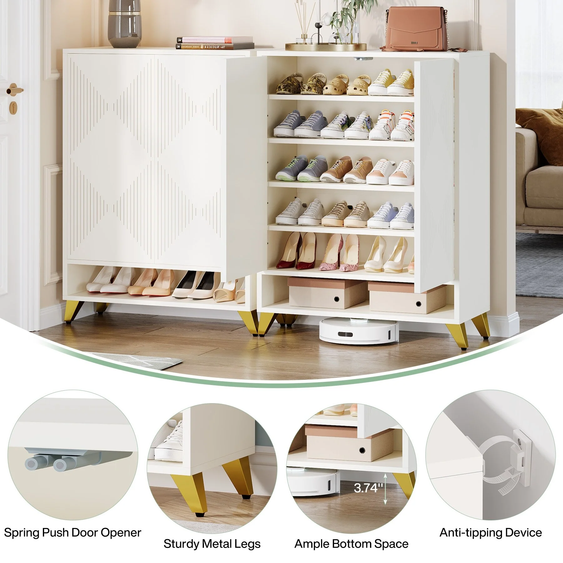 This chic entryway shoe rack cabinet features a distinctive geometric pattern and a rebound opening system. Crafted from premium MDF and metal, it includes a 5-tier hidden shelf and an open shelf. Adjustable shelves cater to varying shoe types. It's an attractive and practical addition to your décor, merging style, practicality, and longevity.