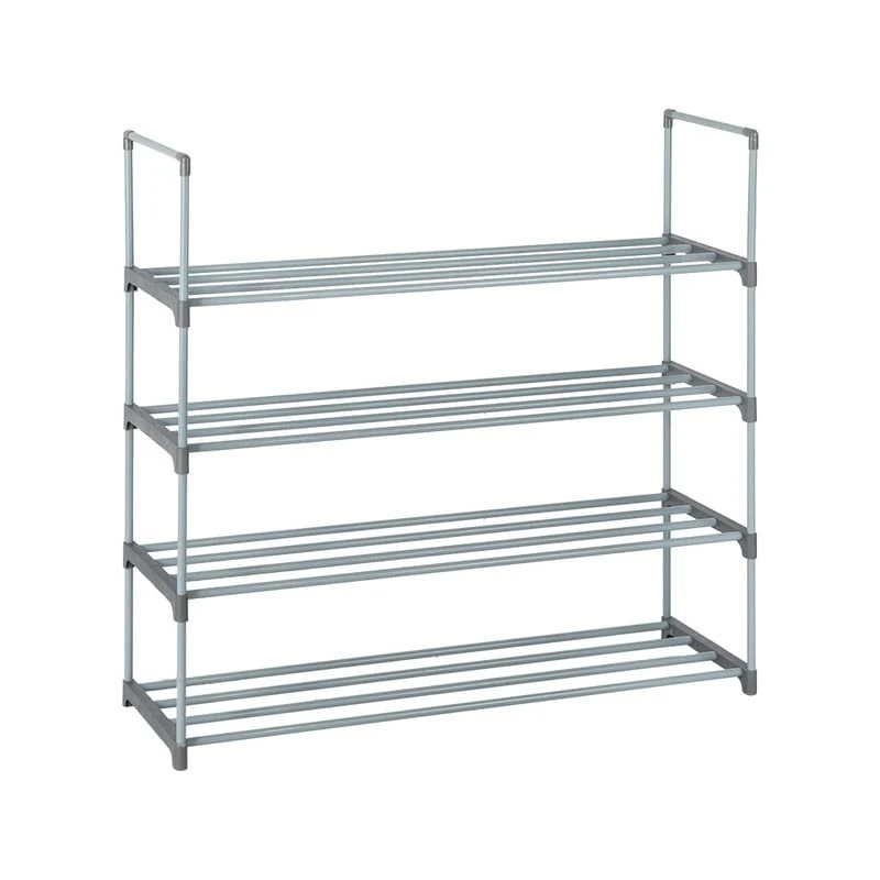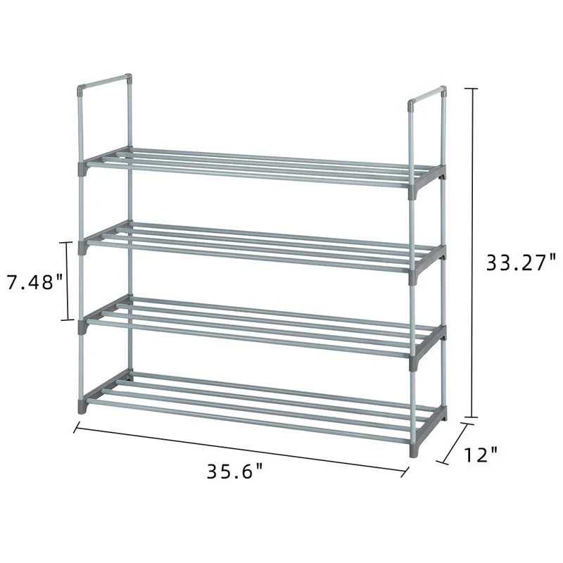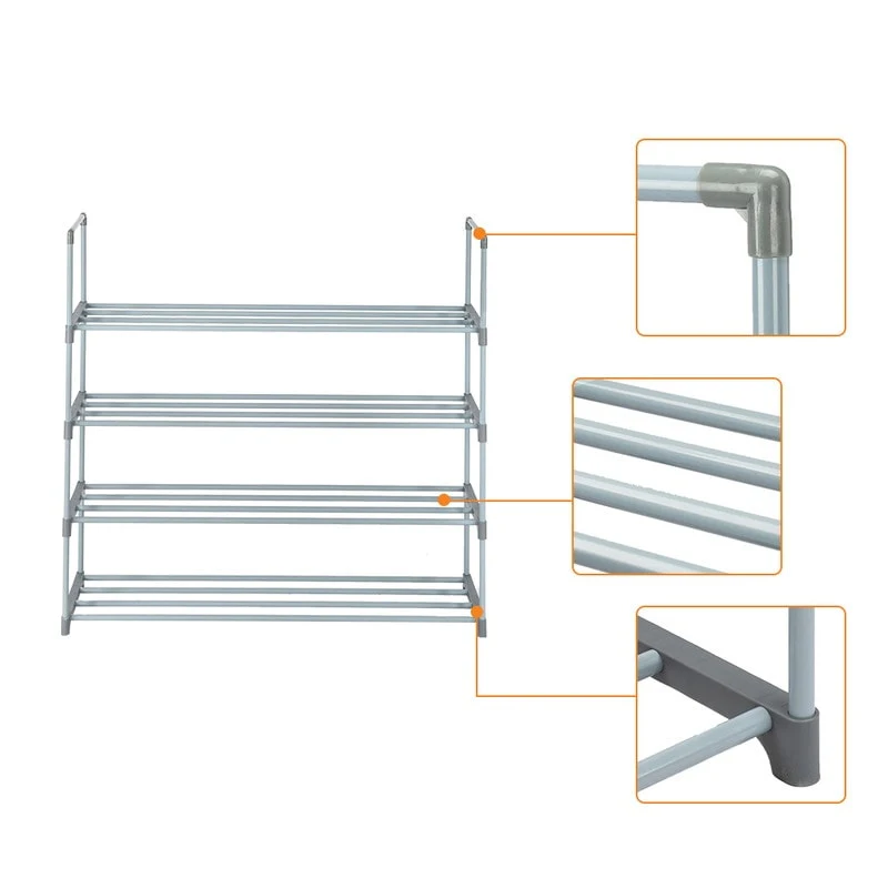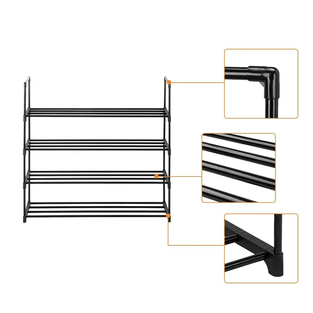 Made of powder-coated metal tubes and high-quality plastic parts. The diameter of the metal tube is 13.2mm, which enables this shoe rack to load much heavier duty and more durable while using. And the powder-coated finish does not rust or corrode with normal use. Fit about 4 or 5 pairs on each shelf. Totally 4-tier shelf can store 16 pairs of mens' shoes and sneakers or 20 pairs of heels. The distance between each tier is 19cm, which makes it ideal for regular shoes. And space is big enough between levels to fit size 11 basketball high tops. You can also store jackboots, boots, etc on the top shelf without worrying about falling off. Order 1 to install a 4-tier shoe rack, or buy two sets to stack an 8-tier shoe rack, or split 1 set of 4-tier shoe racks into 2 sets of 2-tier shoe organizers. Add great organization and reduce shoe clutter while being elegant at the same time. Perfect storage solution for your entryway, foyer, wardrobe, closet, dormitory, patio, cabinet, garage, etc.