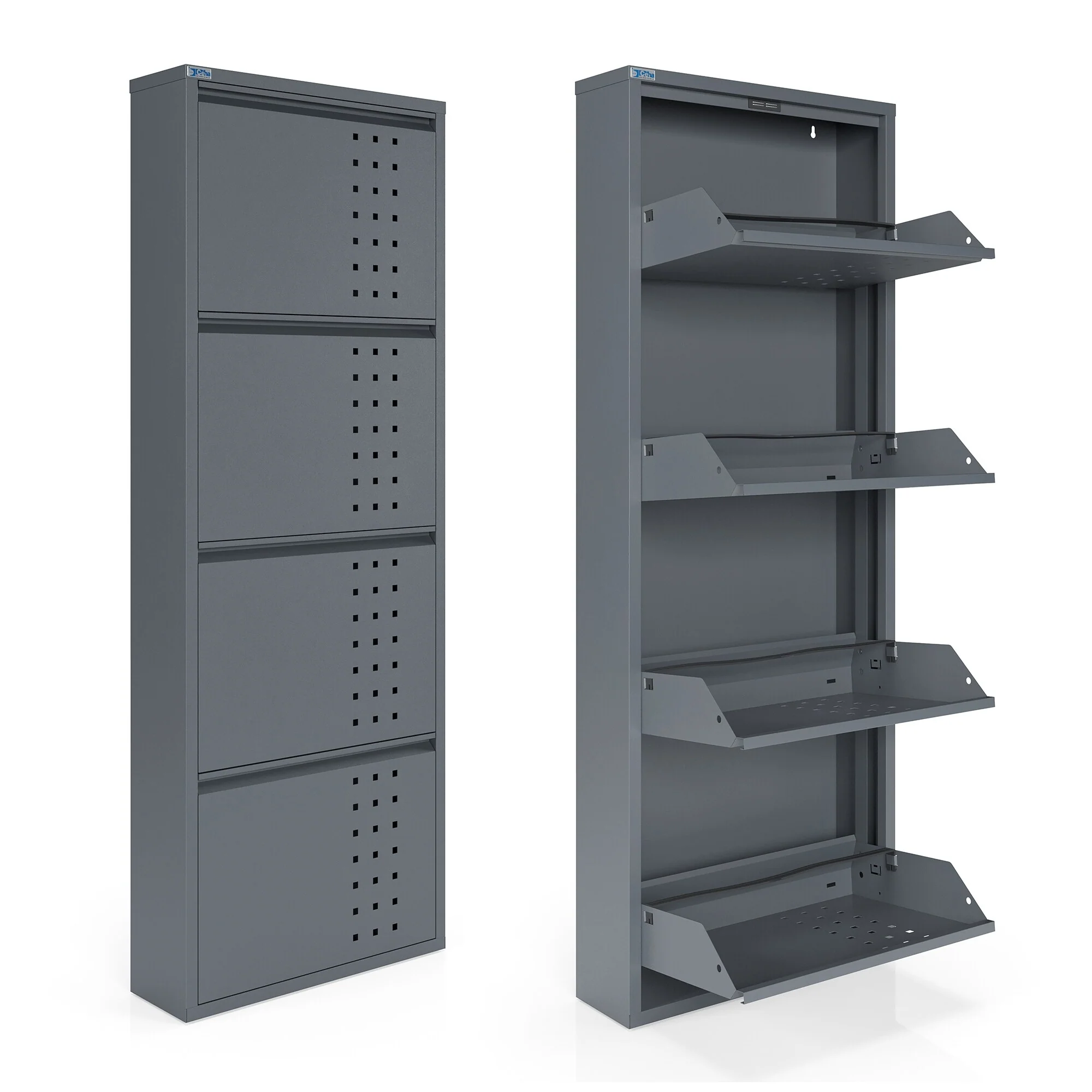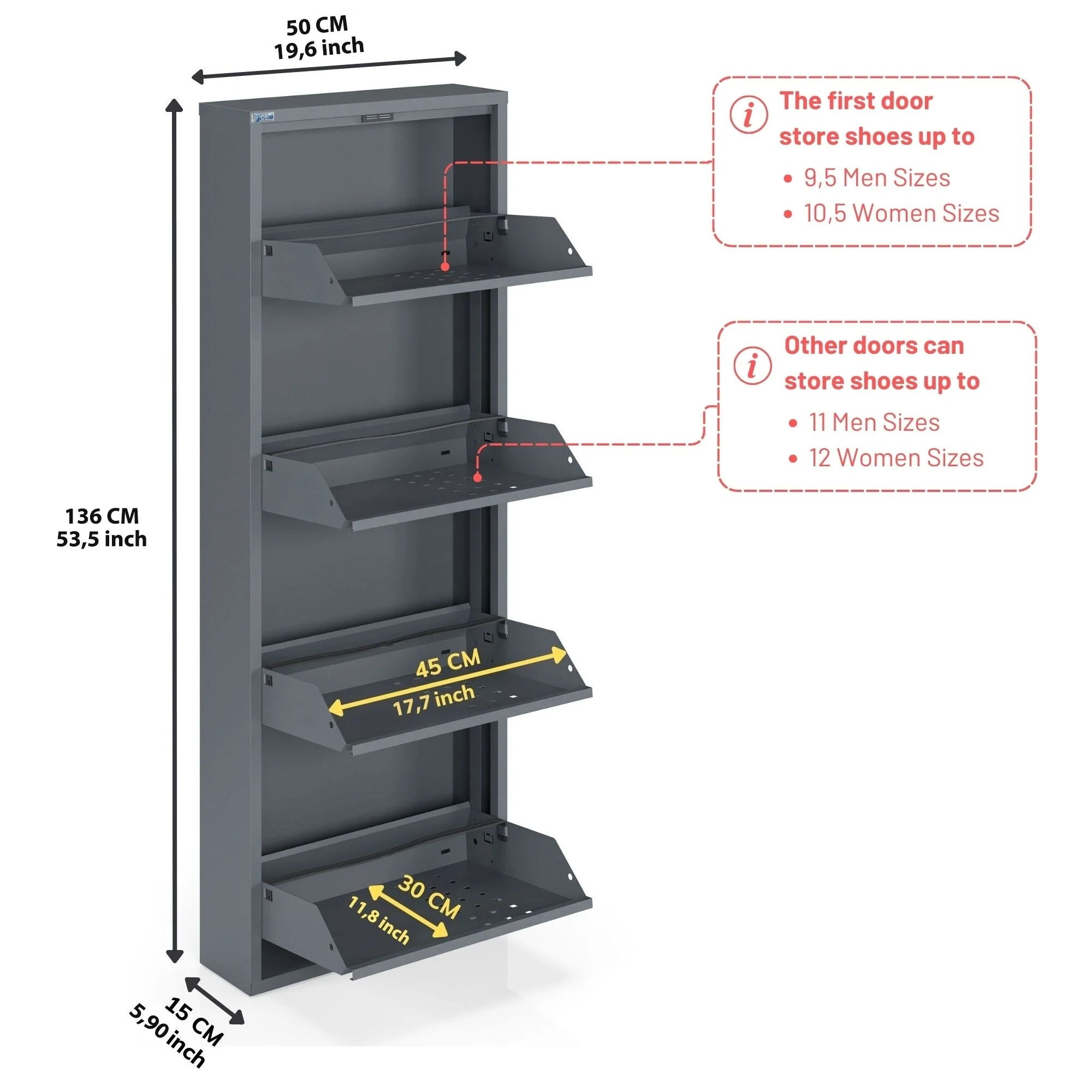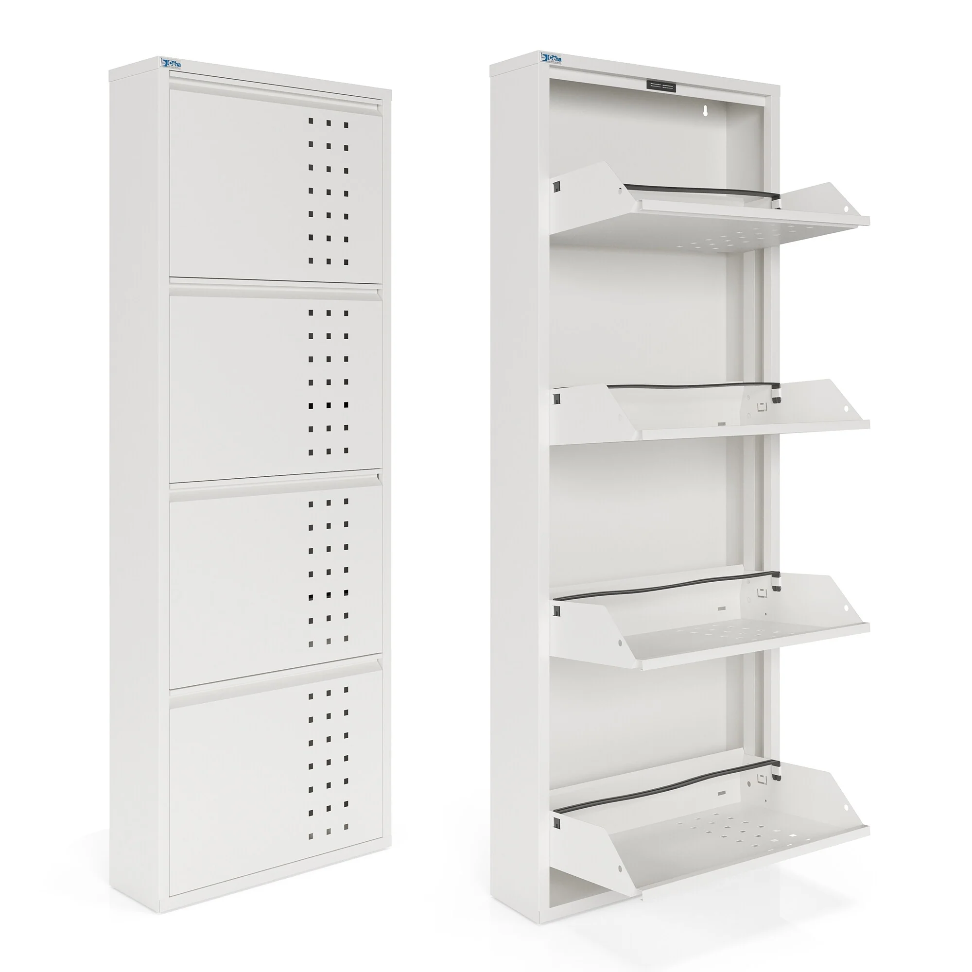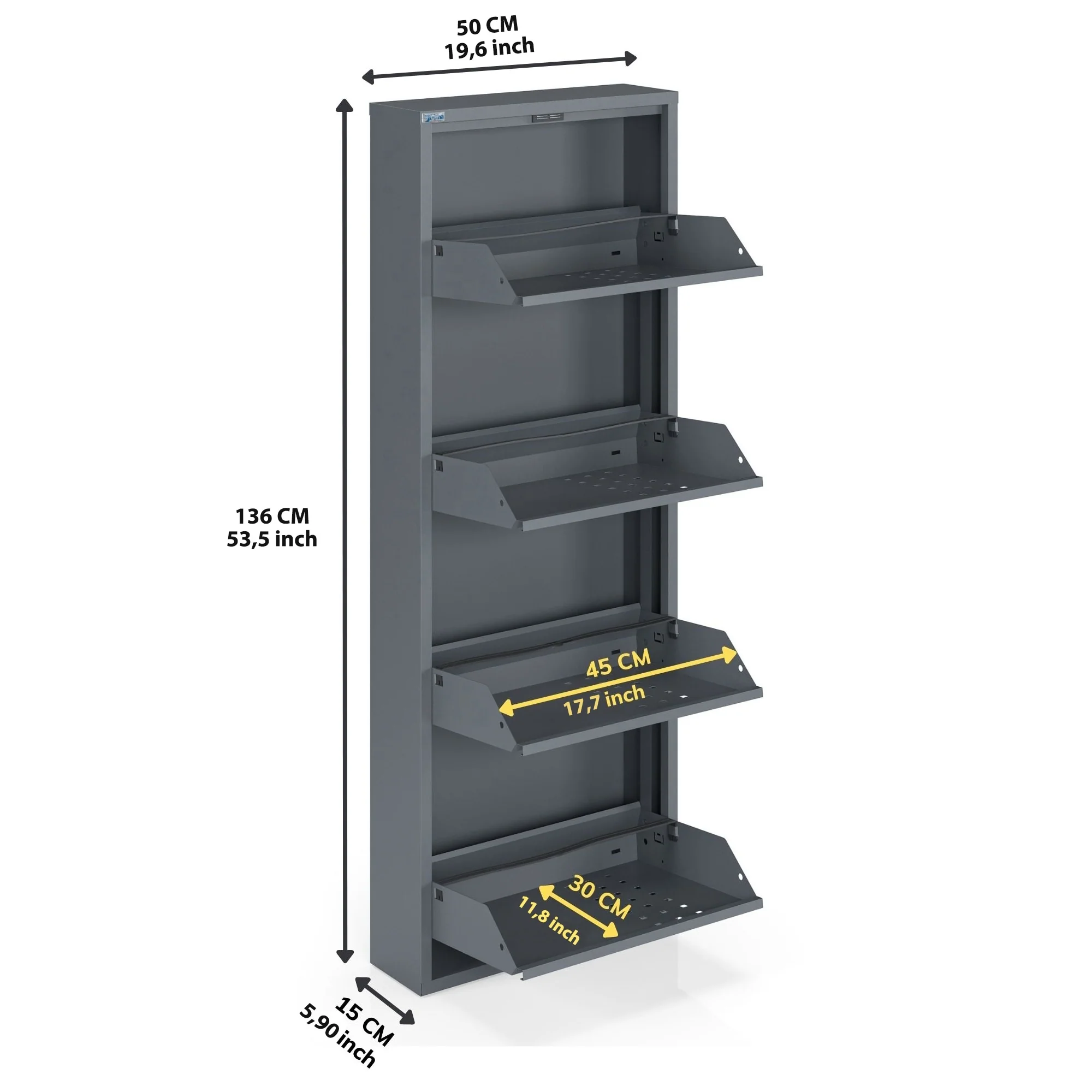 Introducing the CEHA 4 Tier Metal Shoe Cabinet with Cover the ultimate shoe storage solution for your home! This shoe rack shelf closet is designed with fully welded strong construction and coated with epoxy-polyester powder to ensure durability and longevity. It features integrated handles and magnetic latches allowing you to access your shoes and keep them organized quickly. The cabinet's four tiers provide ample storage space with each drawer capable of holding up to two pairs of shoes. The square holes on the front of the cabinet provide airflow and prevent your shoes from getting damp or moldy making it ideal for use in humid environments such as bathrooms or garages. It can be used in various settings including closets, bedrooms, entryways, and even garages. With holes on the back, you can save even more space by mounting it on the wall. It comes with a 2-year warranty (excluding wear parts) giving you peace of mind that you are making a smart investment in your shoe storage.