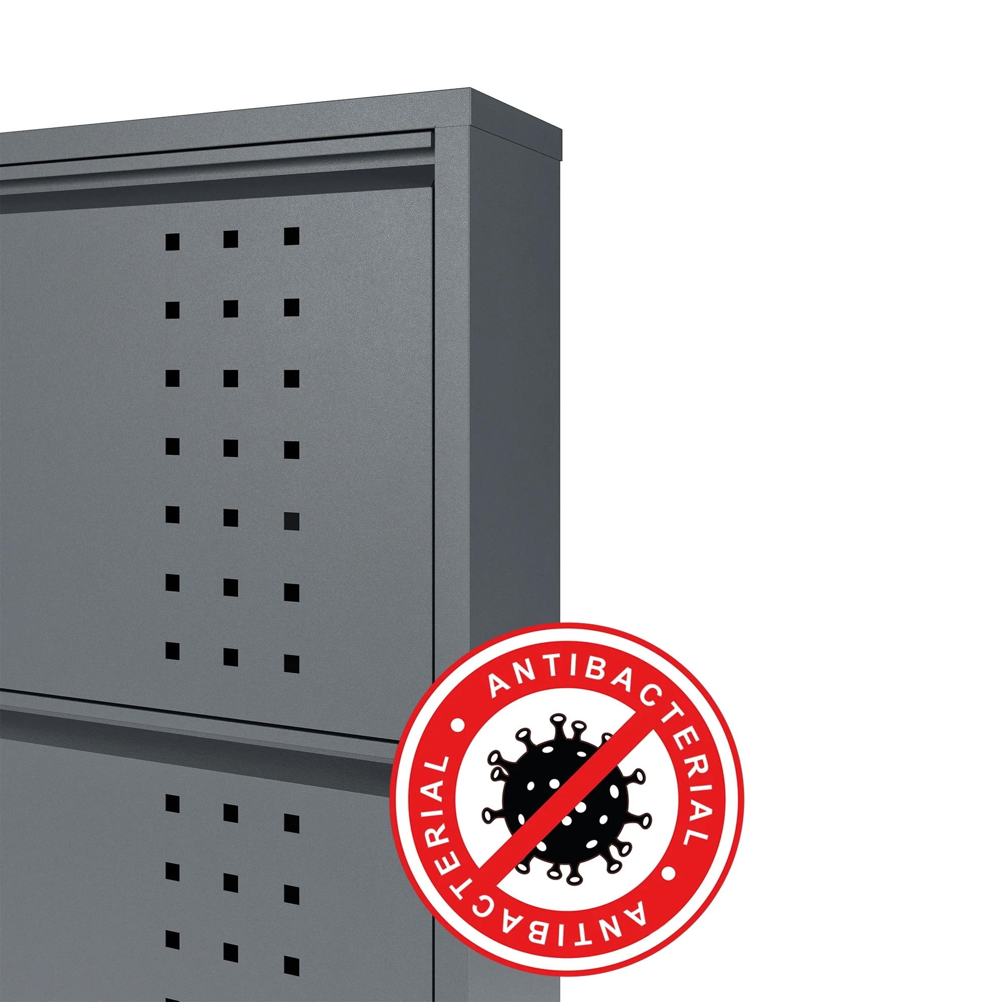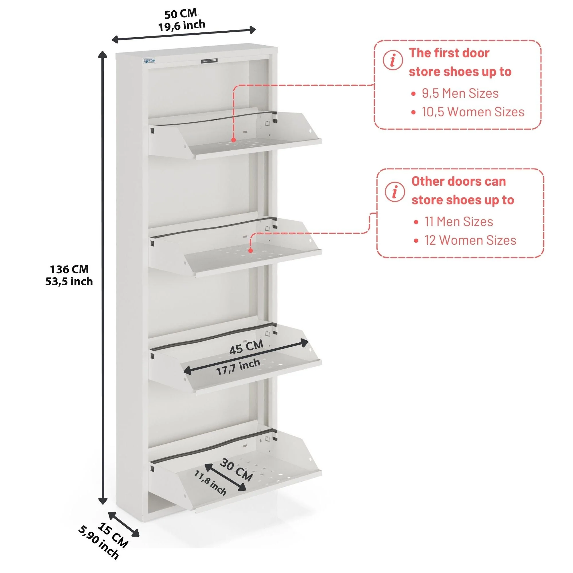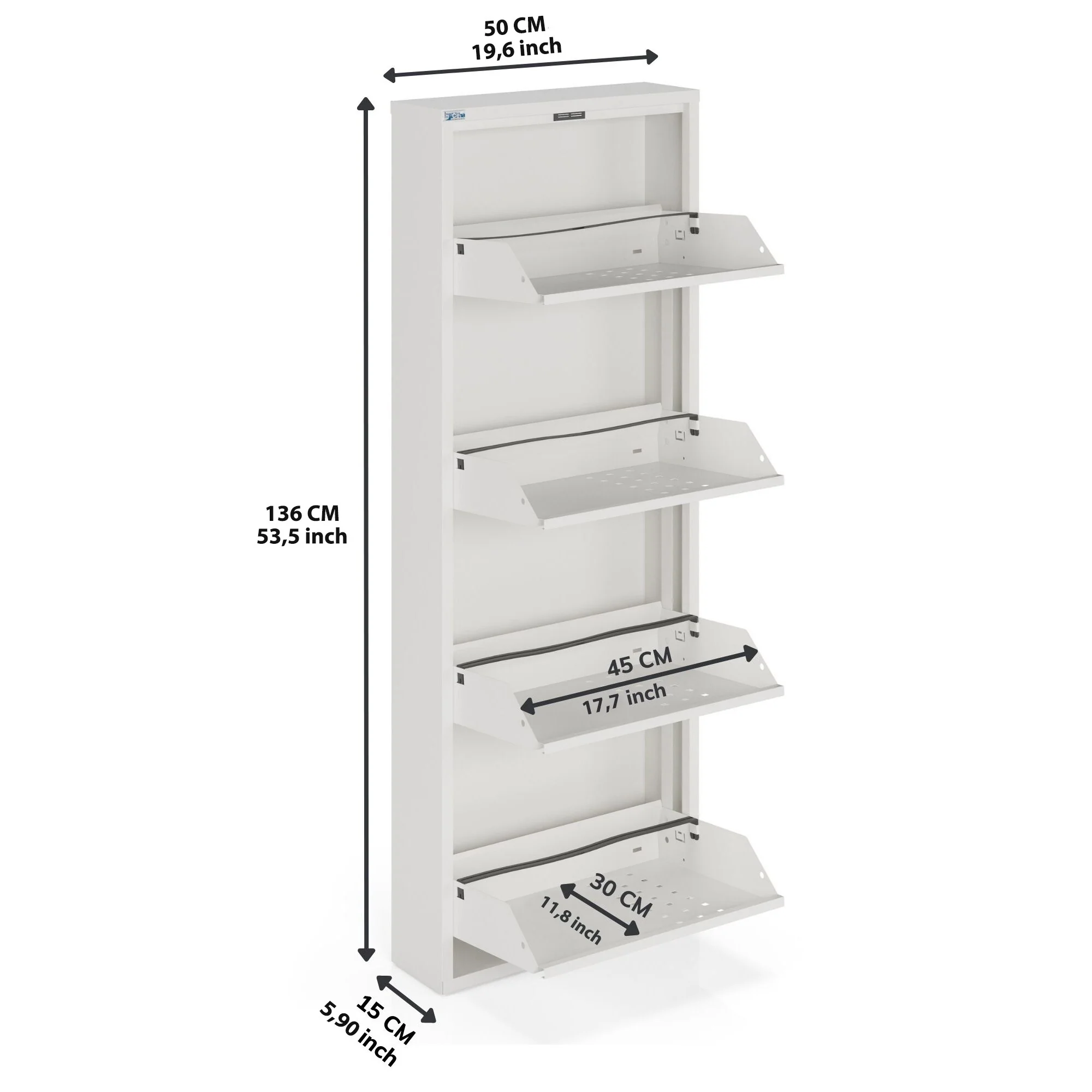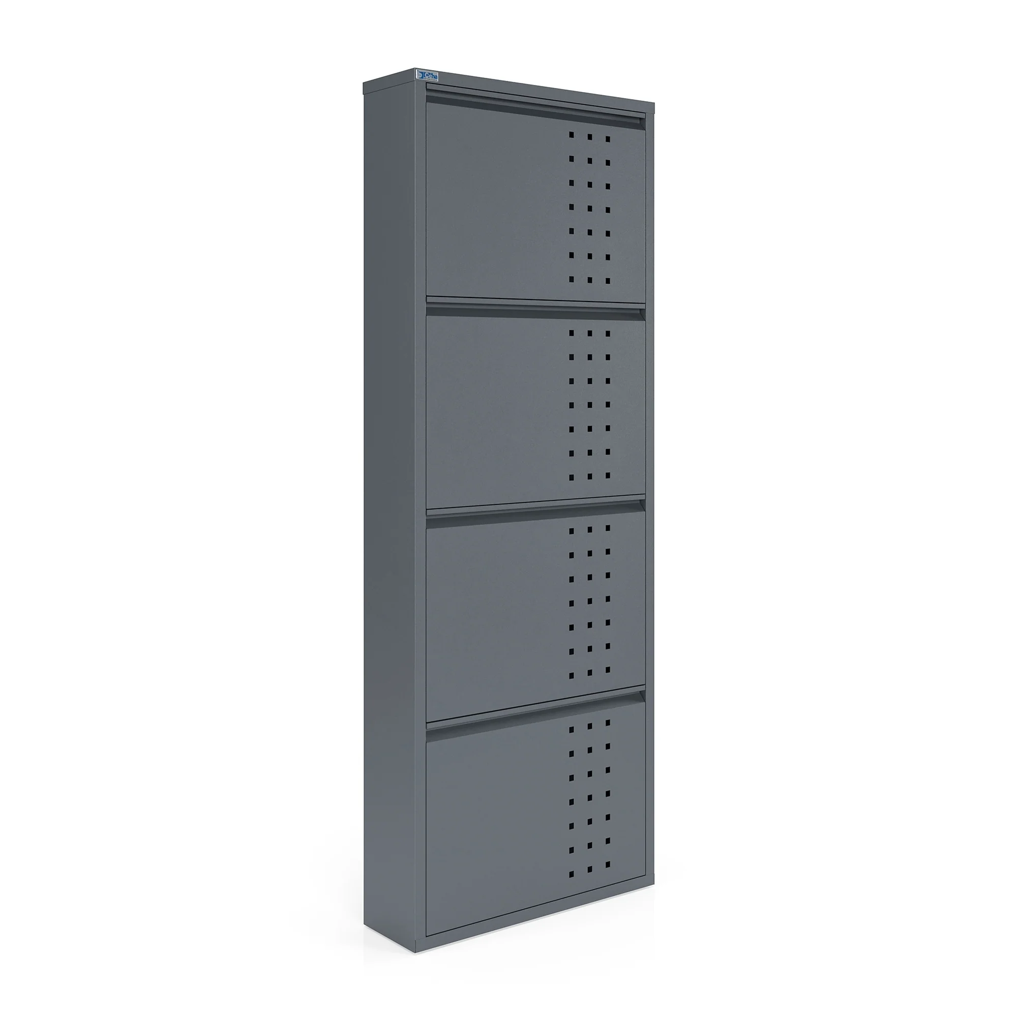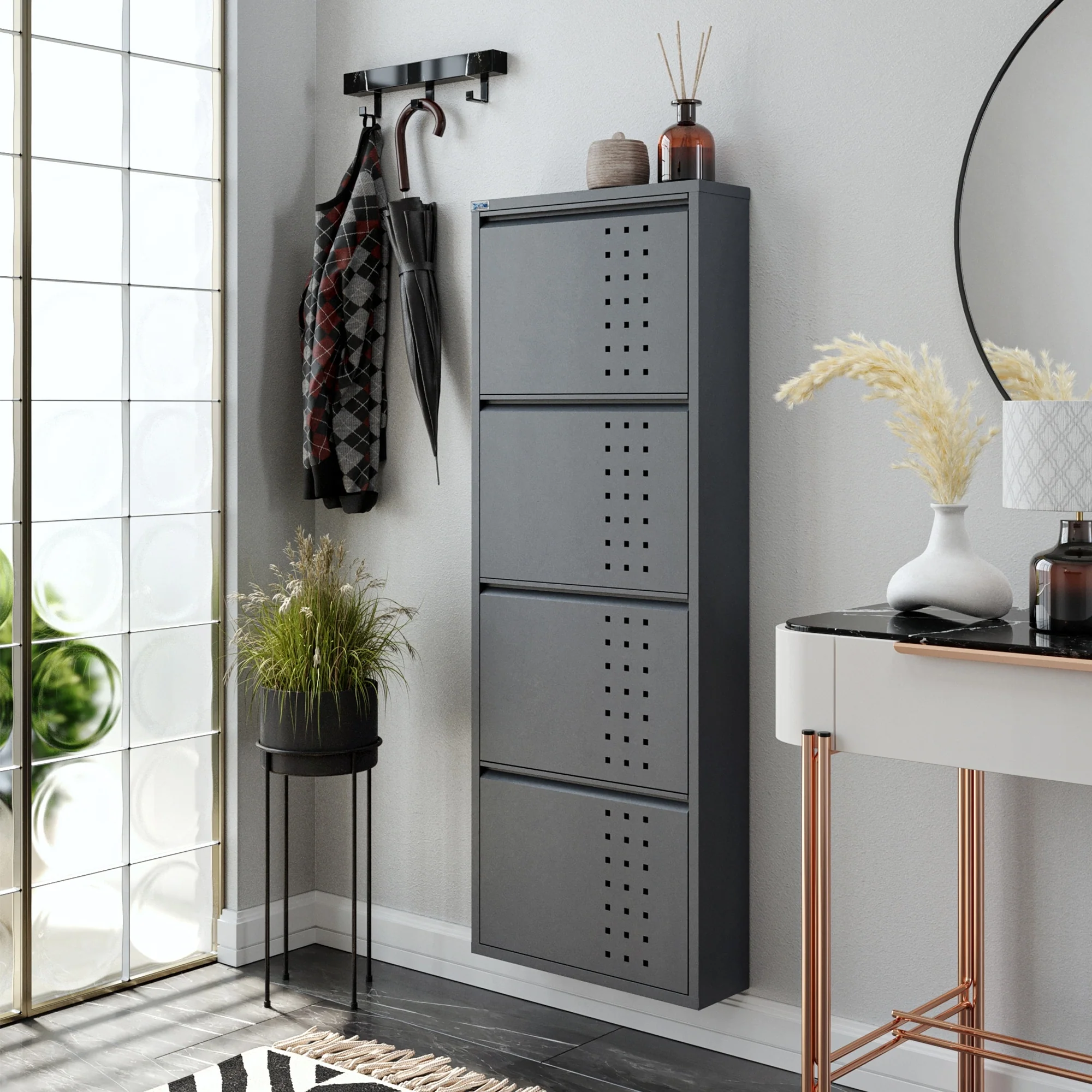 Introducing the CEHA 4 Tier Metal Shoe Cabinet with Cover the ultimate shoe storage solution for your home! This shoe rack shelf closet is designed with fully welded strong construction and coated with epoxy-polyester powder to ensure durability and longevity. It features integrated handles and magnetic latches allowing you to access your shoes and keep them organized quickly. The cabinet's four tiers provide ample storage space with each drawer capable of holding up to two pairs of shoes. The square holes on the front of the cabinet provide airflow and prevent your shoes from getting damp or moldy making it ideal for use in humid environments such as bathrooms or garages. It can be used in various settings including closets, bedrooms, entryways, and even garages. With holes on the back, you can save even more space by mounting it on the wall. It comes with a 2-year warranty (excluding wear parts) giving you peace of mind that you are making a smart investment in your shoe storage.