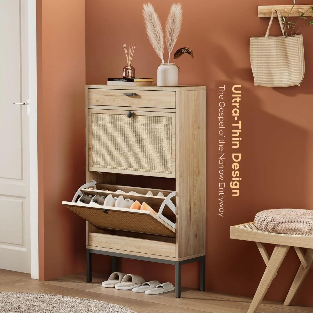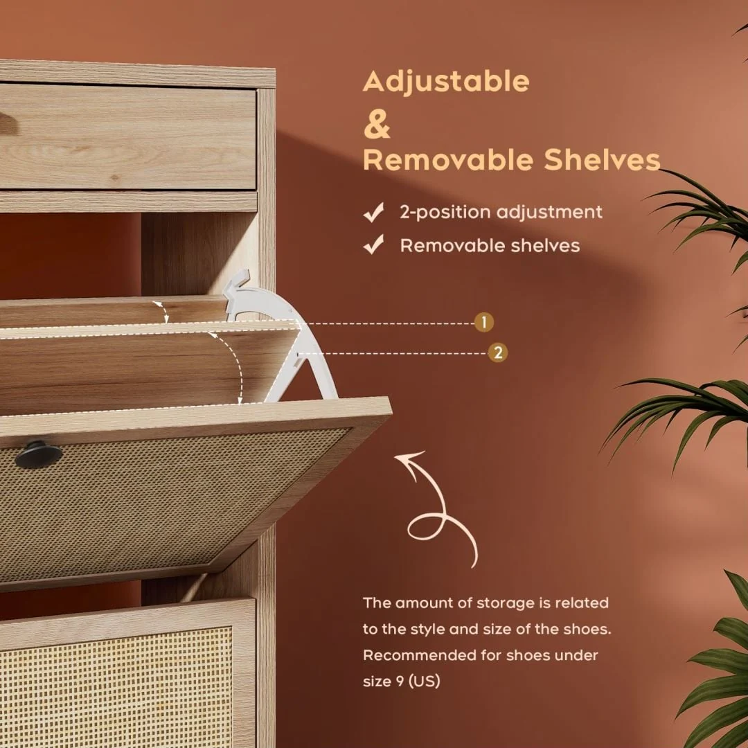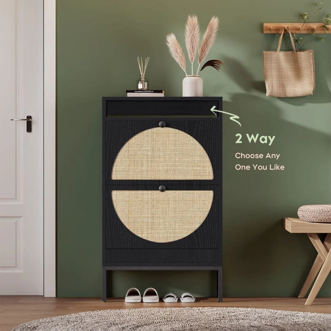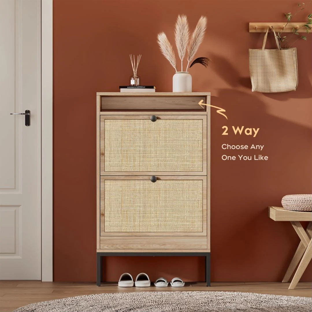 - Crisp and Clean Appearance: It's made of high-quality MDF board and metal. It has wood grain coloration and knots for a simple, elegant look. What's more, it is made of natural rattan imported from Indonesia, which perfectly integrates the art of handmade rattan into the simple and elegant appearance of the shoe cabinet, making the shoe cabinet more natural. The unique bohemian style seems to bring you into the nature. The understated design is just right, and it doesn't look out of place with any home style, perfectly suited for all styles of home.