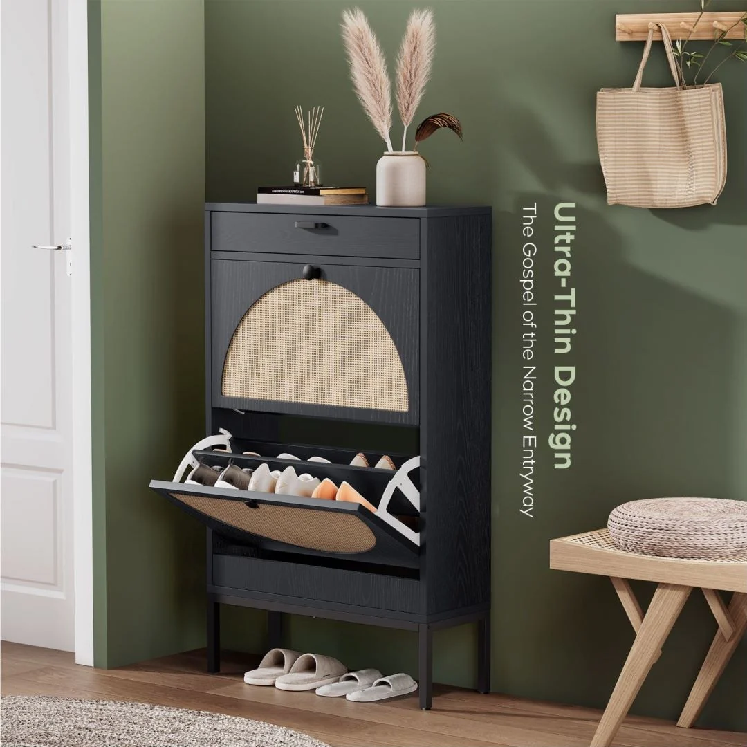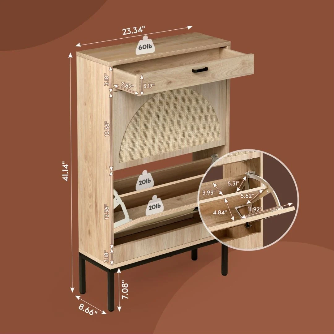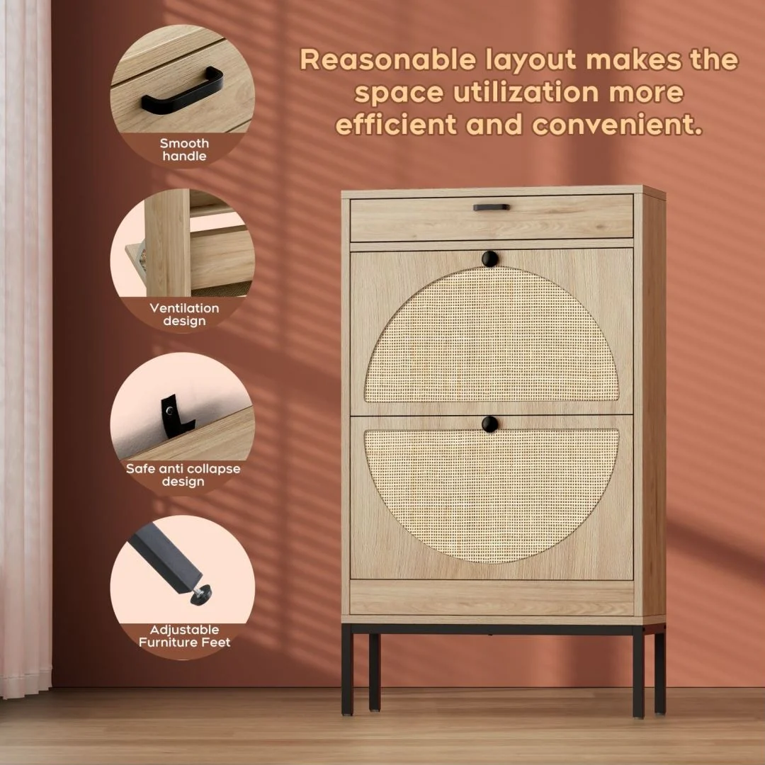 - Crisp and Clean Appearance: It's made of high-quality MDF board and metal. It has wood grain coloration and knots for a simple, elegant look. What's more, it is made of natural rattan imported from Indonesia, which perfectly integrates the art of handmade rattan into the simple and elegant appearance of the shoe cabinet, making the shoe cabinet more natural. The unique bohemian style seems to bring you into the nature. The understated design is just right, and it doesn't look out of place with any home style, perfectly suited for all styles of home.