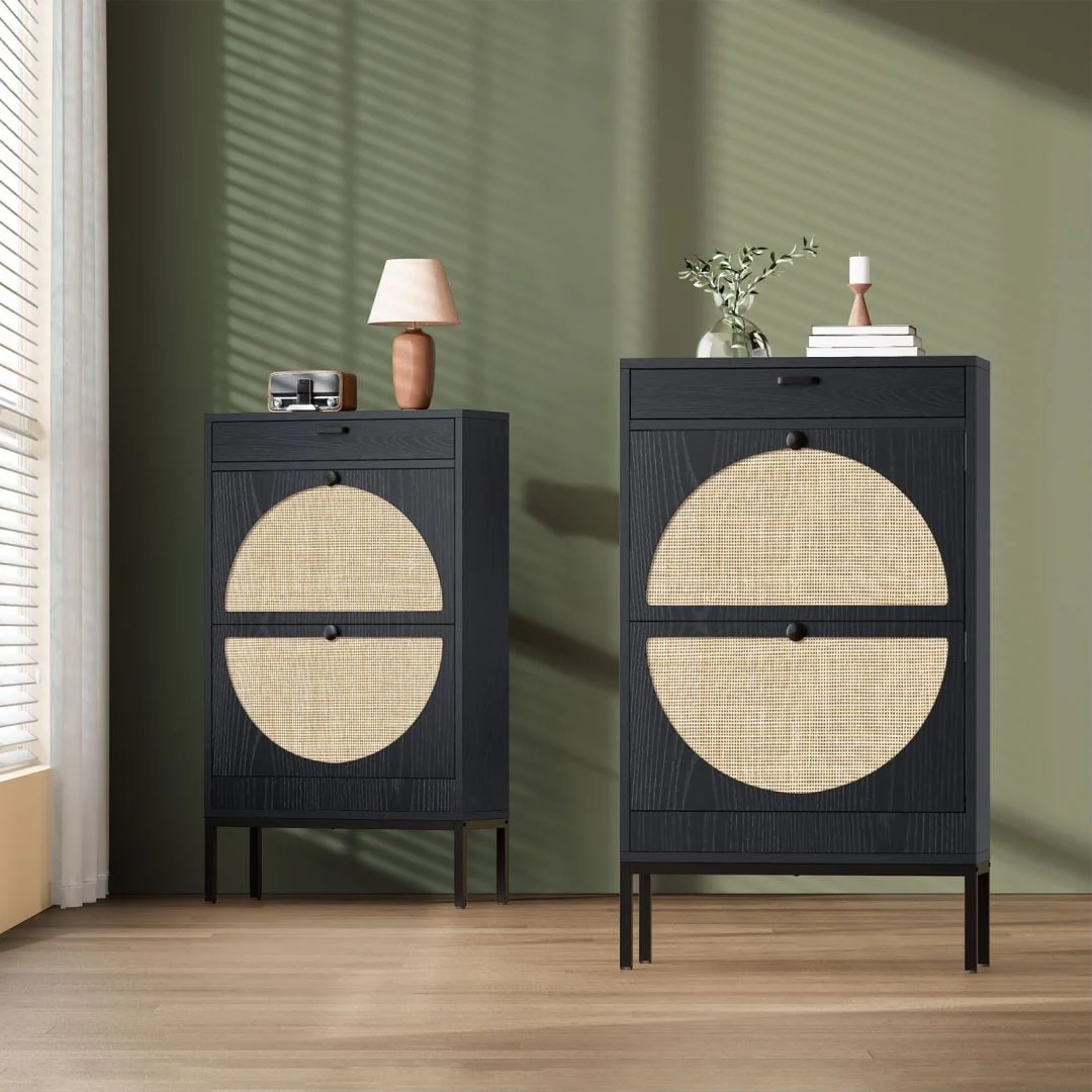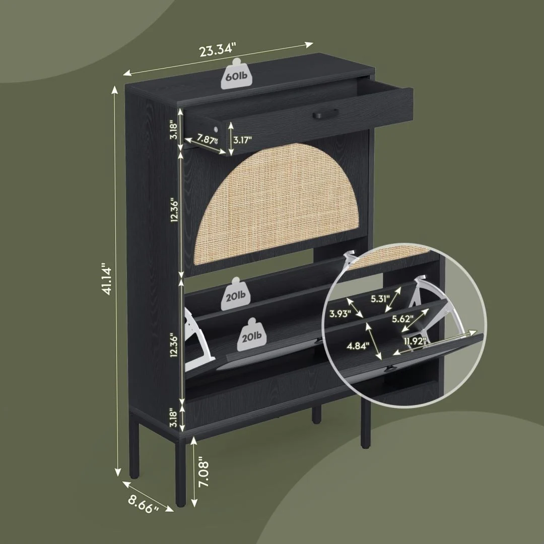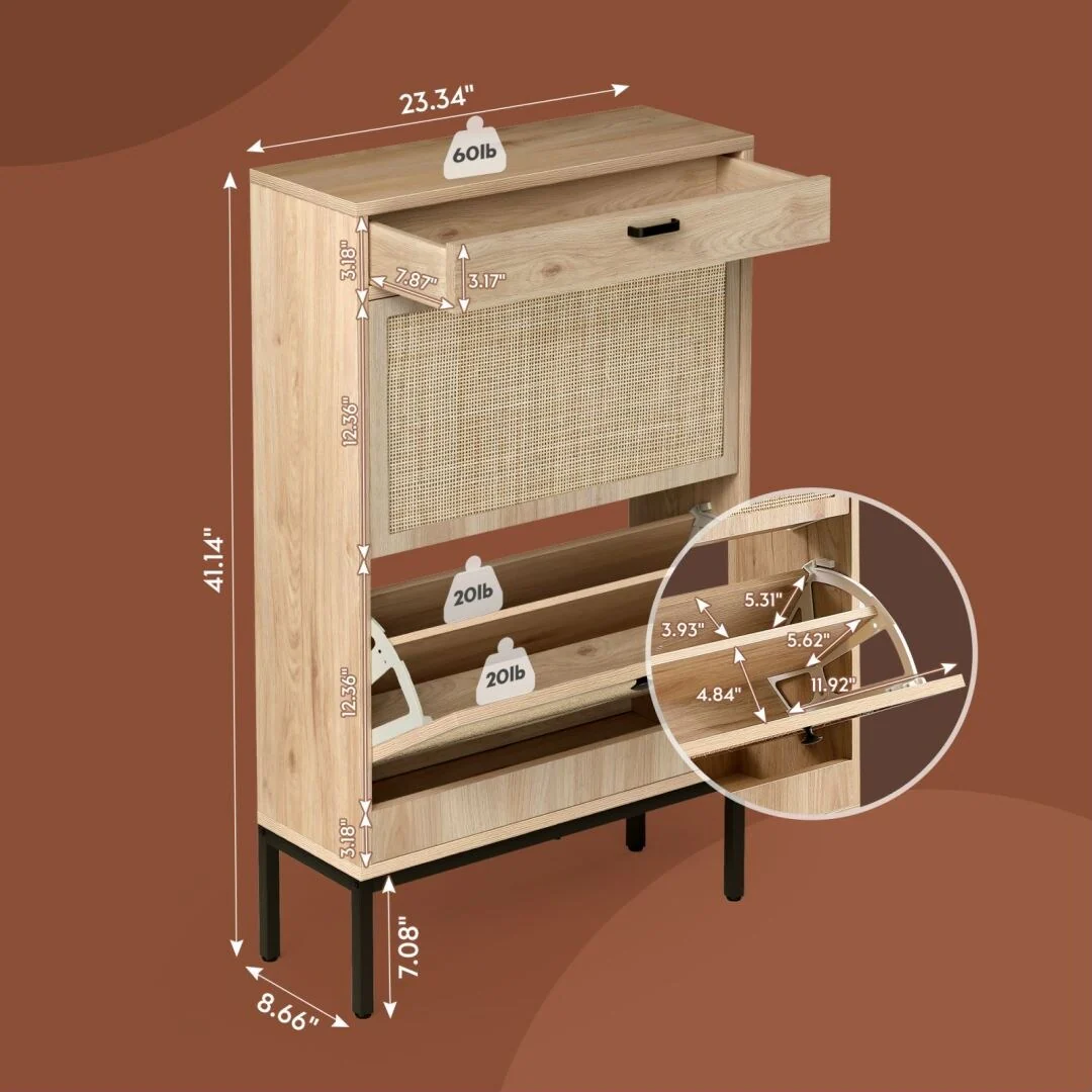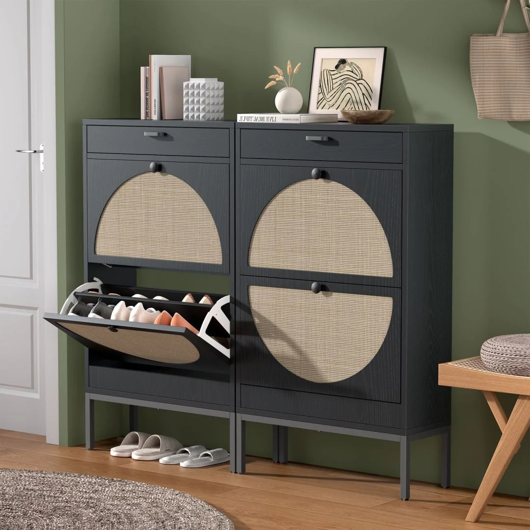 - Crisp and Clean Appearance: It's made of high-quality MDF board and metal. It has wood grain coloration and knots for a simple, elegant look. What's more, it is made of natural rattan imported from Indonesia, which perfectly integrates the art of handmade rattan into the simple and elegant appearance of the shoe cabinet, making the shoe cabinet more natural. The unique bohemian style seems to bring you into the nature. The understated design is just right, and it doesn't look out of place with any home style, perfectly suited for all styles of home.