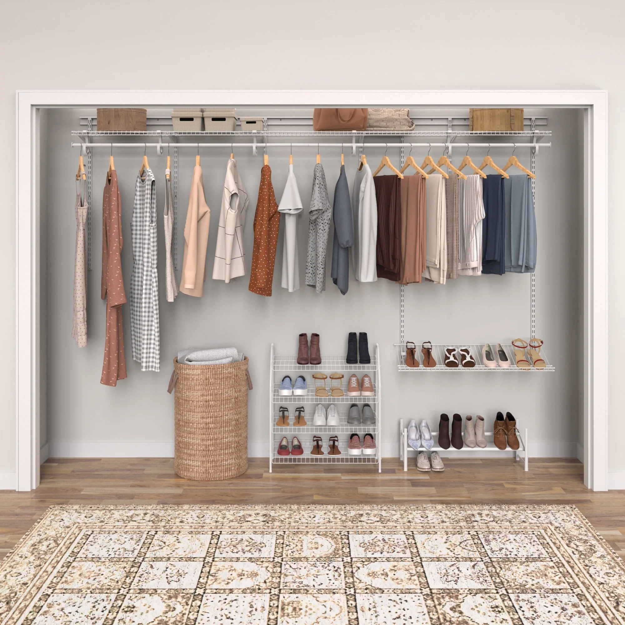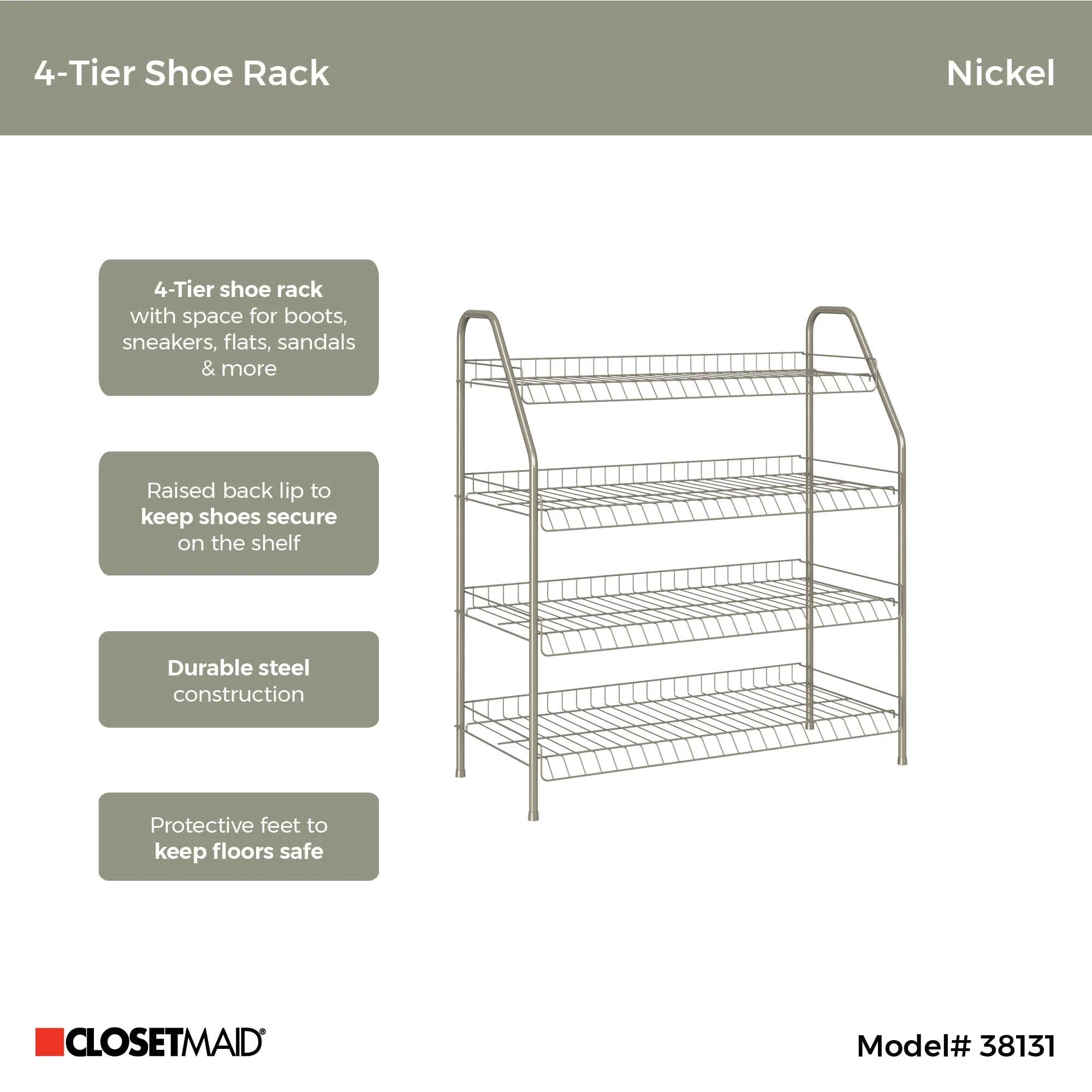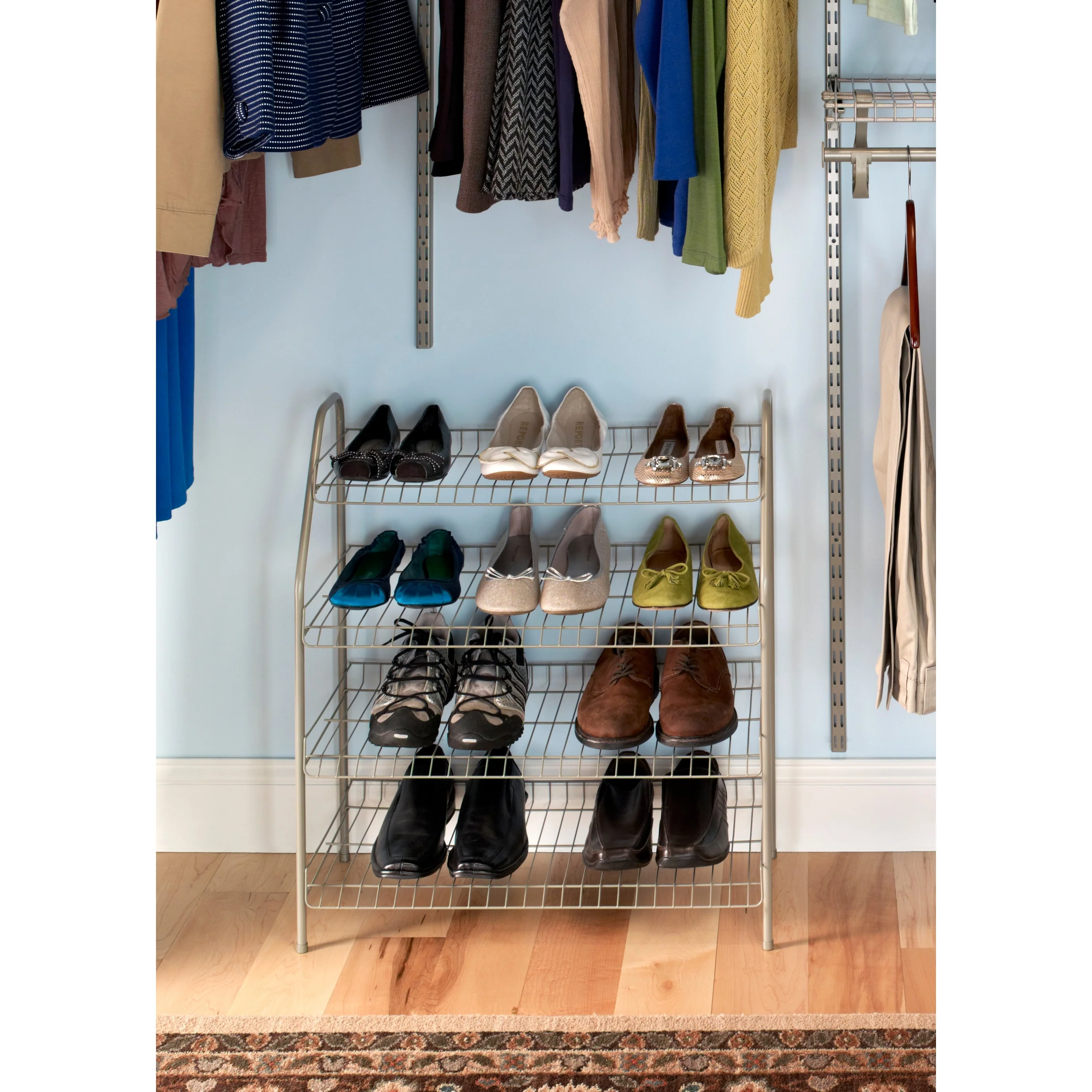 For shoe storage whenever you need it, add a ClosetMaid 4-Tier Freestanding Shoe Rack to your home. This shoe rack is made with durable vinyl-finished wire shelving and a lightweight epoxy tubular frame. The freestanding design makes it easy to move from room to room, depending on your storage needs.