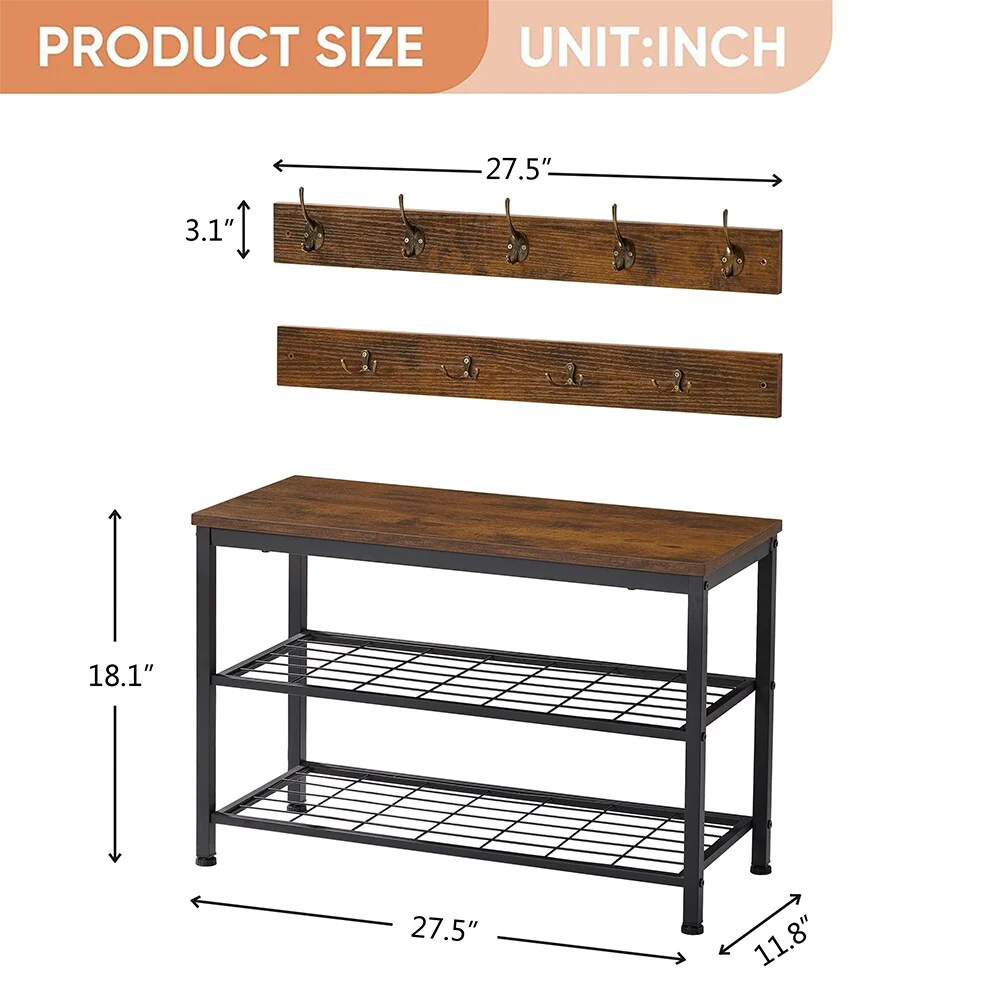 【Large Storage Space】- The size of the coat rack is 27.5'Lx 3.1'W, and the shoe rack bench is 27.5'L x 11.8'W x 18.1'H. The shoe rack can hold up to 5-6 pairs of shoes on each shelf, and the coat rack is equipped with hooks for up to clothing. It gives you extra-large storage space to keep your clothing and shoes organized!