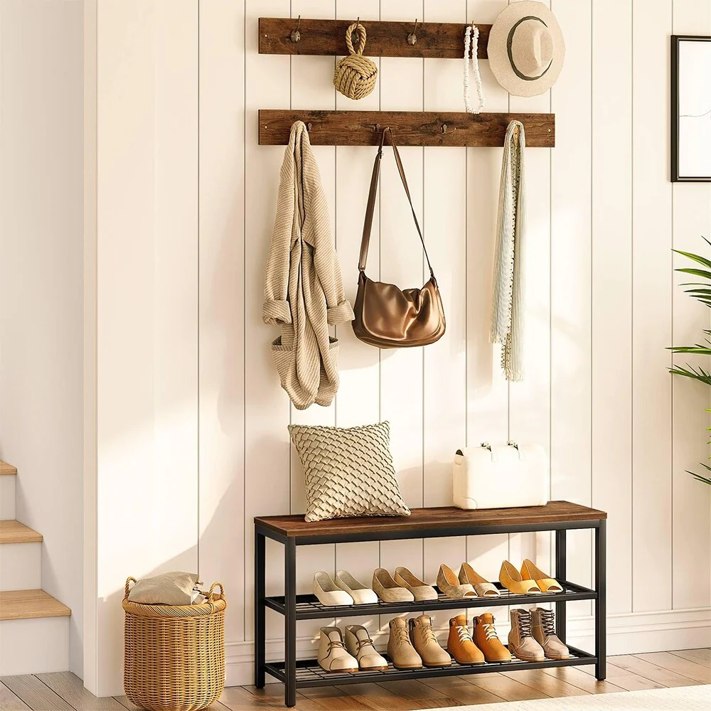【Durable & Stable】- This shoe rack is made of high-quality MDF, the shoe rack for the entryway perfectly organizes family clothes instead of throwing them on the couch. The shoe rack bench is of great convenience instead of kicking shoes off. Just sit on it to change shoes and hang coats.