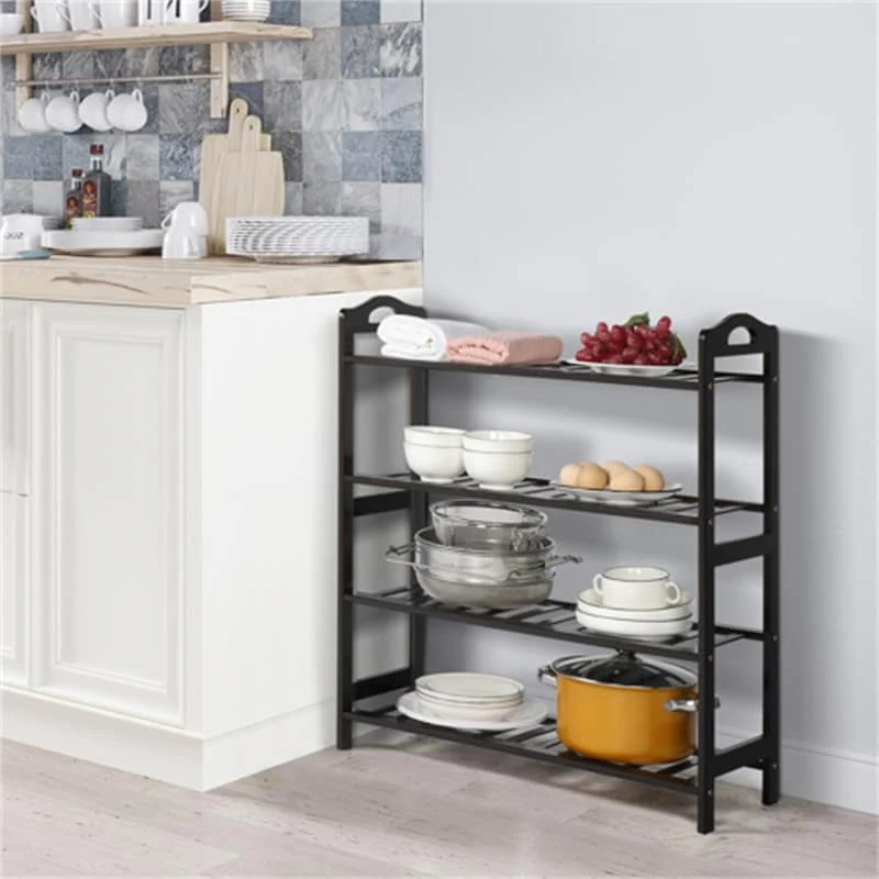 2.【Multi-Use Bamboo  Rack】- The bamboo shelf is suitable to be placed in the hall, closets,  entryway, hallway, living room, bed room, balcony, etc. And the 4 tiers  bamboo rack will convenient for placing shoes, towels, sundries, books,  plants, spice and small appliances in many places
