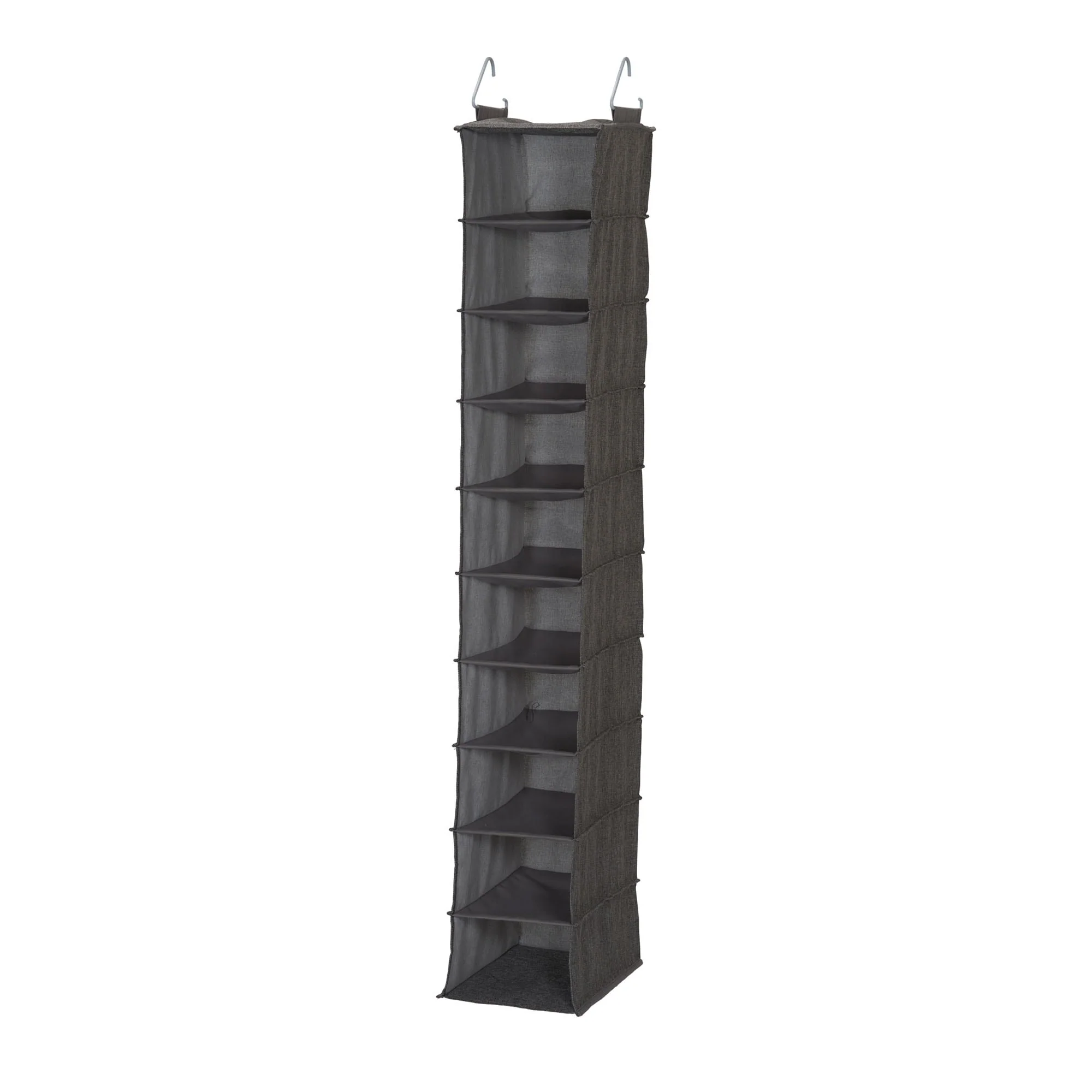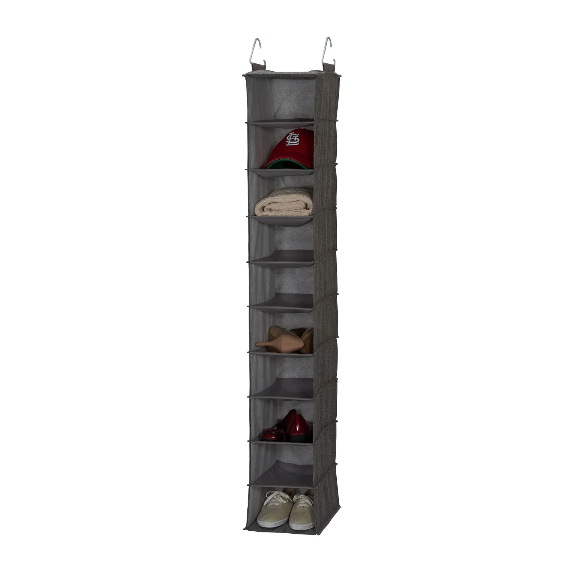 Make your closet the organized storage space of your dreams with the addition of this chic coffee linen hanging shoe organizer. This organizer possesses the style and functionality that you need to upgrade any closet. Its ample storage space creates room to sort various items in detail, while the durable construction promises to last through frequent use. This hanging closet organizer has the potential to pull your bedroom, bathroom or entryway closet together with its durable materials and abundance of 10 shelves. The frame is made of strong polyester with a solid top and bottom. Each shelf is soft-sided with a bamboo lip to provide extra support. These wide shelves have outward seams as well to make for a better fit with plenty of space in compact closets. While primarily meant for shoe storage, this versatile hanging shoe organizer could also be used to sort sweaters, slacks, T-shirts and more. This organizer has a pair of unique and convenient hooks that work with rod, wire or grid closet shelving. These hooks are placed on either side of the shelf to provide excellent support and reduce sagging. They are also super easy to install and remove from any closet. Smaller living spaces such as dorms, apartments and townhouses would greatly benefit from the smart storage options that this hanging shoe organizer offers. Its wide shelves even make space for larger footwear! Add this lovely coffee linen hanging shoe organizer to your home for a more put-together living space.