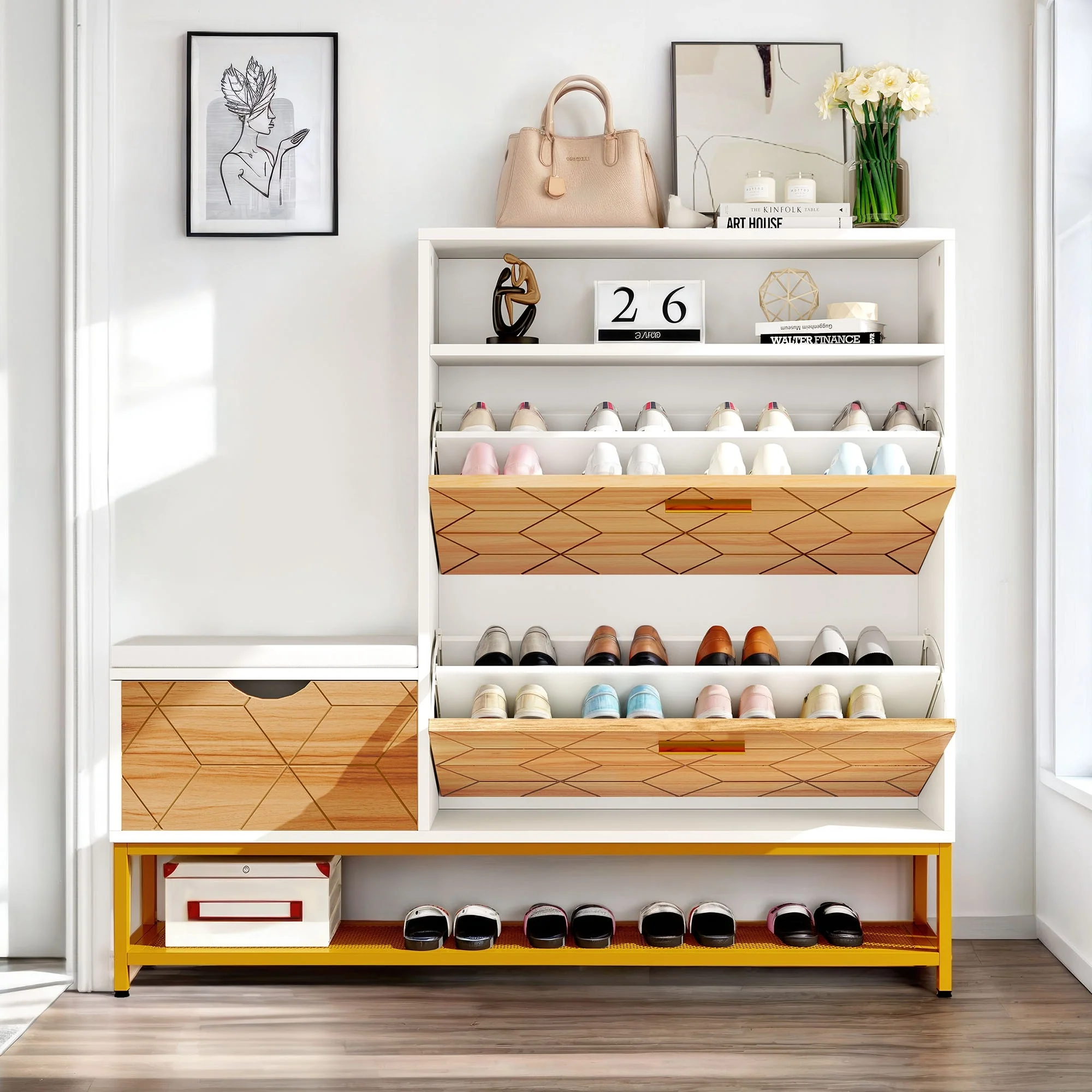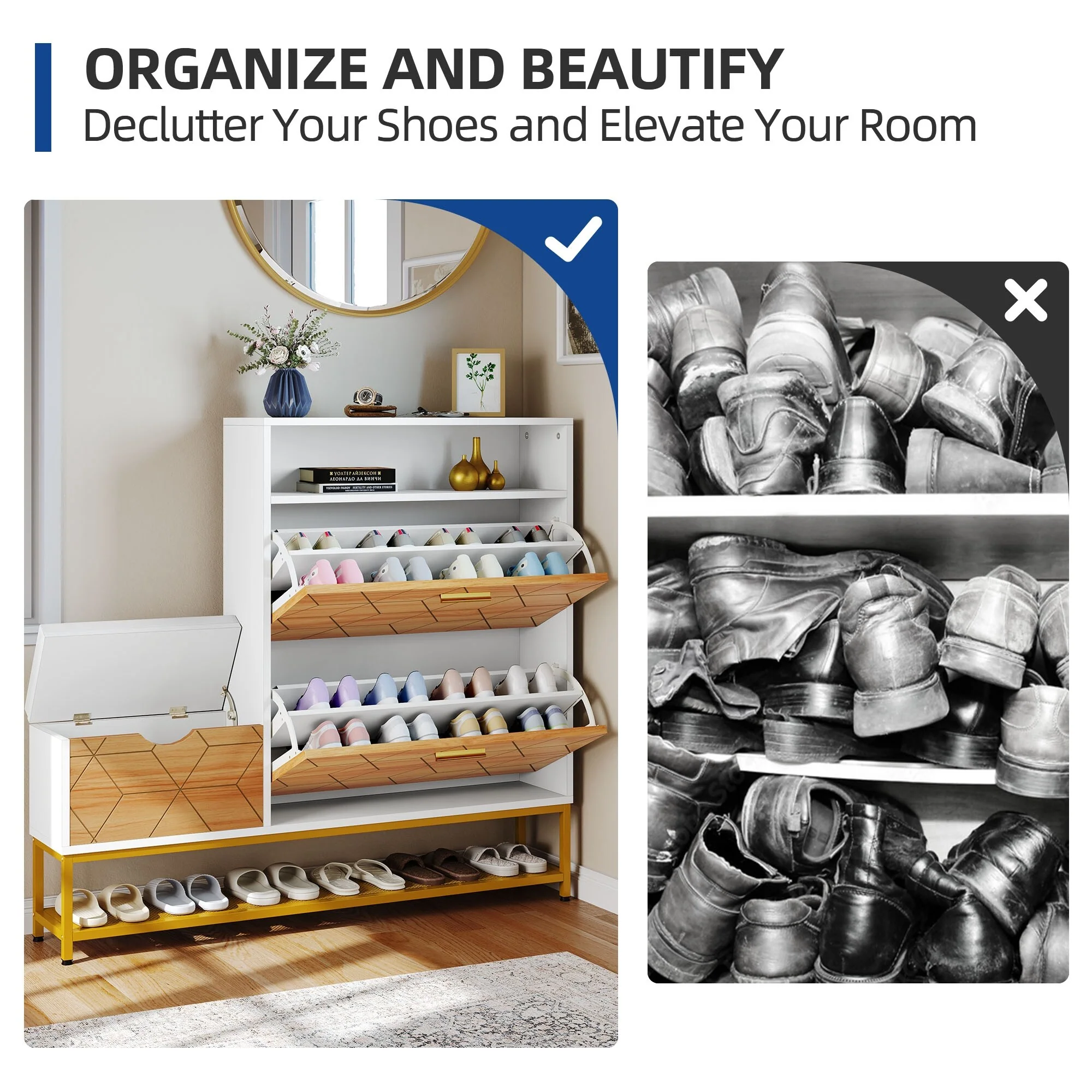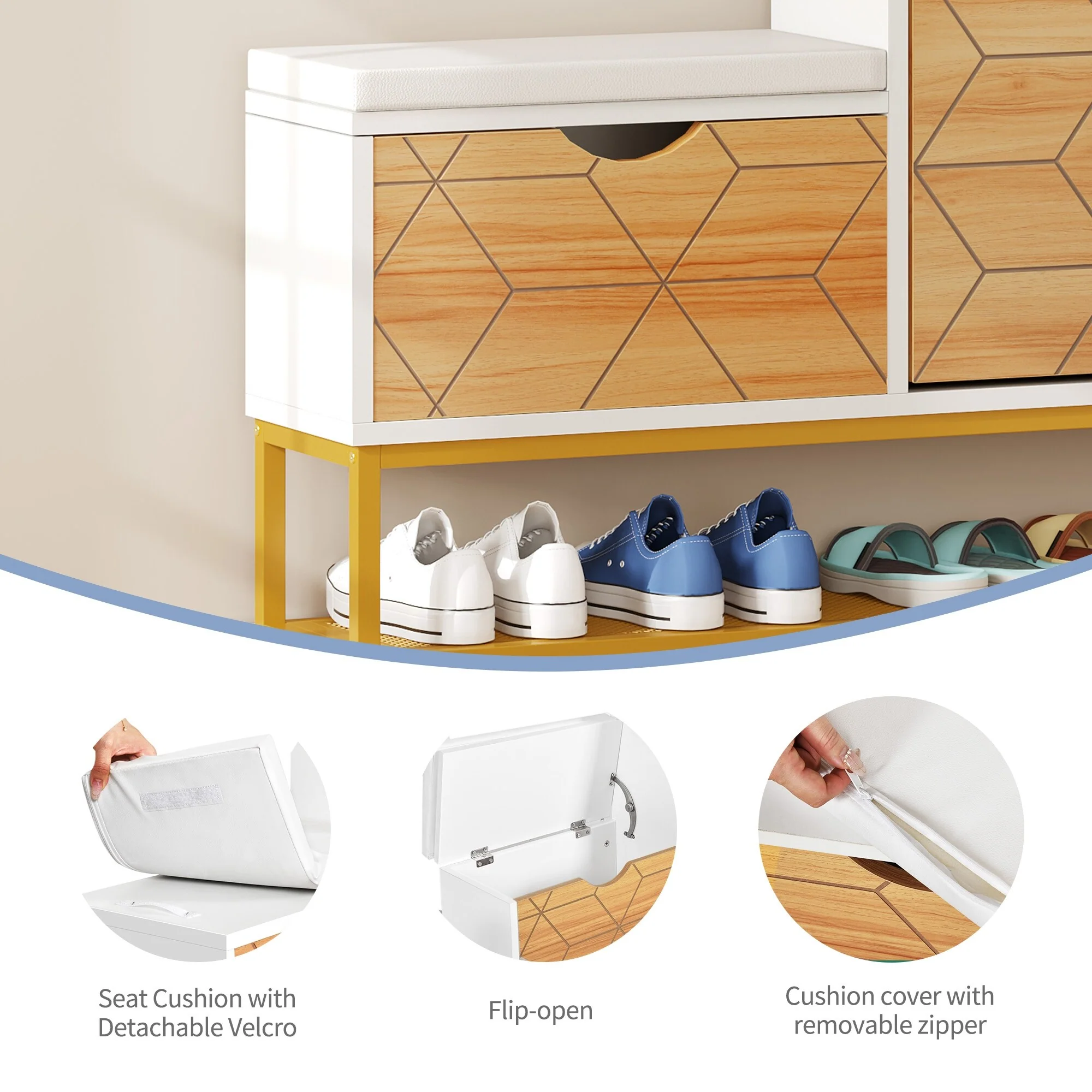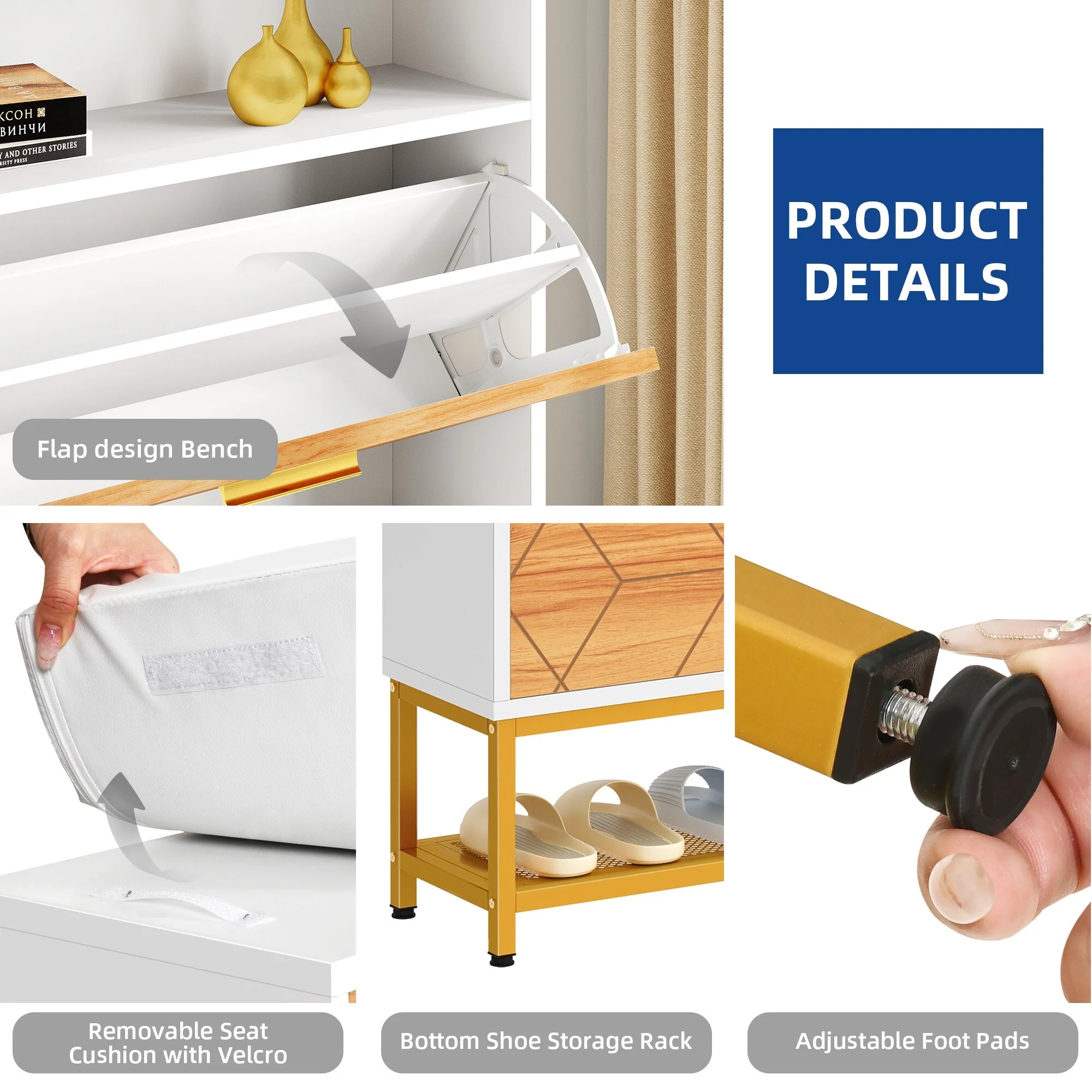 Our Space-Saving Shoe Cabinet is a perfect blend of function and style. Featuring 2 flip drawers, a top open shelf, and a storage shoe bench, it can comfortably accommodate 22 pairs of shoes. The modern design with a white and gold herringbone pattern adds a touch of elegance to any space. The soft leather seat cushion provides a comfortable place to change shoes and has hidden storage for additional items.