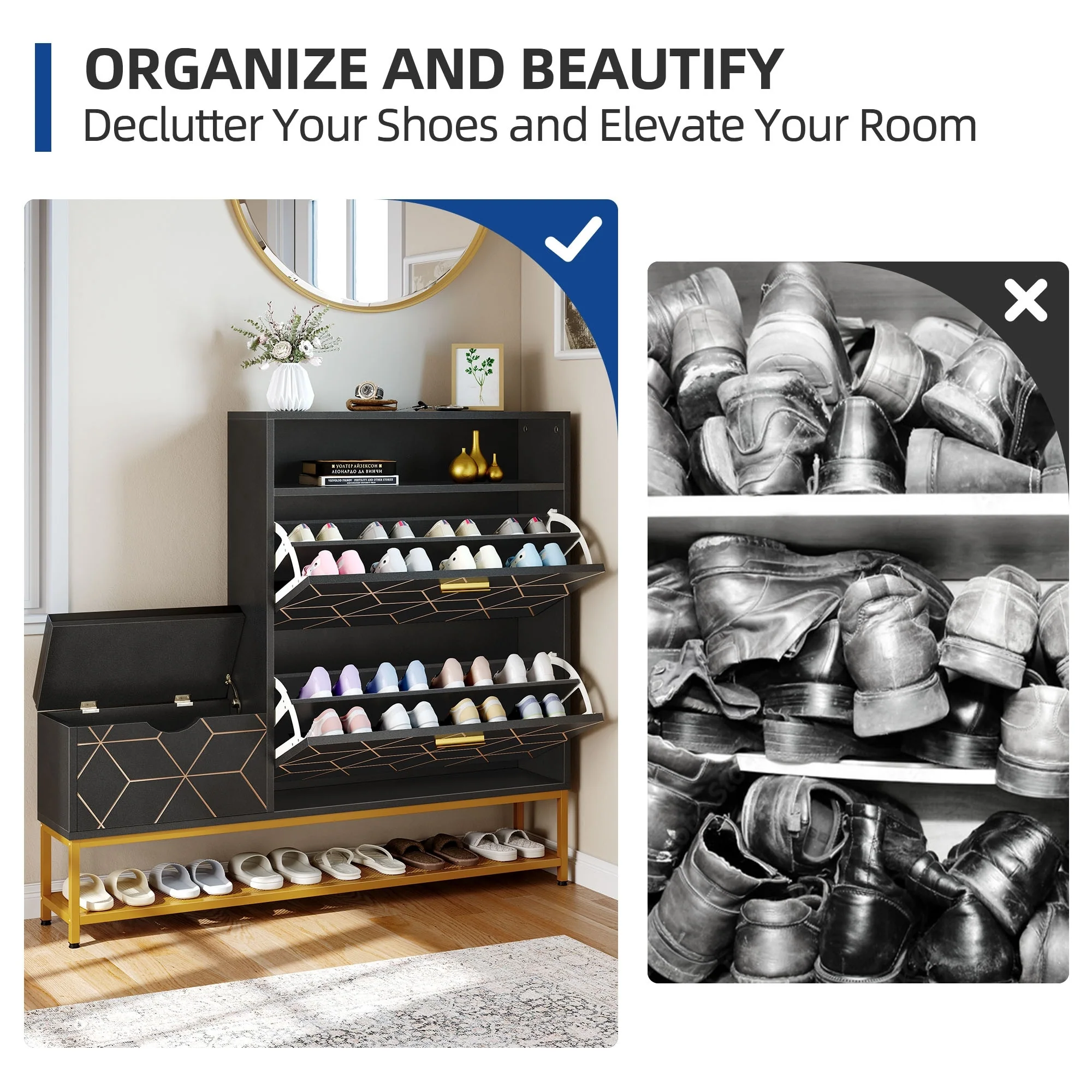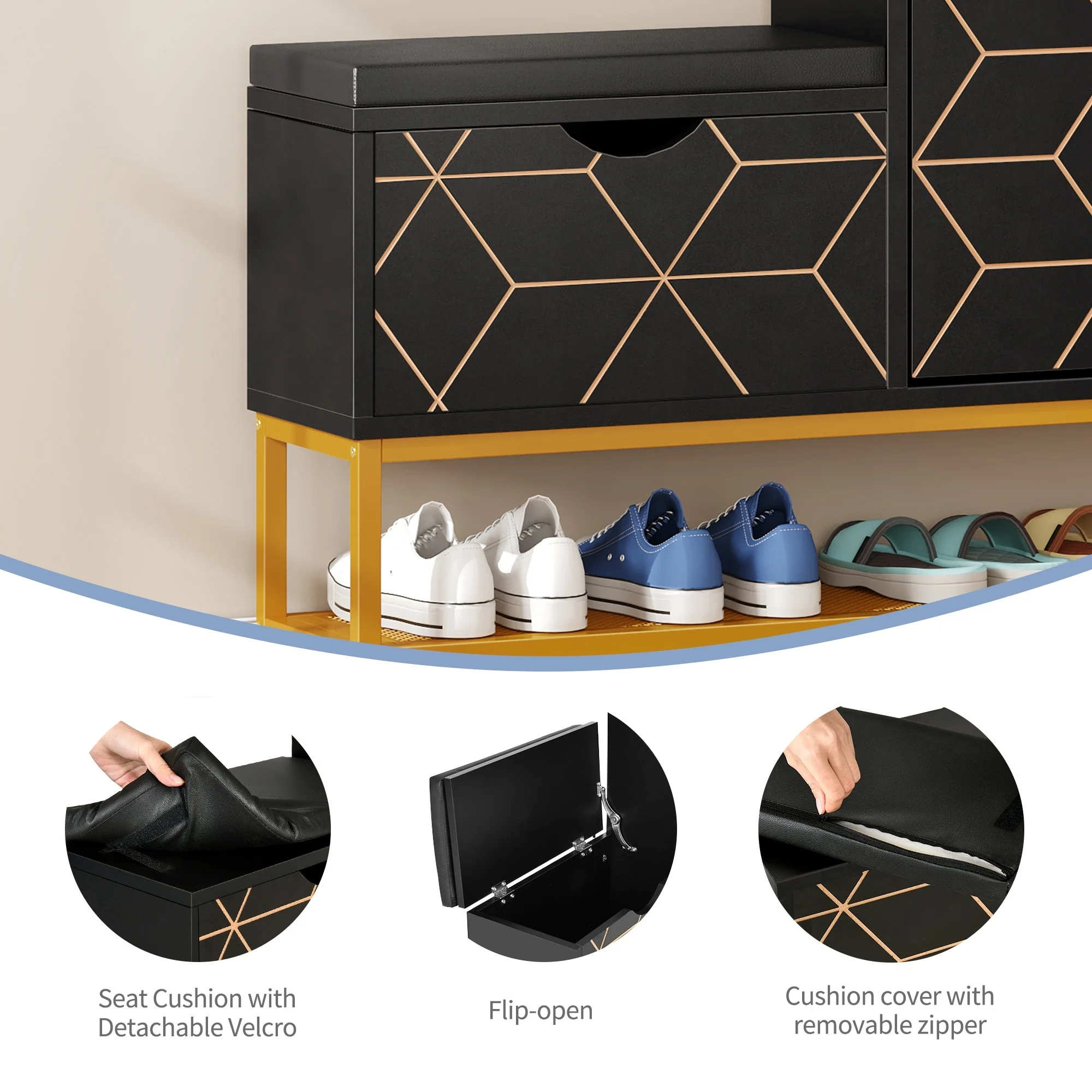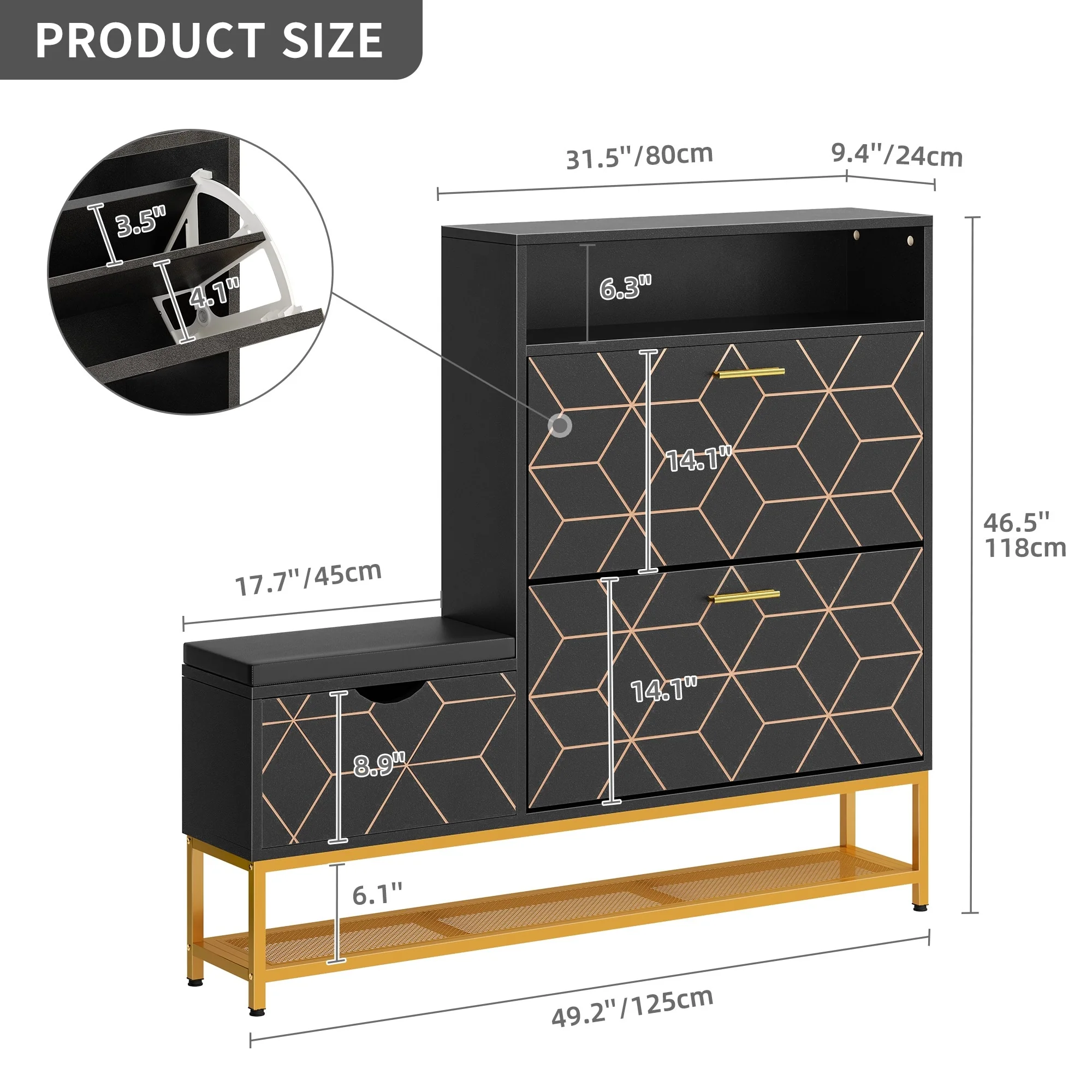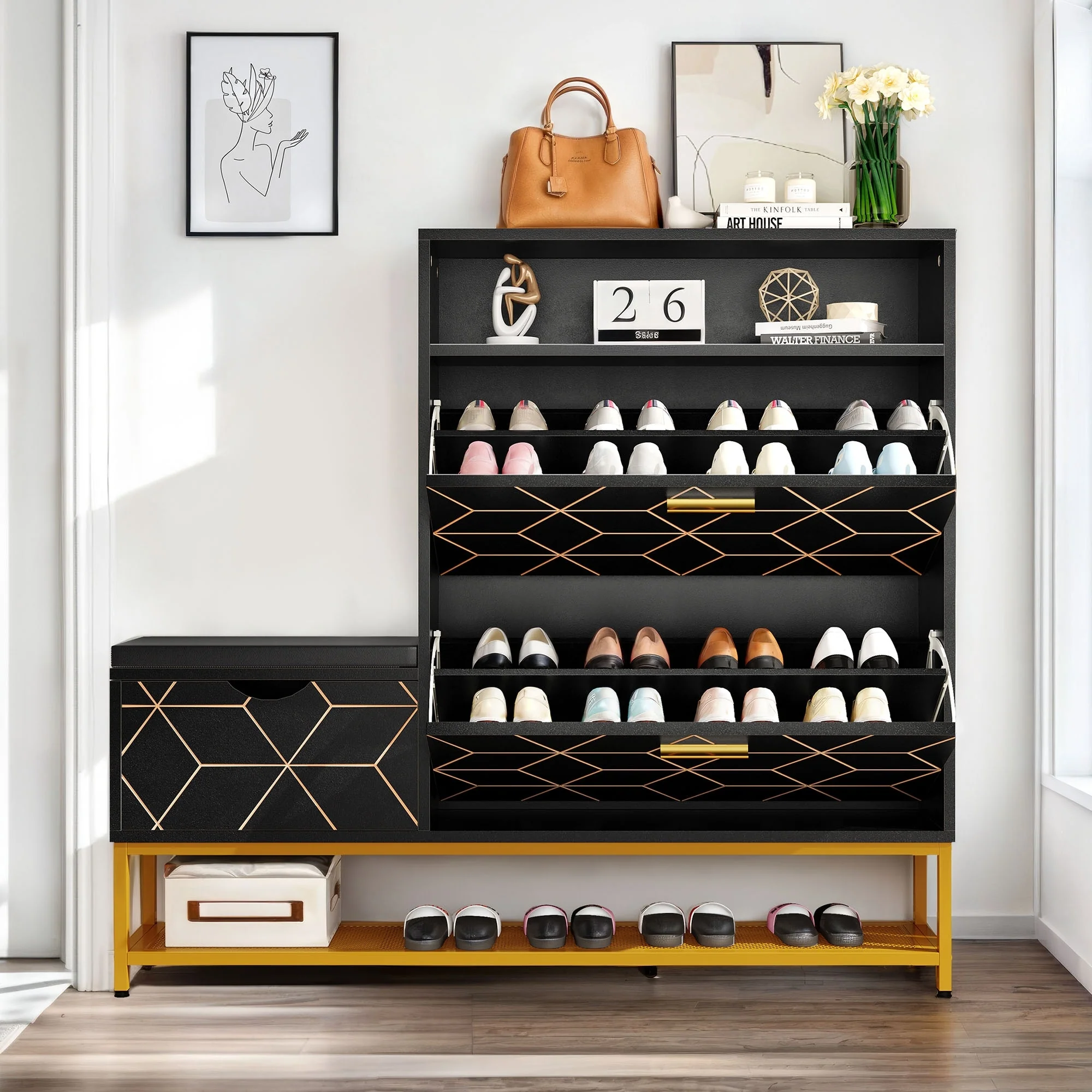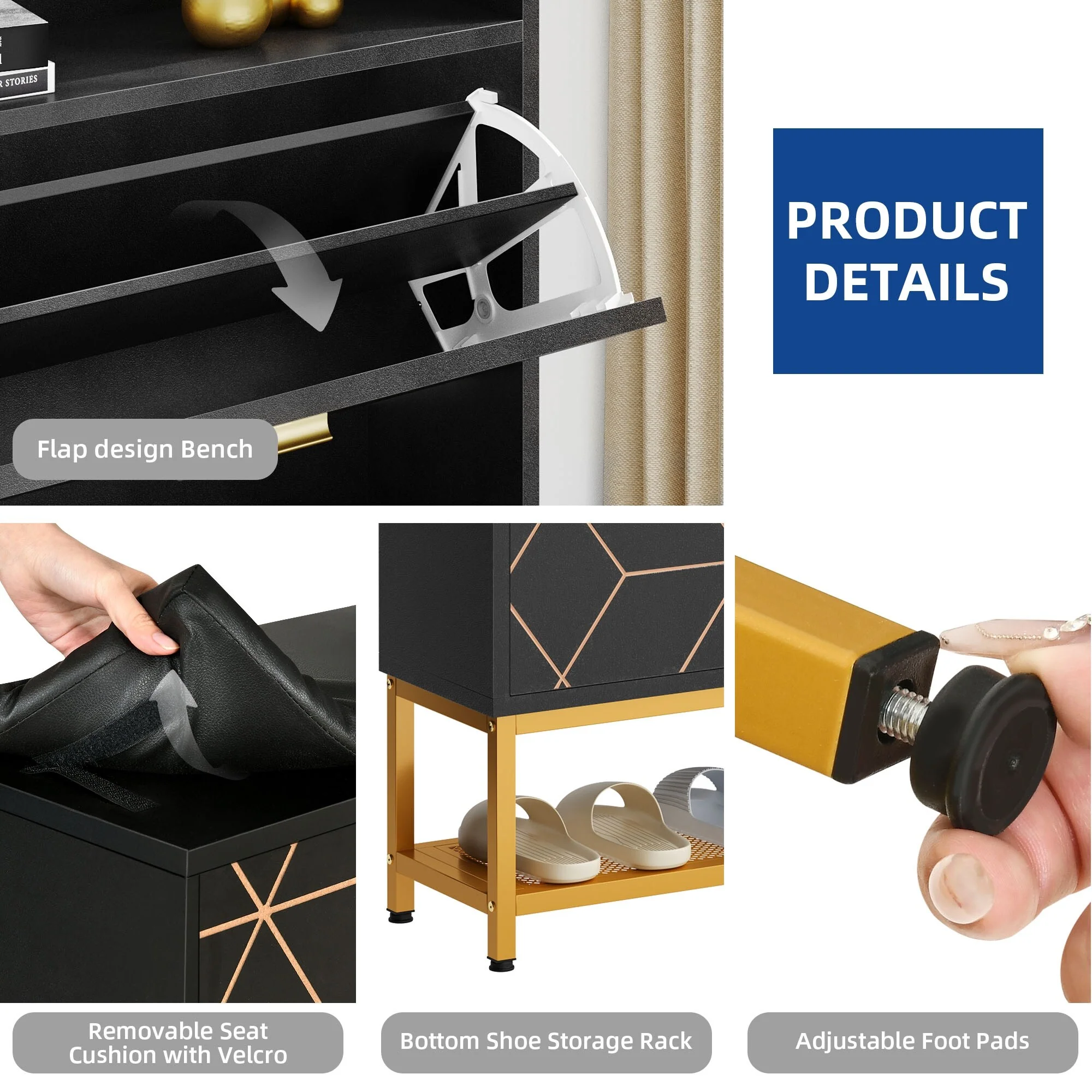 Our Space-Saving Shoe Cabinet is a perfect blend of function and style. Featuring 2 flip drawers, a top open shelf, and a storage shoe bench, it can comfortably accommodate 22 pairs of shoes. The modern design with a white and gold herringbone pattern adds a touch of elegance to any space. The soft leather seat cushion provides a comfortable place to change shoes and has hidden storage for additional items.