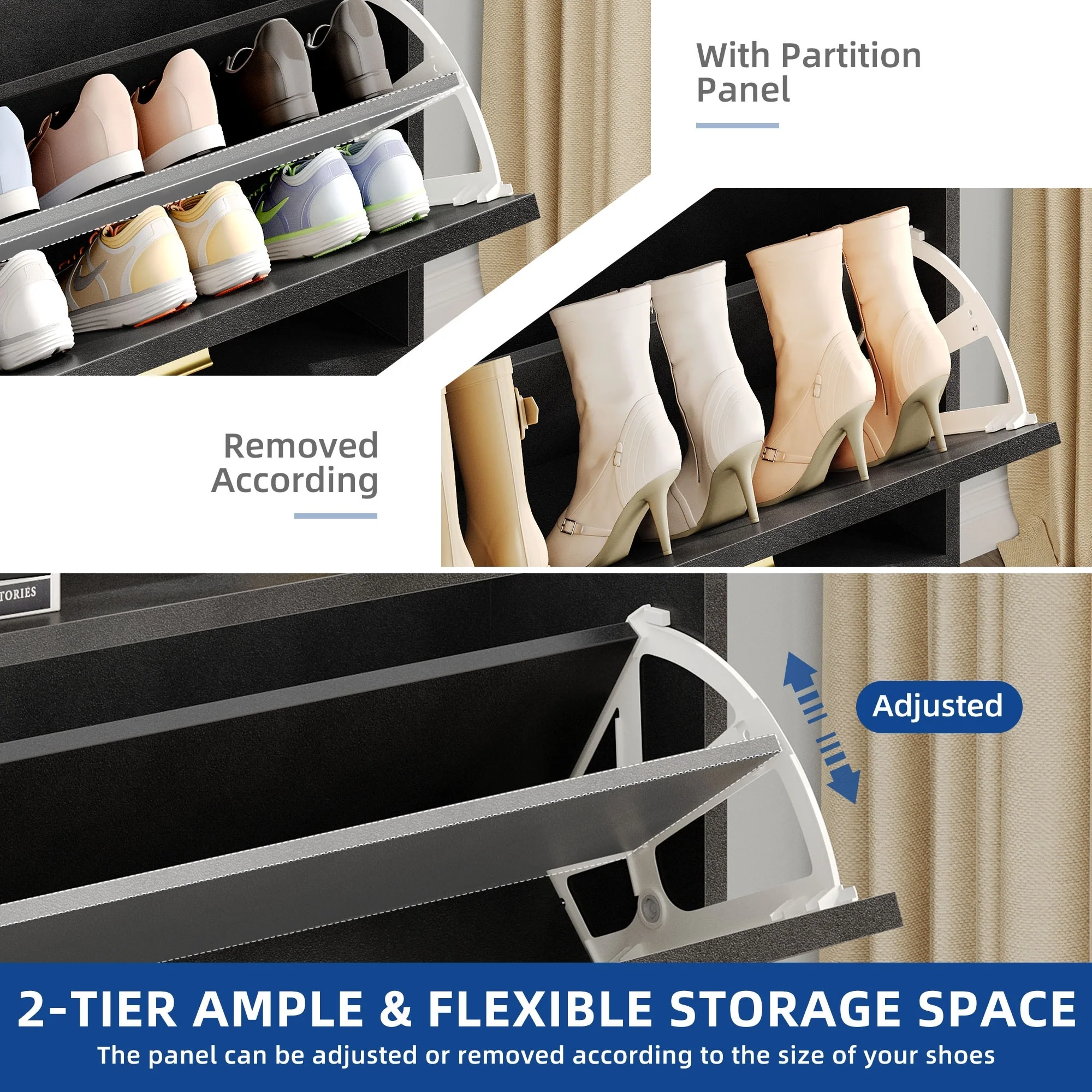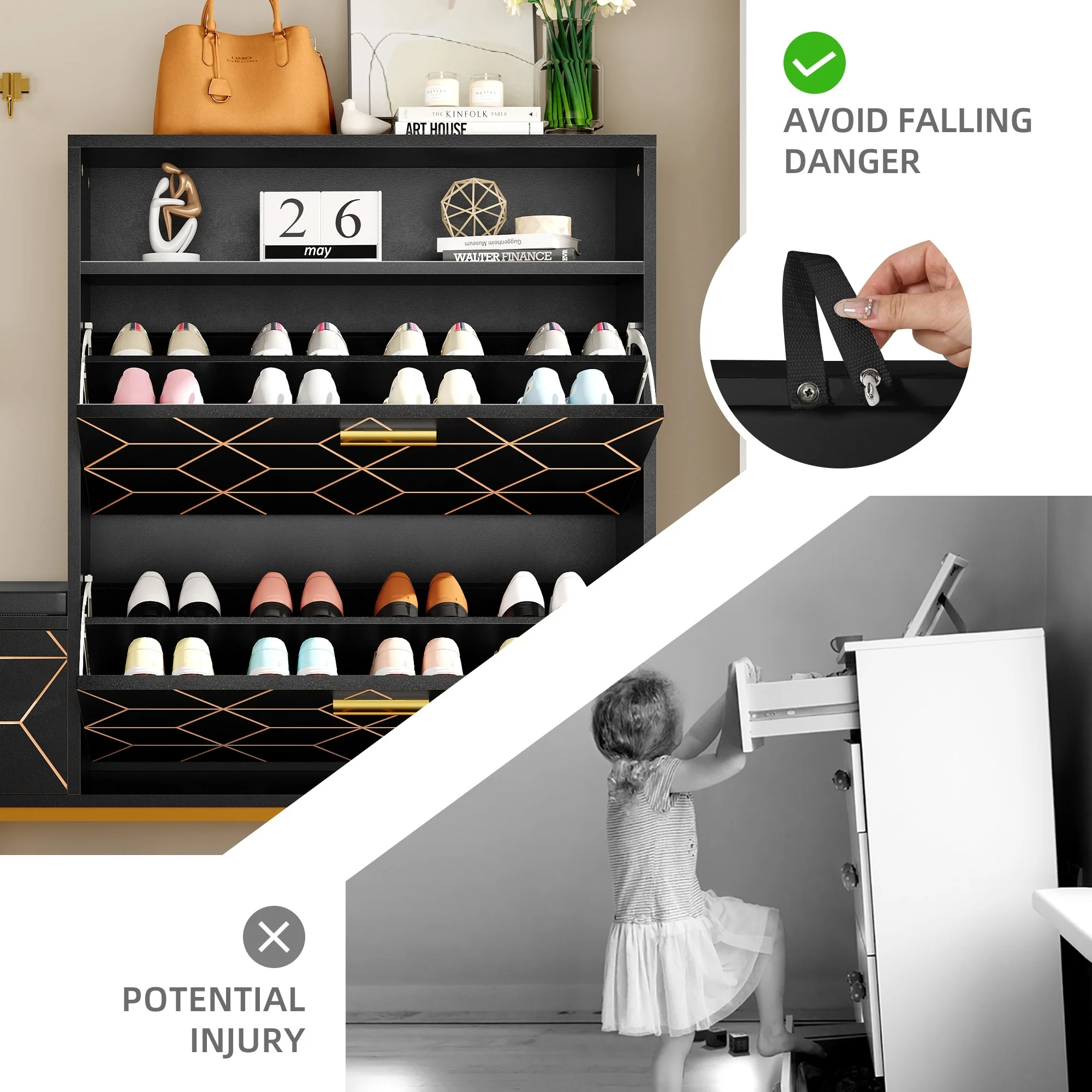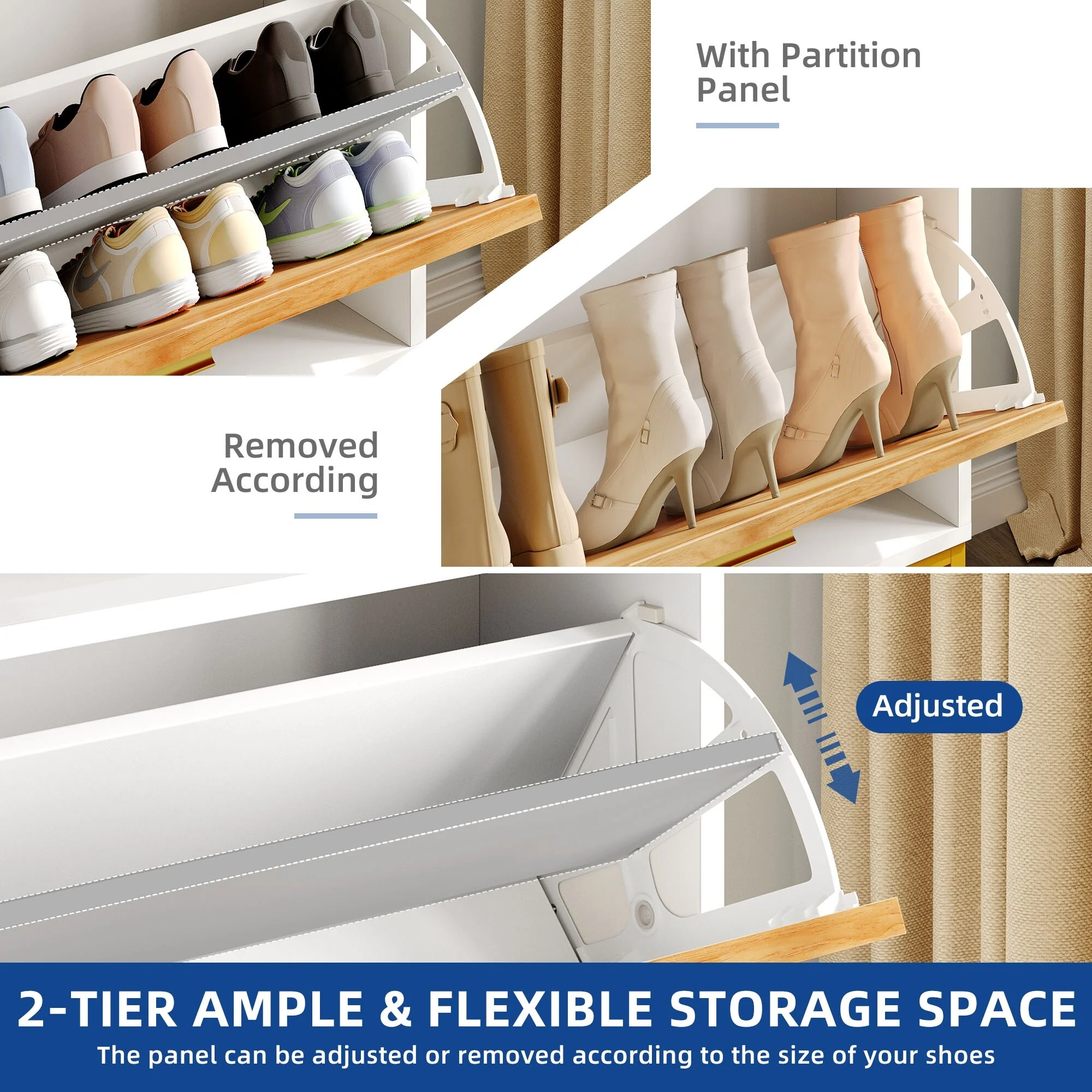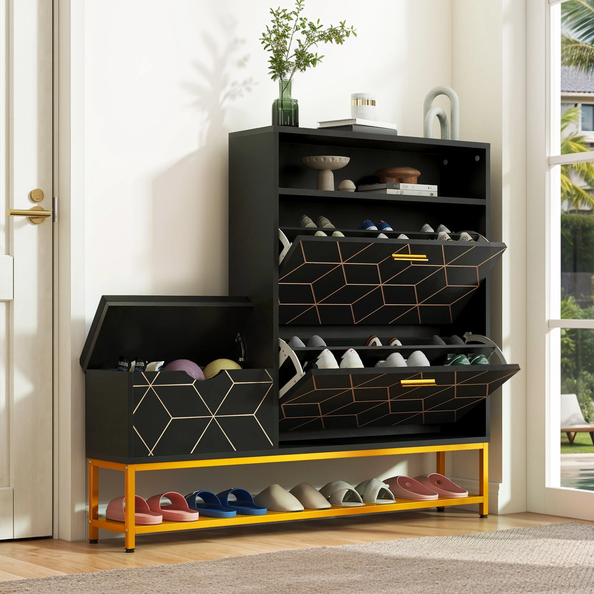 Our Space-Saving Shoe Cabinet is a perfect blend of function and style. Featuring 2 flip drawers, a top open shelf, and a storage shoe bench, it can comfortably accommodate 22 pairs of shoes. The modern design with a white and gold herringbone pattern adds a touch of elegance to any space. The soft leather seat cushion provides a comfortable place to change shoes and has hidden storage for additional items.