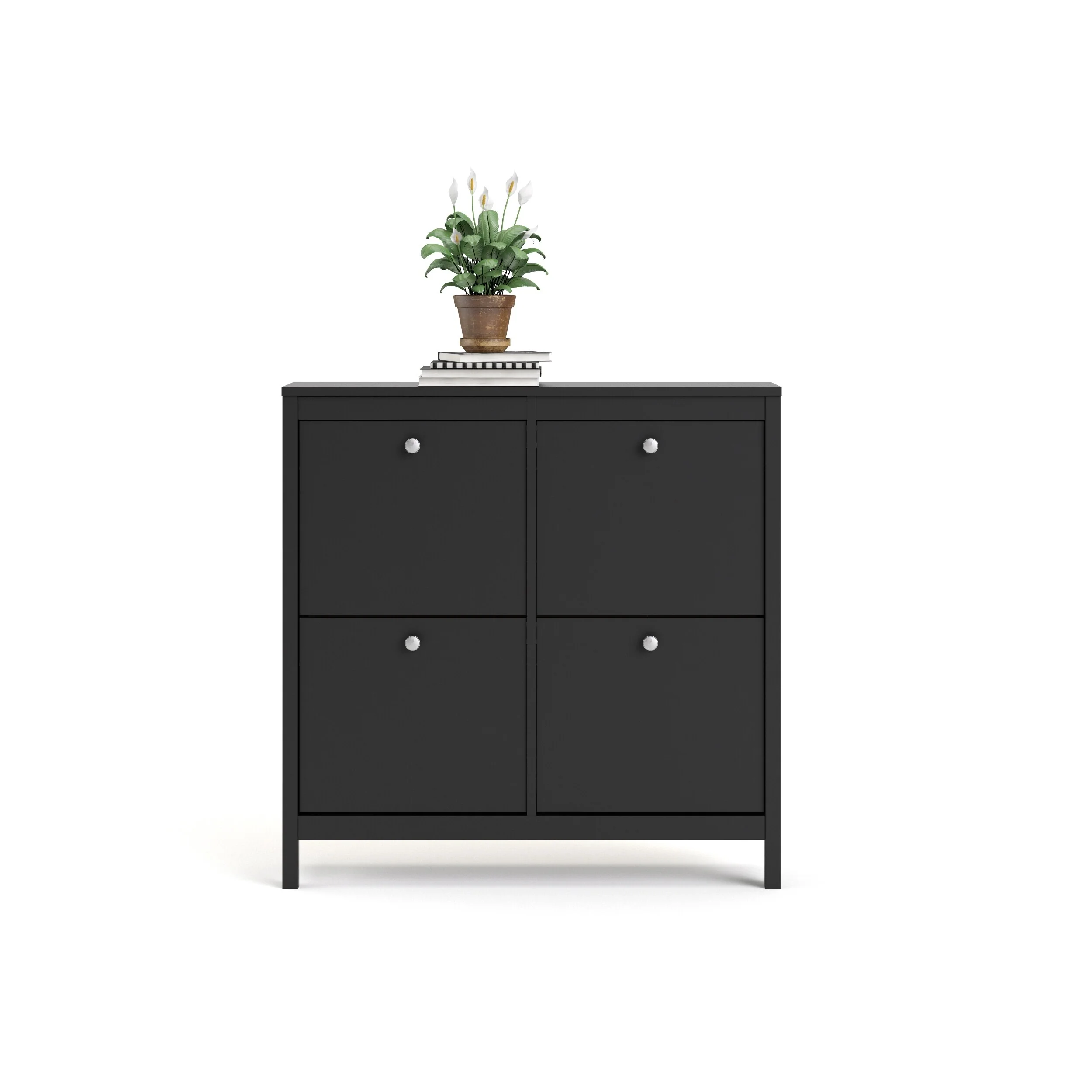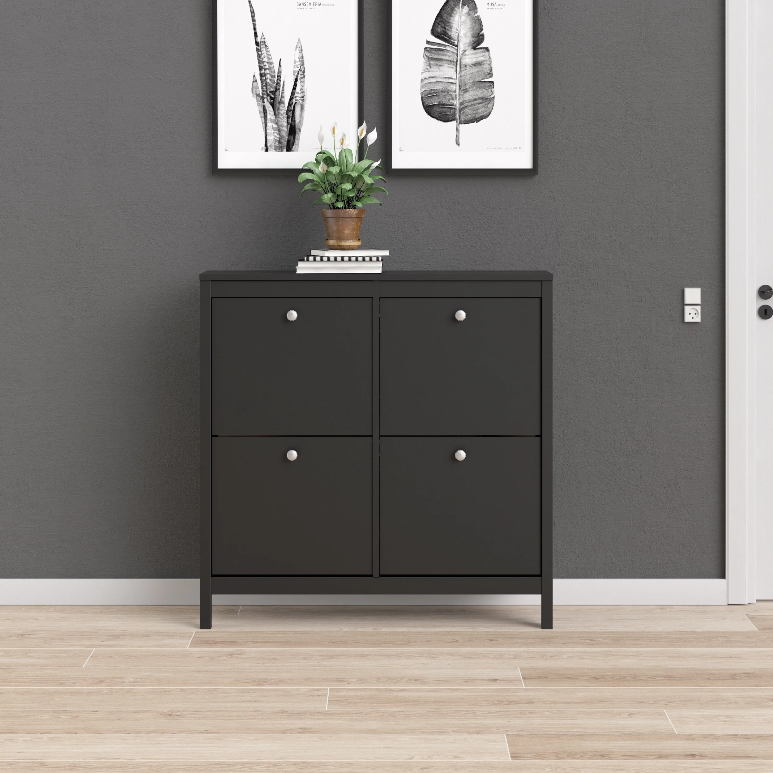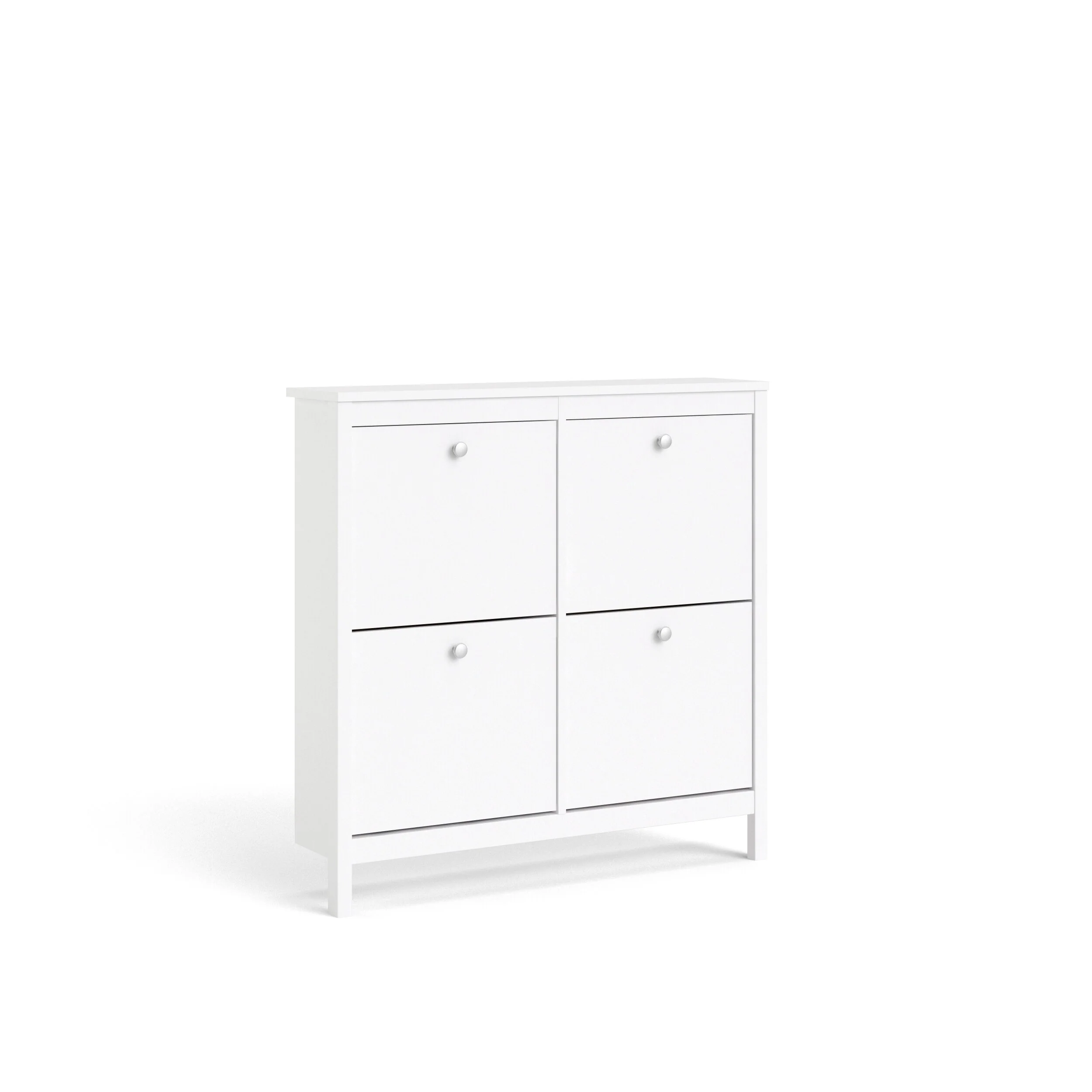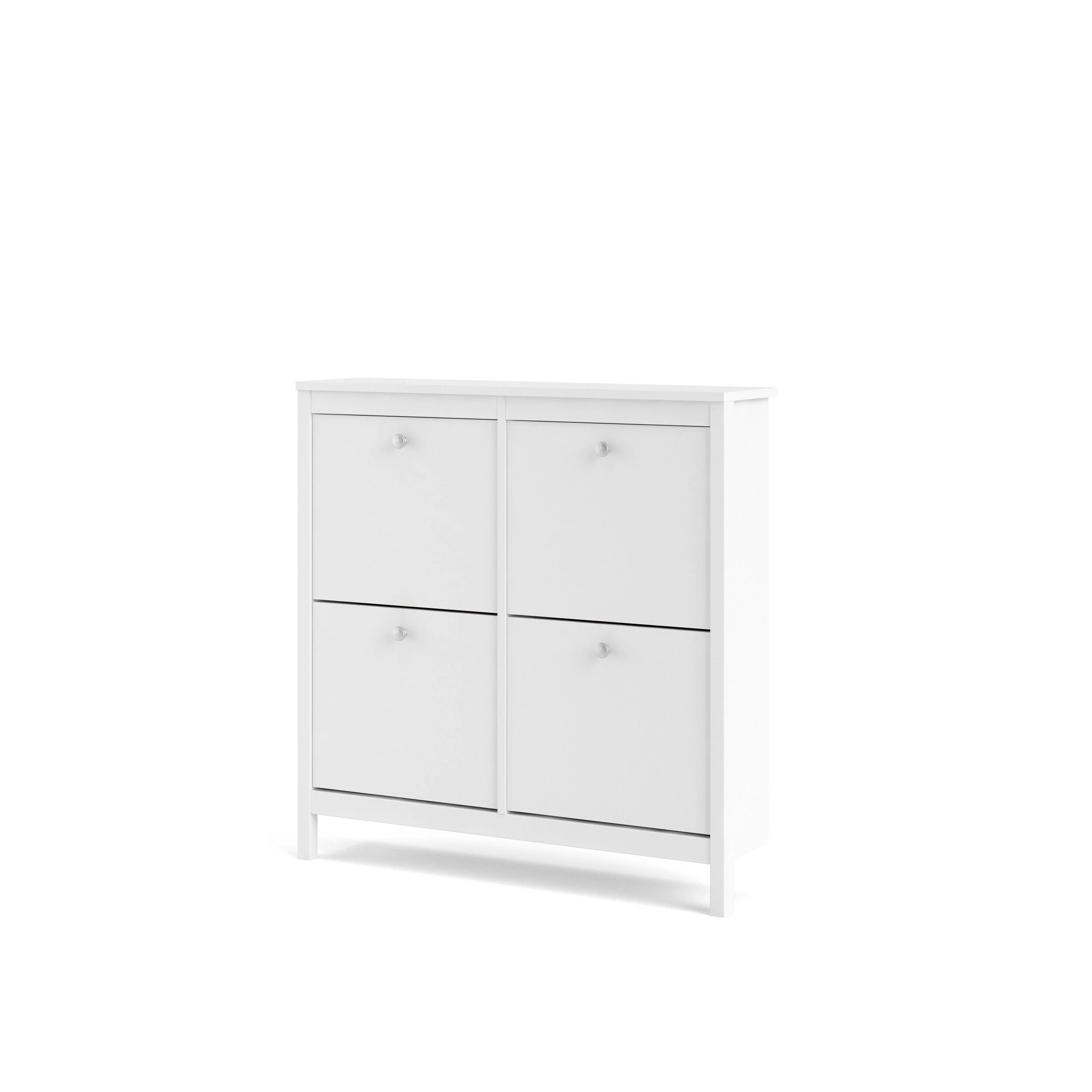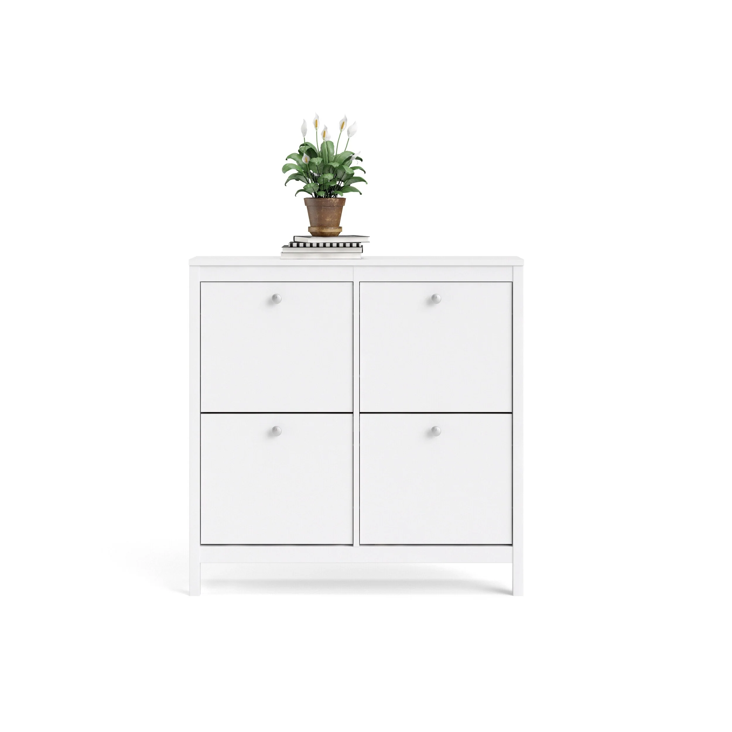 Upgrade your entryway with the Madrid 4-Drawer Shoe Cabinet from Porch & Den. This modern-traditional shoe cabinet is designed to keep your footwear in pristine condition while also adding a touch of sophistication to your decor. The foil surface is both easy to clean and durable, ensuring that this functional storage piece will last for years to come. With two rows of storage in each drawer, this shoe cabinet accommodates about 16 pairs of shoes, including men's size 12. The tilting drawers make it easy to access your shoes when you're in a hurry. Add the Porch & Den Madrid Shoe Cabinet to your living space and combine it with other pieces from the collection for a cohesive look.