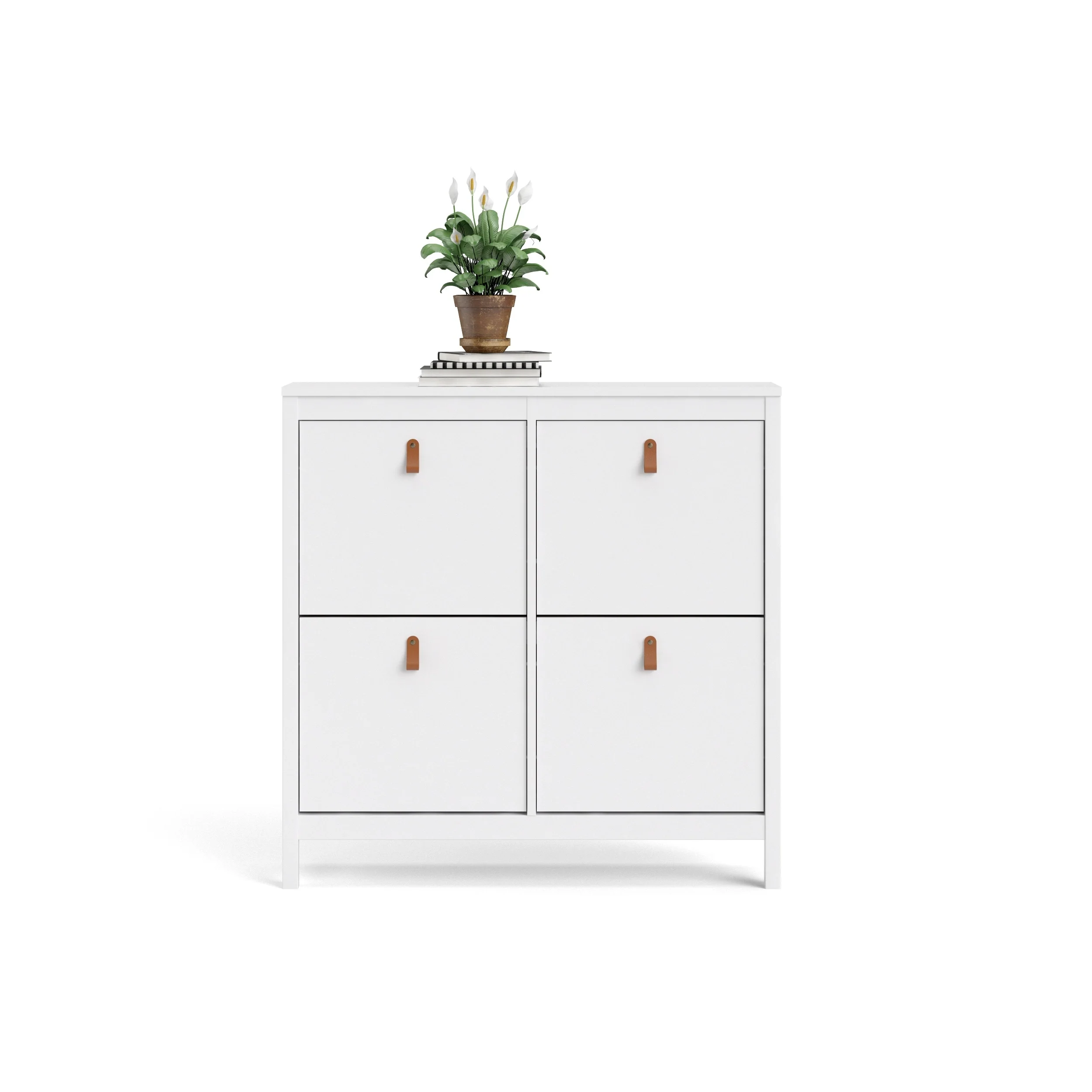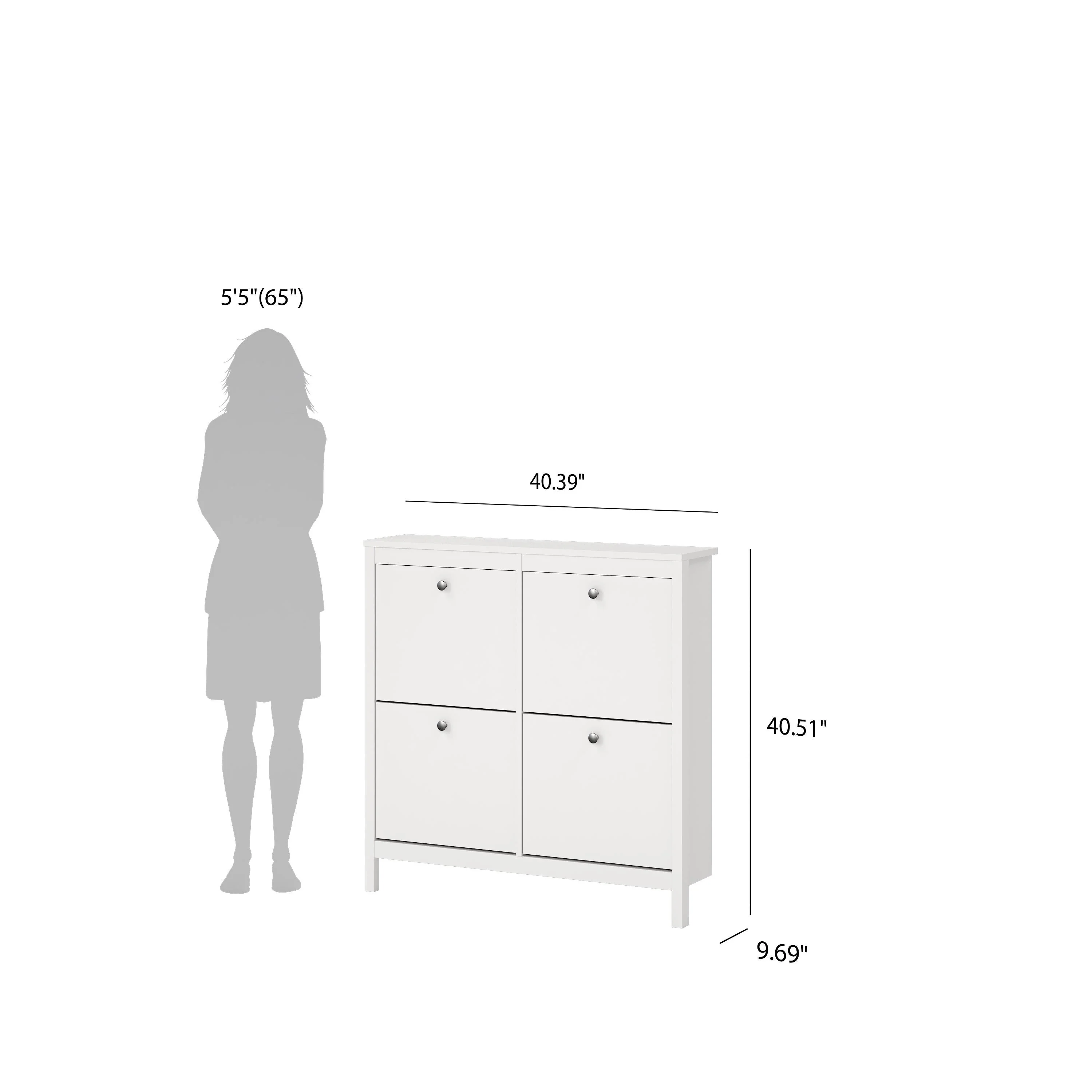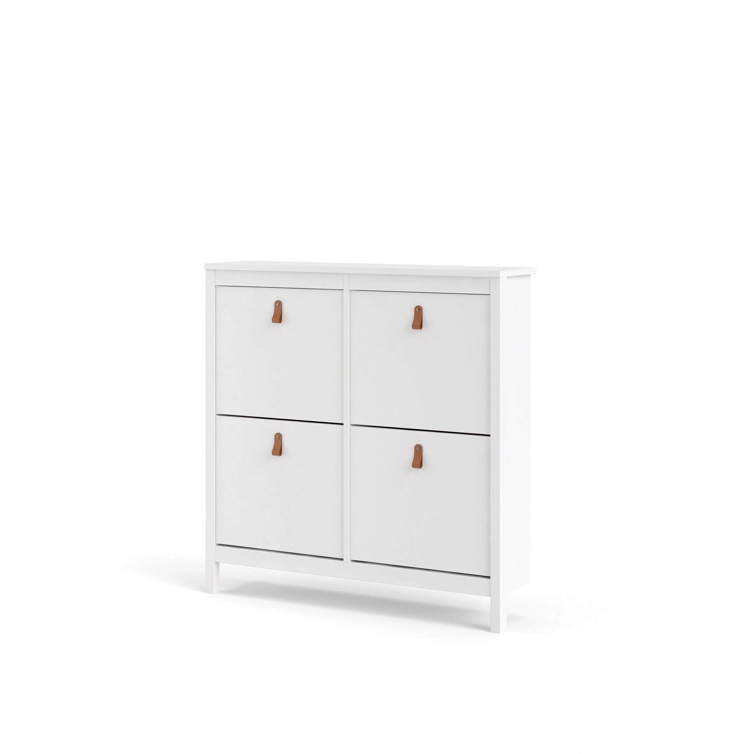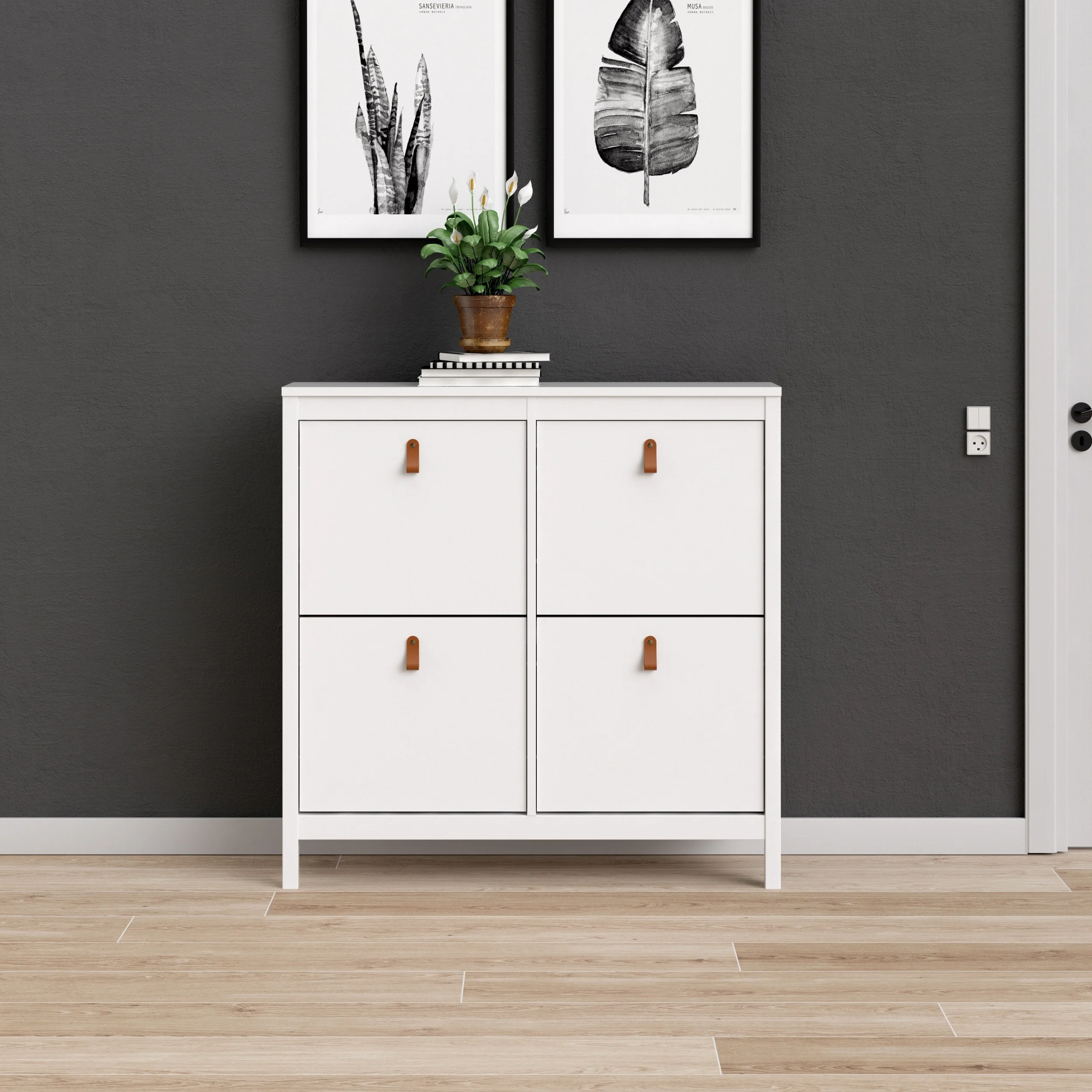 Upgrade your entryway with the Madrid 4-Drawer Shoe Cabinet from Porch & Den. This modern-traditional shoe cabinet is designed to keep your footwear in pristine condition while also adding a touch of sophistication to your decor. The foil surface is both easy to clean and durable, ensuring that this functional storage piece will last for years to come. With two rows of storage in each drawer, this shoe cabinet accommodates about 16 pairs of shoes, including men's size 12. The tilting drawers make it easy to access your shoes when you're in a hurry. Add the Porch & Den Madrid Shoe Cabinet to your living space and combine it with other pieces from the collection for a cohesive look.