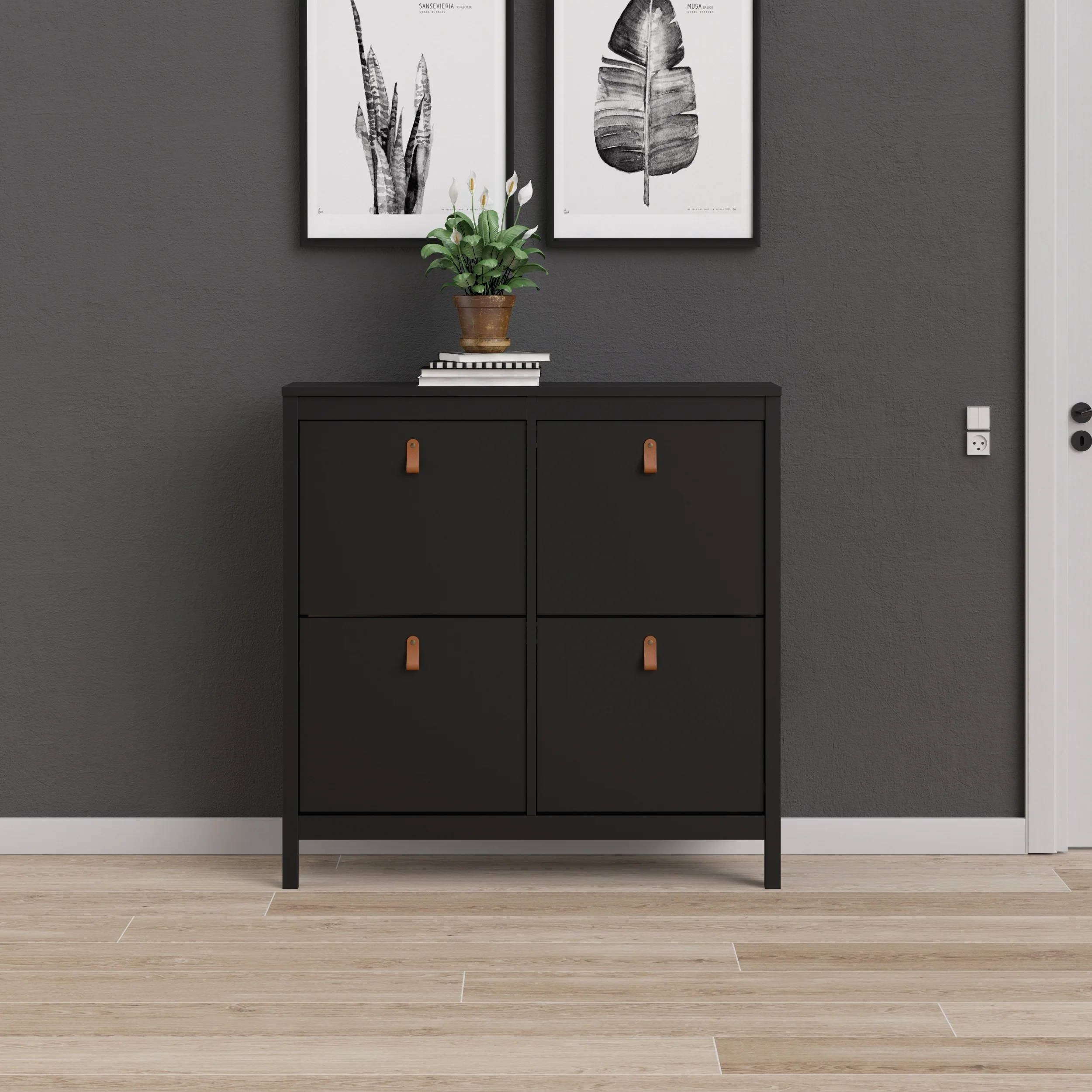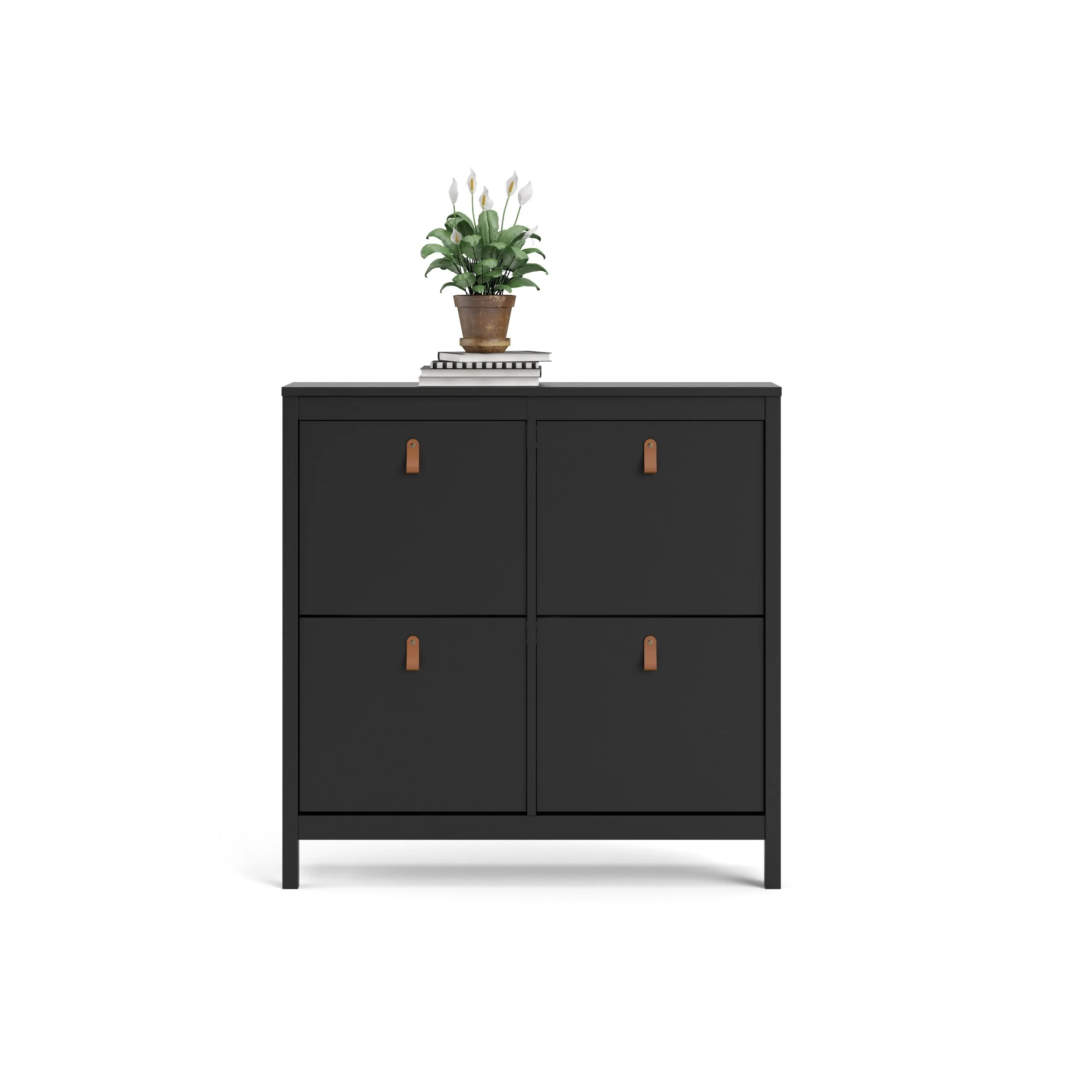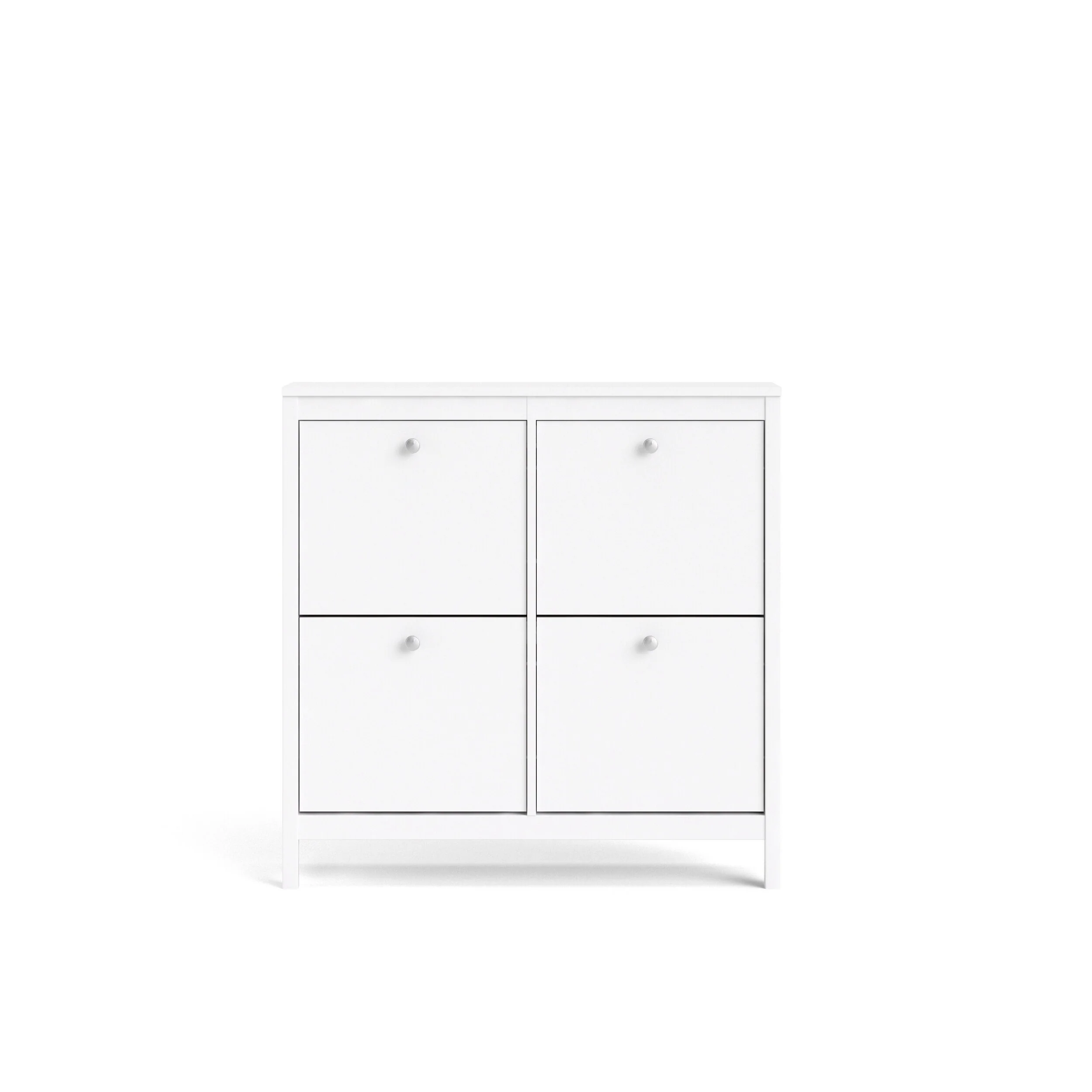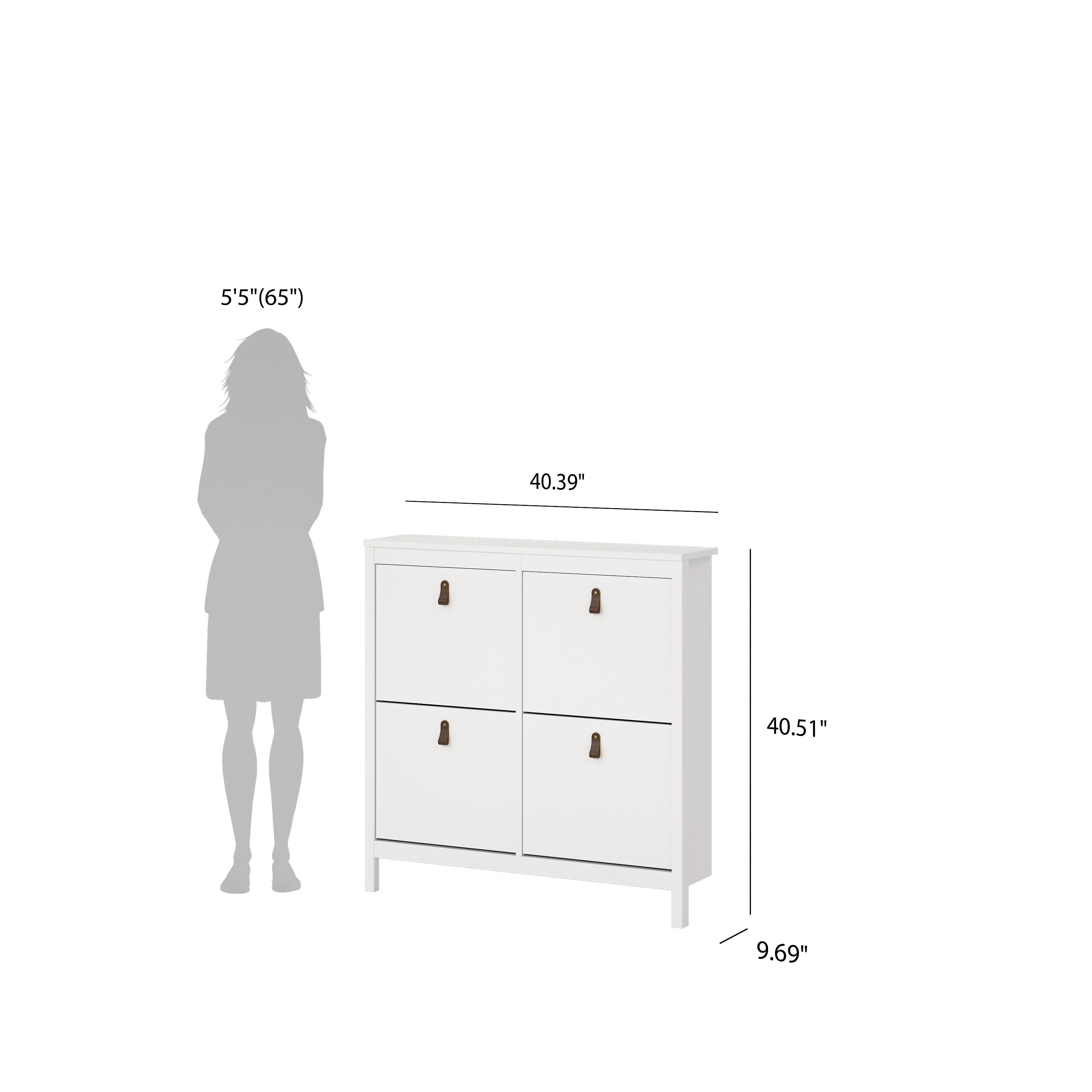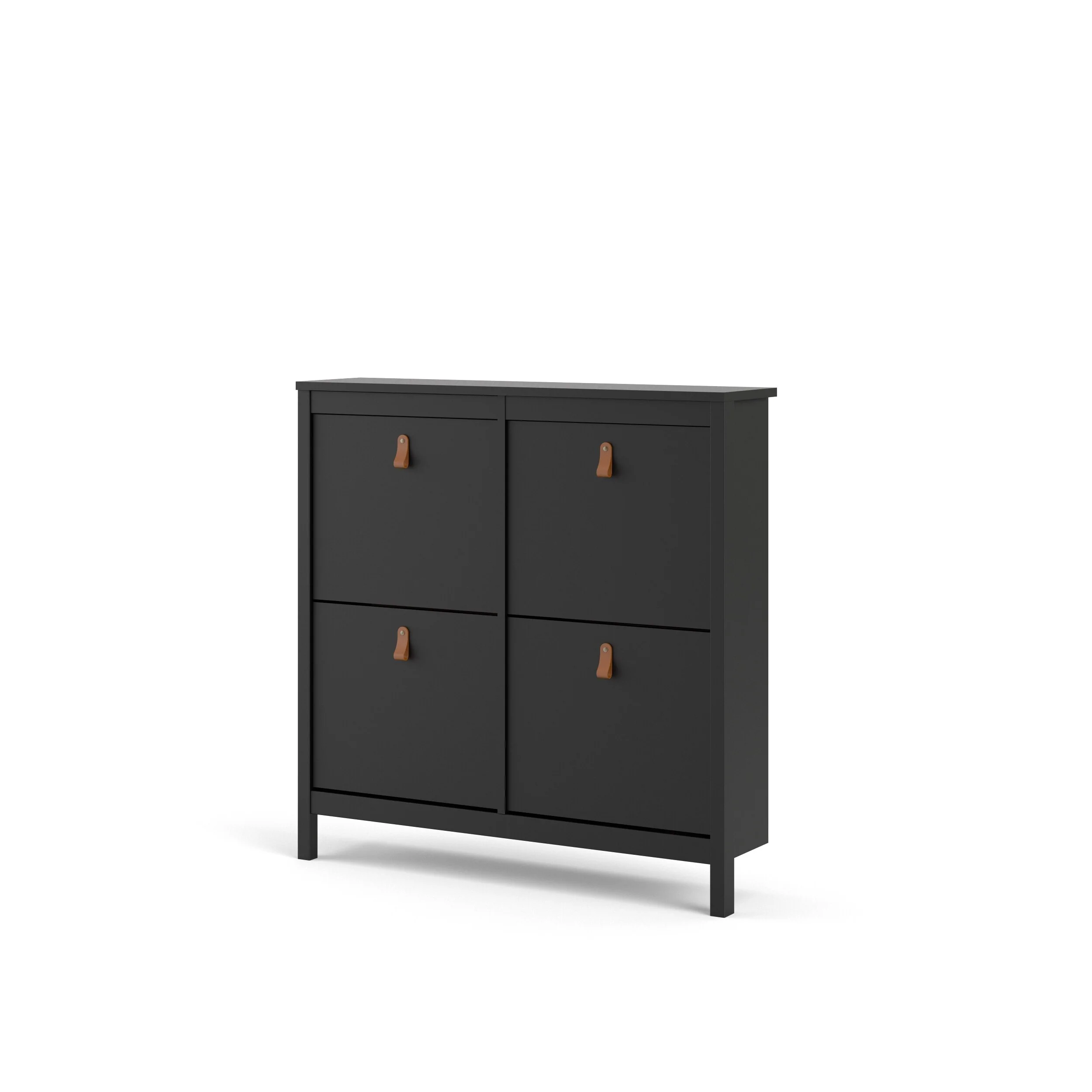 Upgrade your entryway with the Madrid 4-Drawer Shoe Cabinet from Porch & Den. This modern-traditional shoe cabinet is designed to keep your footwear in pristine condition while also adding a touch of sophistication to your decor. The foil surface is both easy to clean and durable, ensuring that this functional storage piece will last for years to come. With two rows of storage in each drawer, this shoe cabinet accommodates about 16 pairs of shoes, including men's size 12. The tilting drawers make it easy to access your shoes when you're in a hurry. Add the Porch & Den Madrid Shoe Cabinet to your living space and combine it with other pieces from the collection for a cohesive look.
