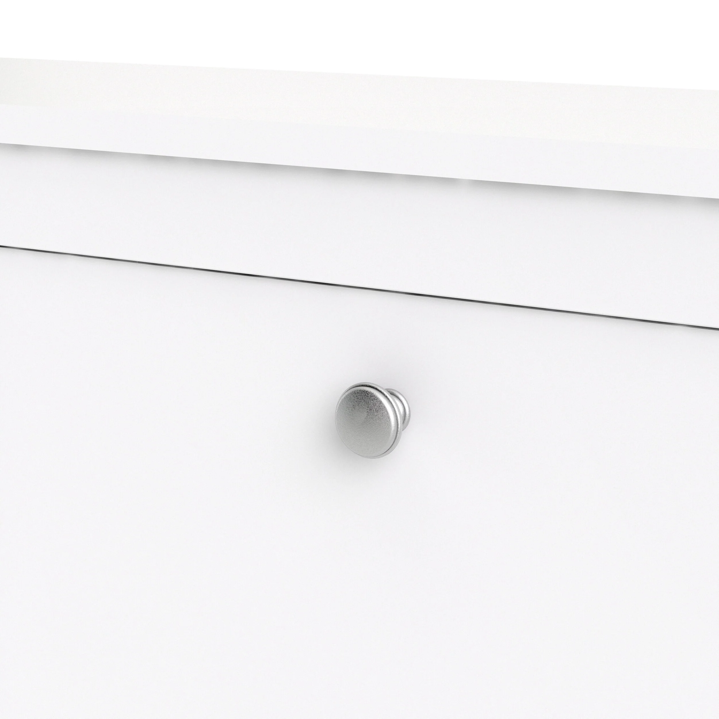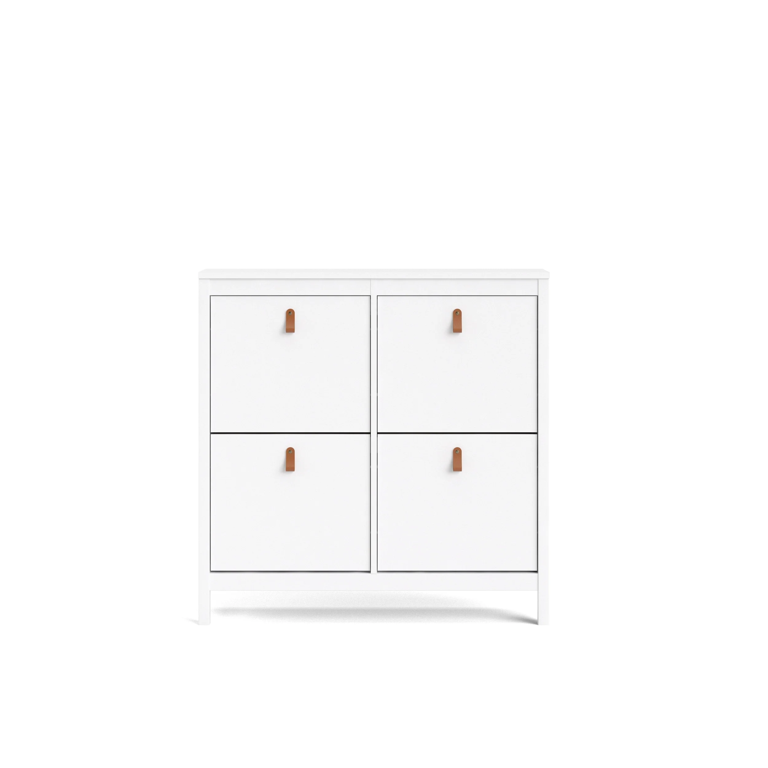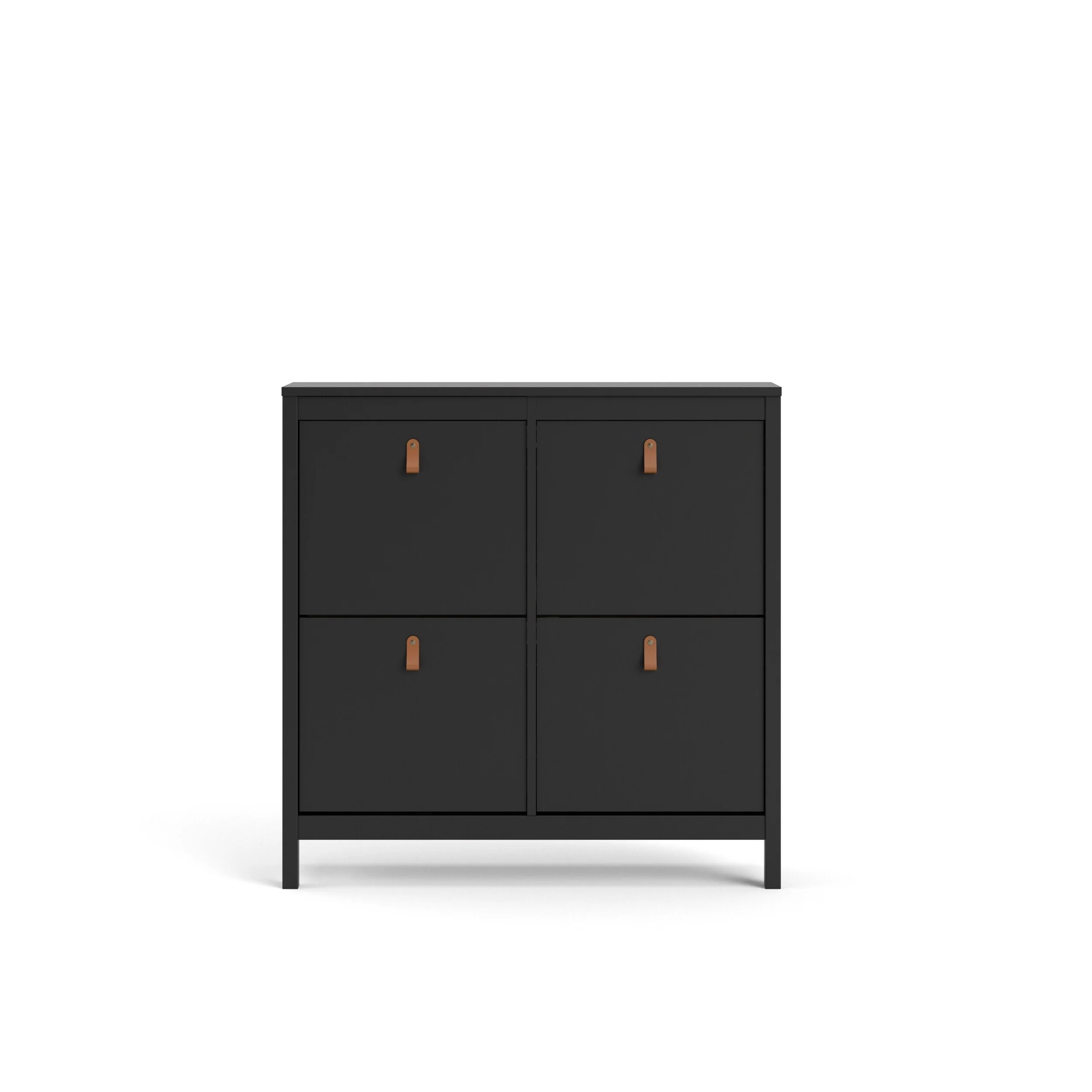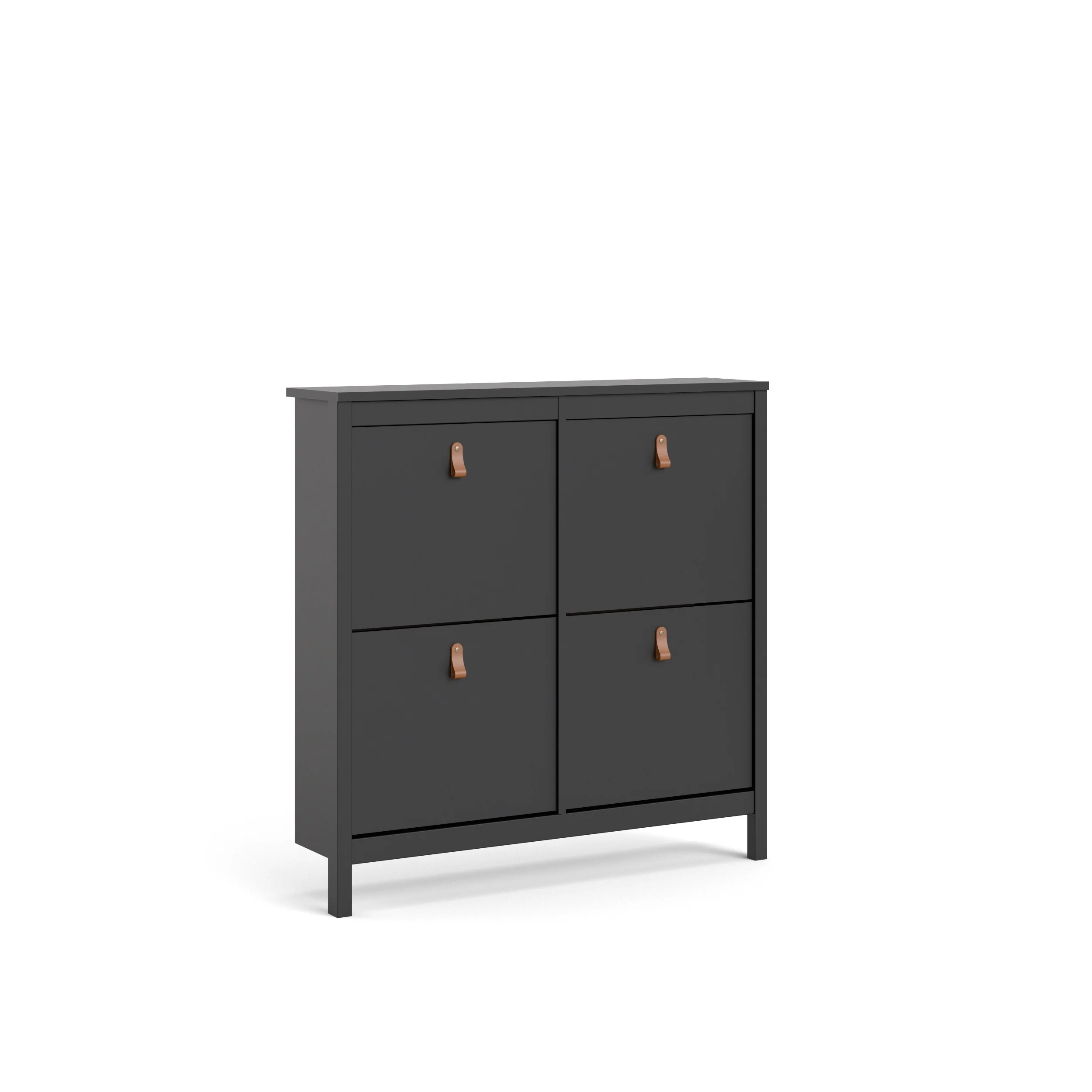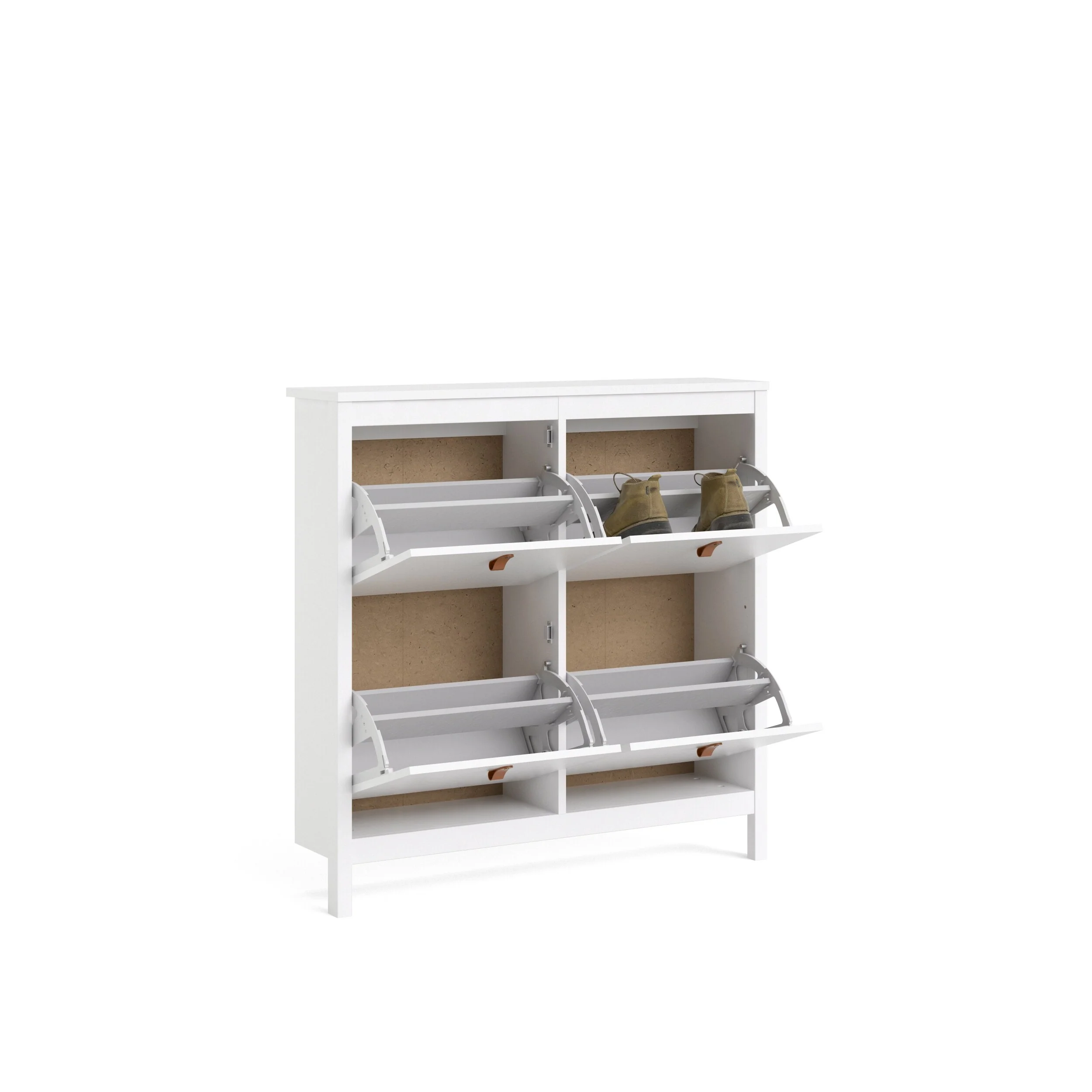 Upgrade your entryway with the Madrid 4-Drawer Shoe Cabinet from Porch & Den. This modern-traditional shoe cabinet is designed to keep your footwear in pristine condition while also adding a touch of sophistication to your decor. The foil surface is both easy to clean and durable, ensuring that this functional storage piece will last for years to come. With two rows of storage in each drawer, this shoe cabinet accommodates about 16 pairs of shoes, including men's size 12. The tilting drawers make it easy to access your shoes when you're in a hurry. Add the Porch & Den Madrid Shoe Cabinet to your living space and combine it with other pieces from the collection for a cohesive look.