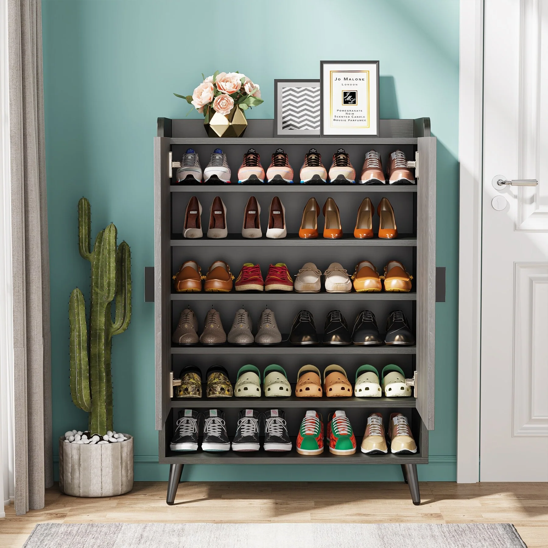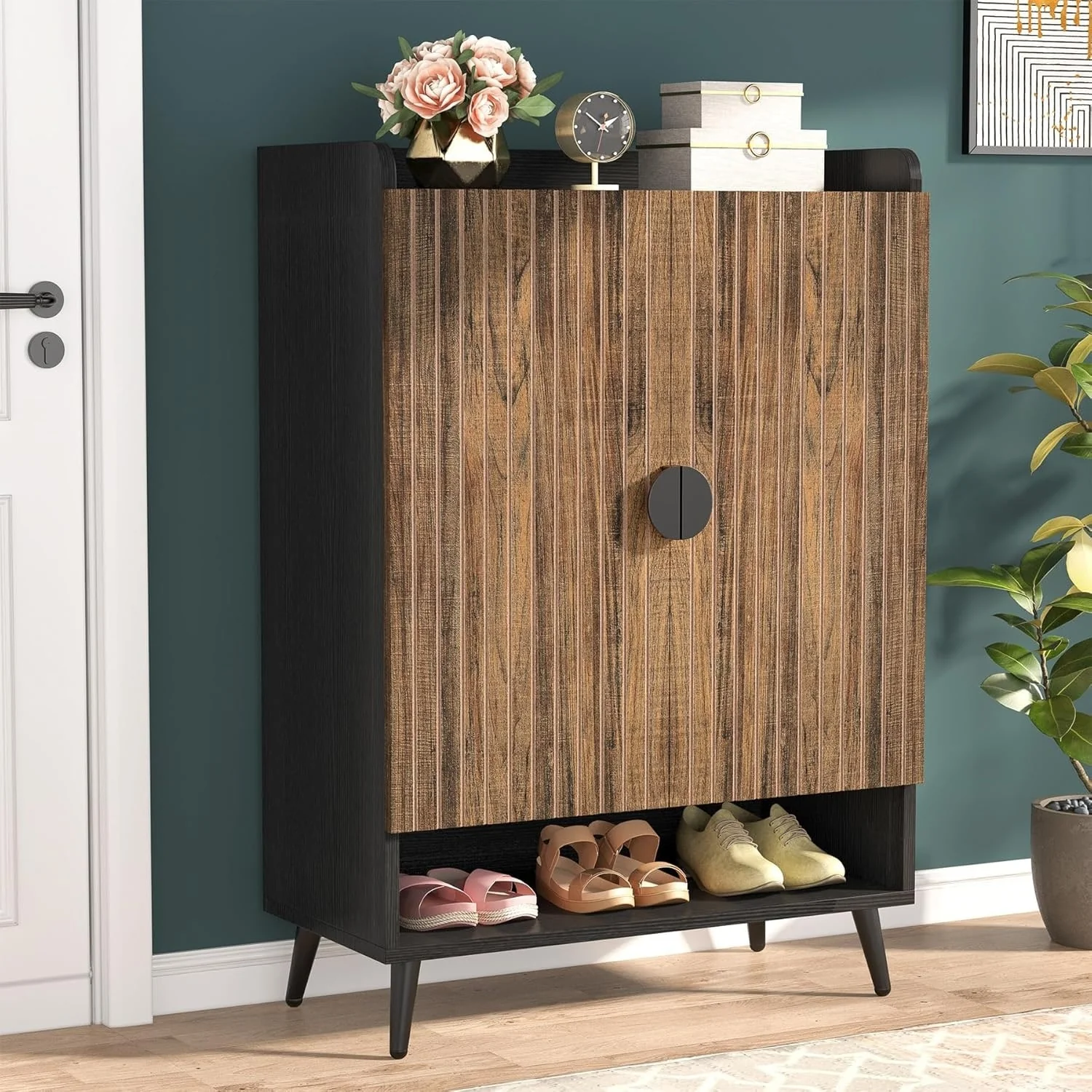 SIMPLE AND COMPACT DESIGN: Simple design plus powerful function, this storage cabinet is not only as a shoe shelf, but also can be as a kitchen storage cabinet. With two swinging doors, this cabinet offers plenty of hidden storage to keep your home clutter-free. The space-saving vertical storage design is an ideal storage solution for your hallway, entryway, closet, dormitory, garage.