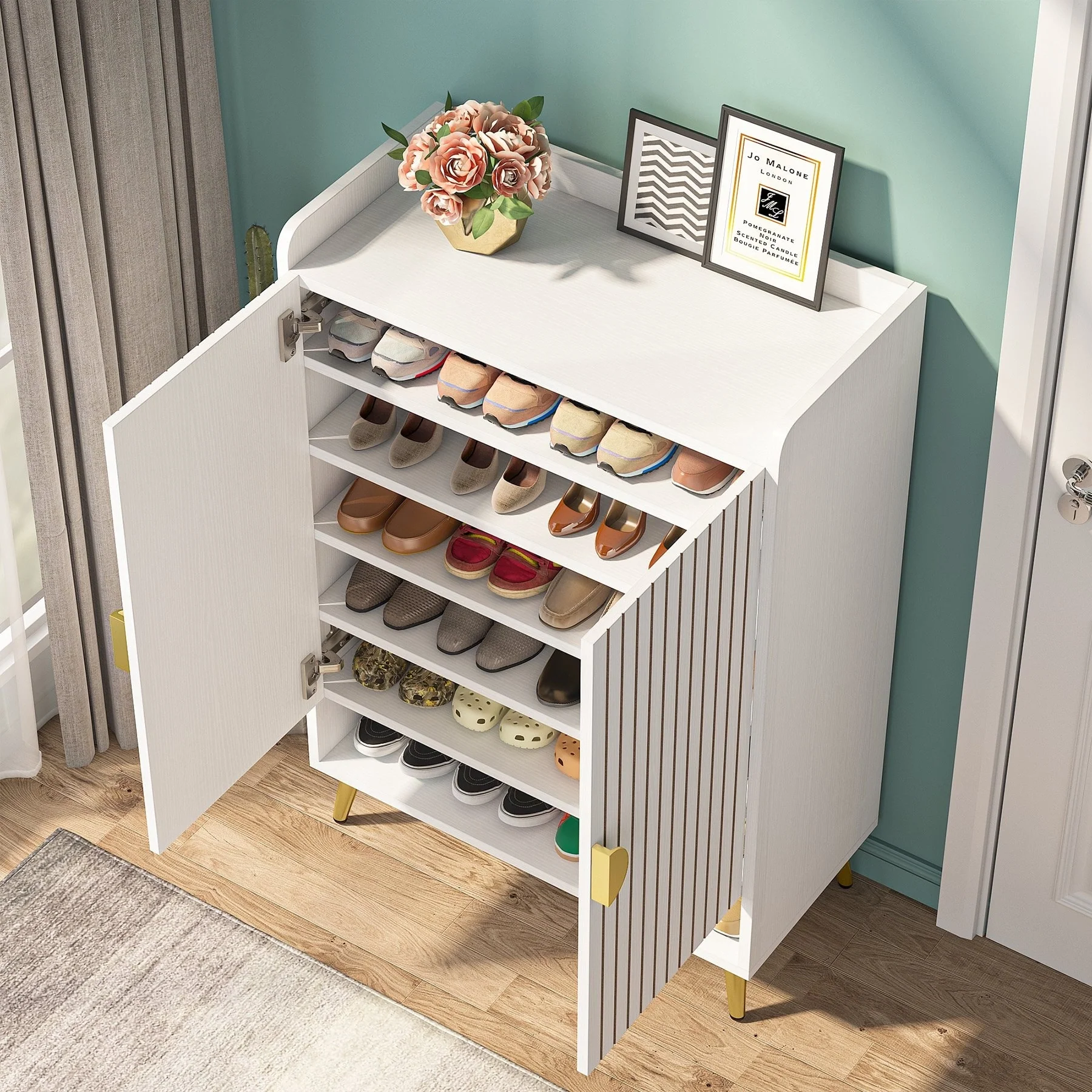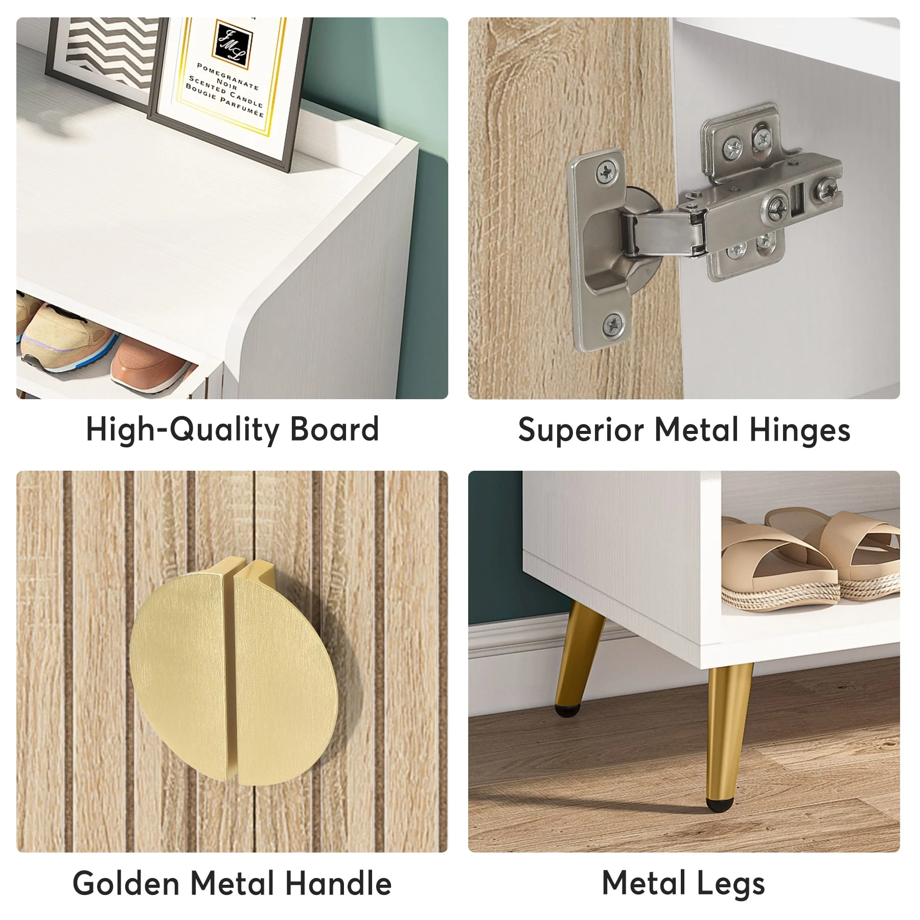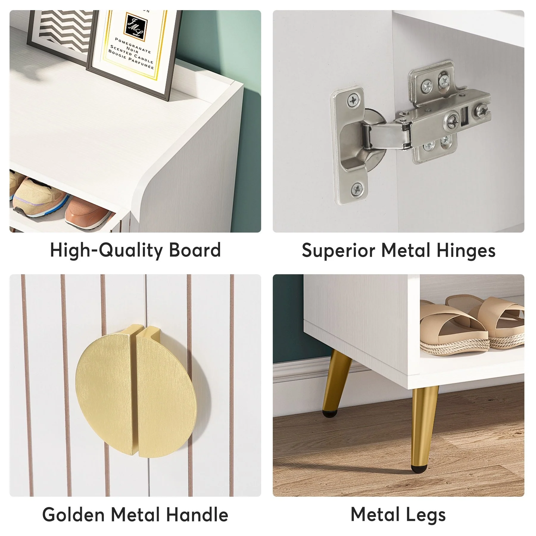 ELEGANT HOME DECOR: Crafted with wooden board and finely polished with water-proof and wear-resistant white paint, this eye-catching shoes cabinet with doors will impress your friends deeply when they enter your home. Sleek white with golden metal handles and legs, adds a warm touch and some modern flair, to be decorative enough to suit any corner of your house.