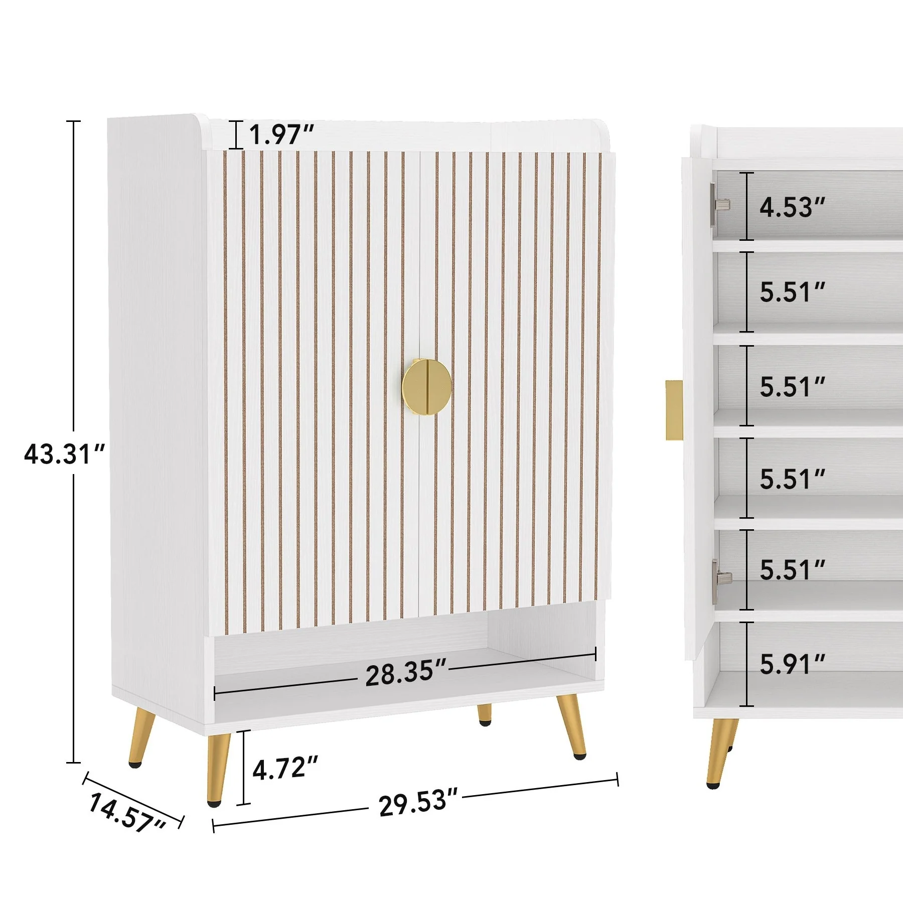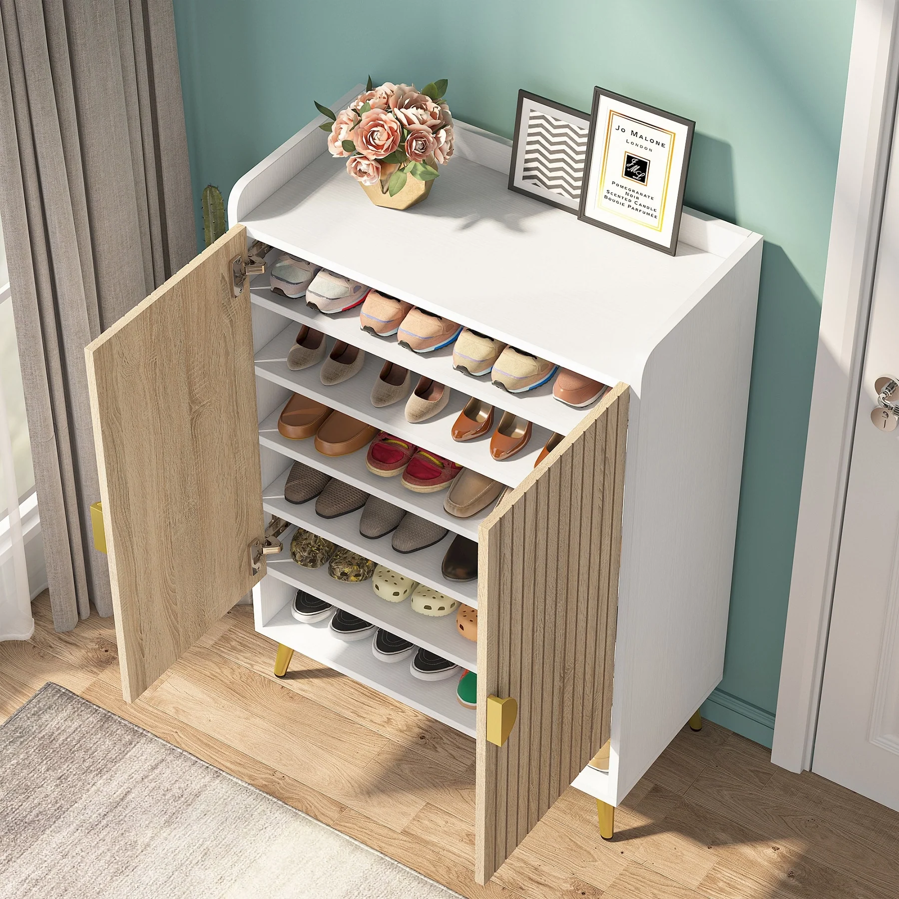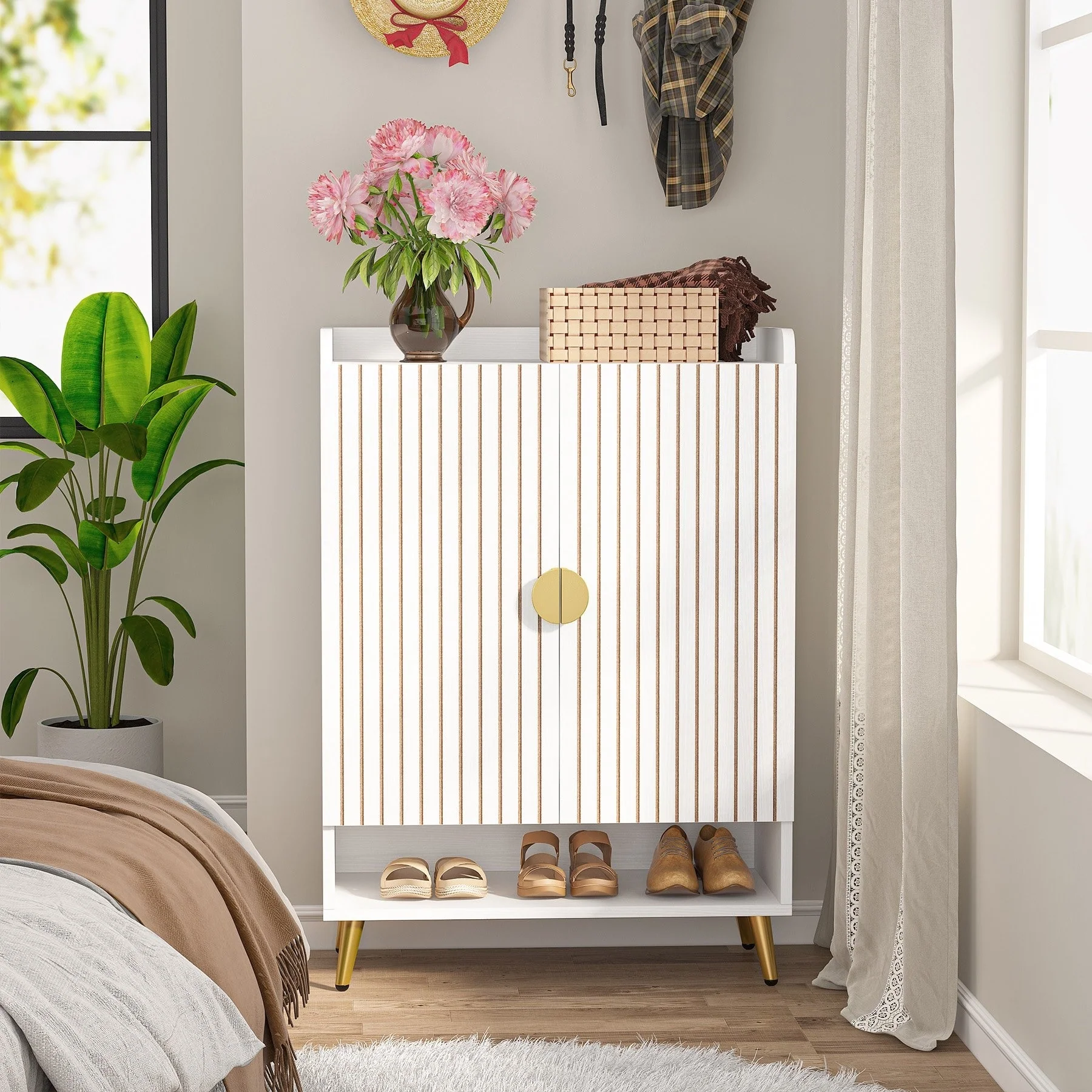 ELEGANT HOME DECOR: Crafted with wooden board and finely polished with water-proof and wear-resistant white paint, this eye-catching shoes cabinet with doors will impress your friends deeply when they enter your home. Sleek white with golden metal handles and legs, adds a warm touch and some modern flair, to be decorative enough to suit any corner of your house.