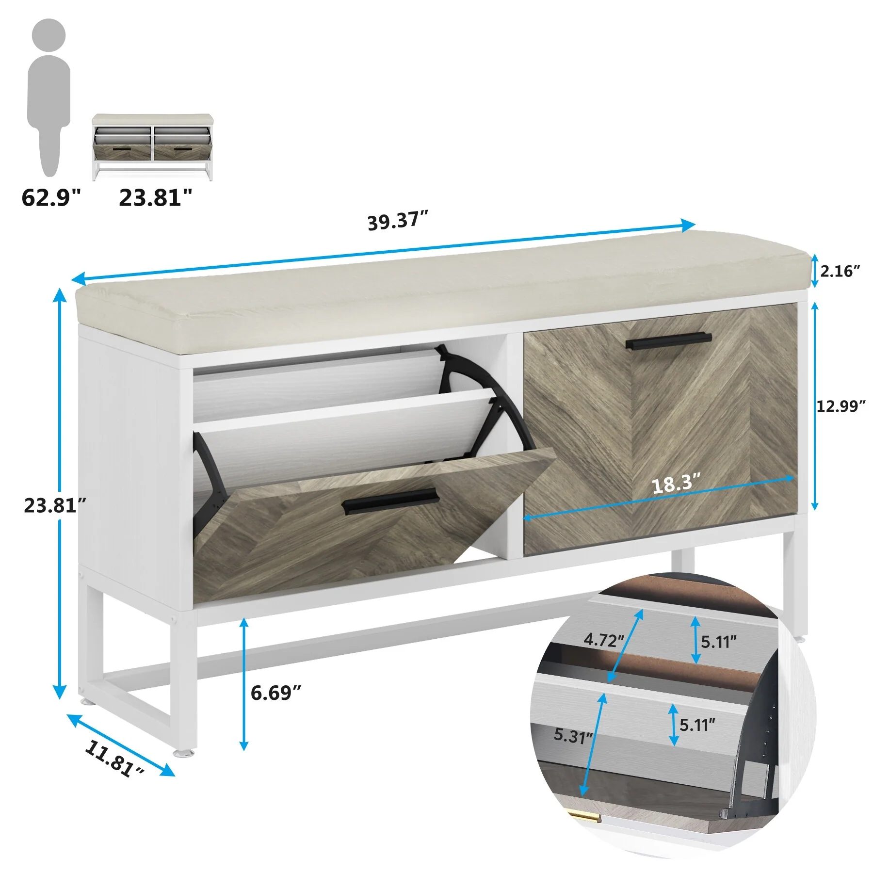 - Flip Drawers Shoe Storage: Featuring with 2 flip drawers shoe storage, this shoe bench can store up to 10-12 pairs shoes (depending on the sizes of shoes), keeping your shoes well organized and reduce clutter.
