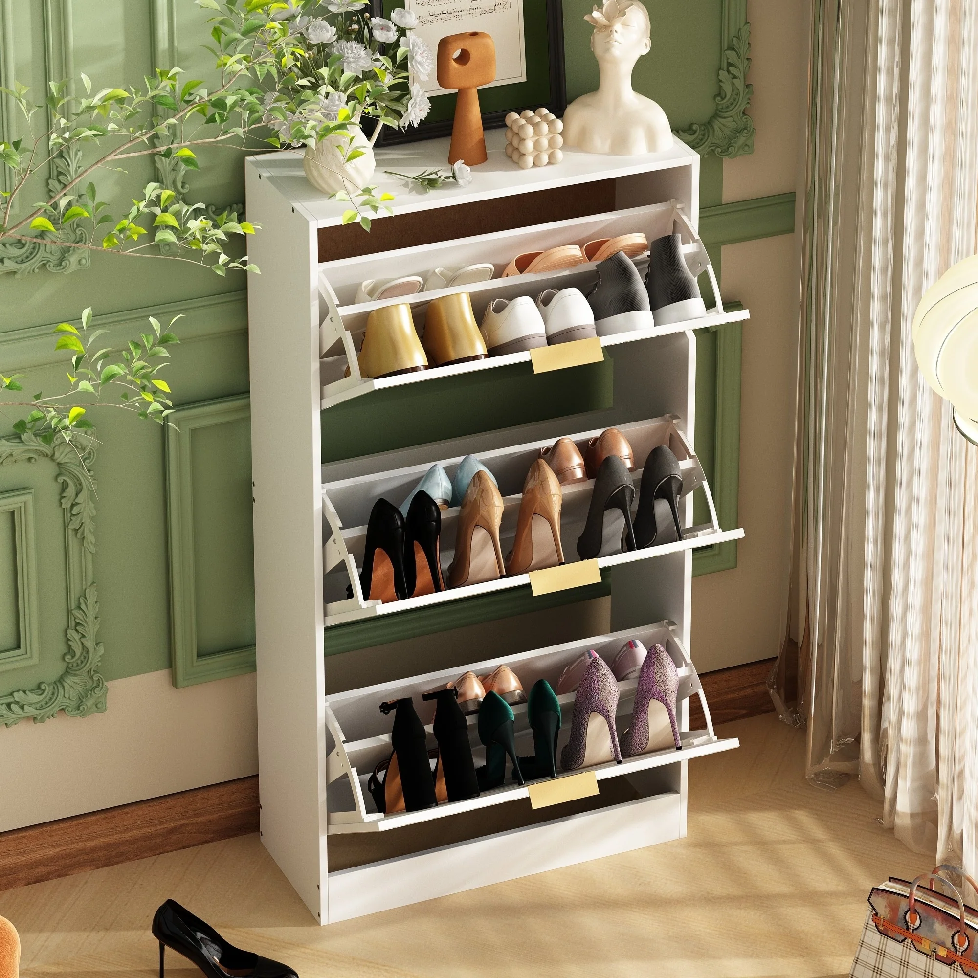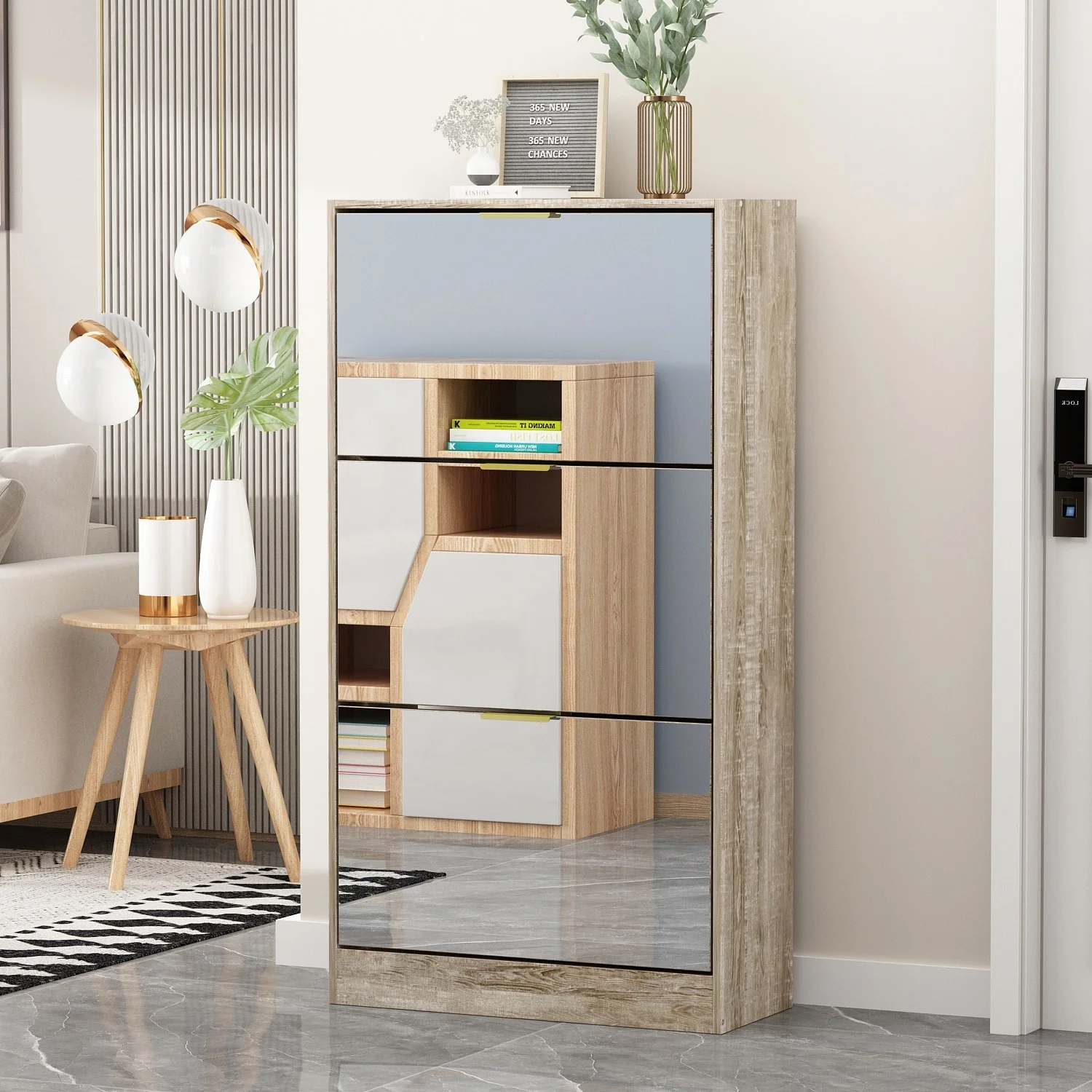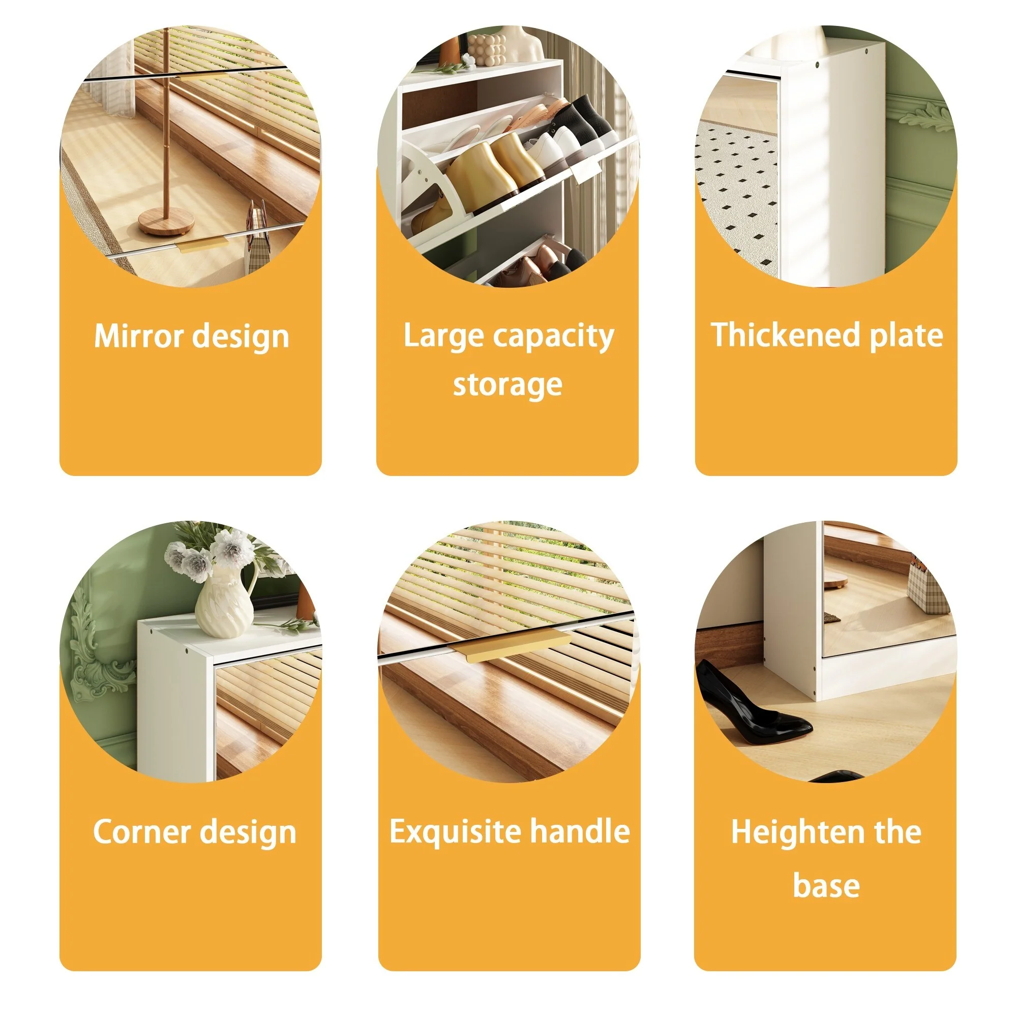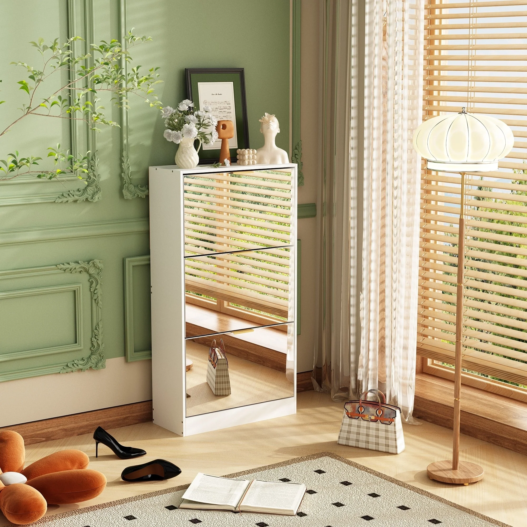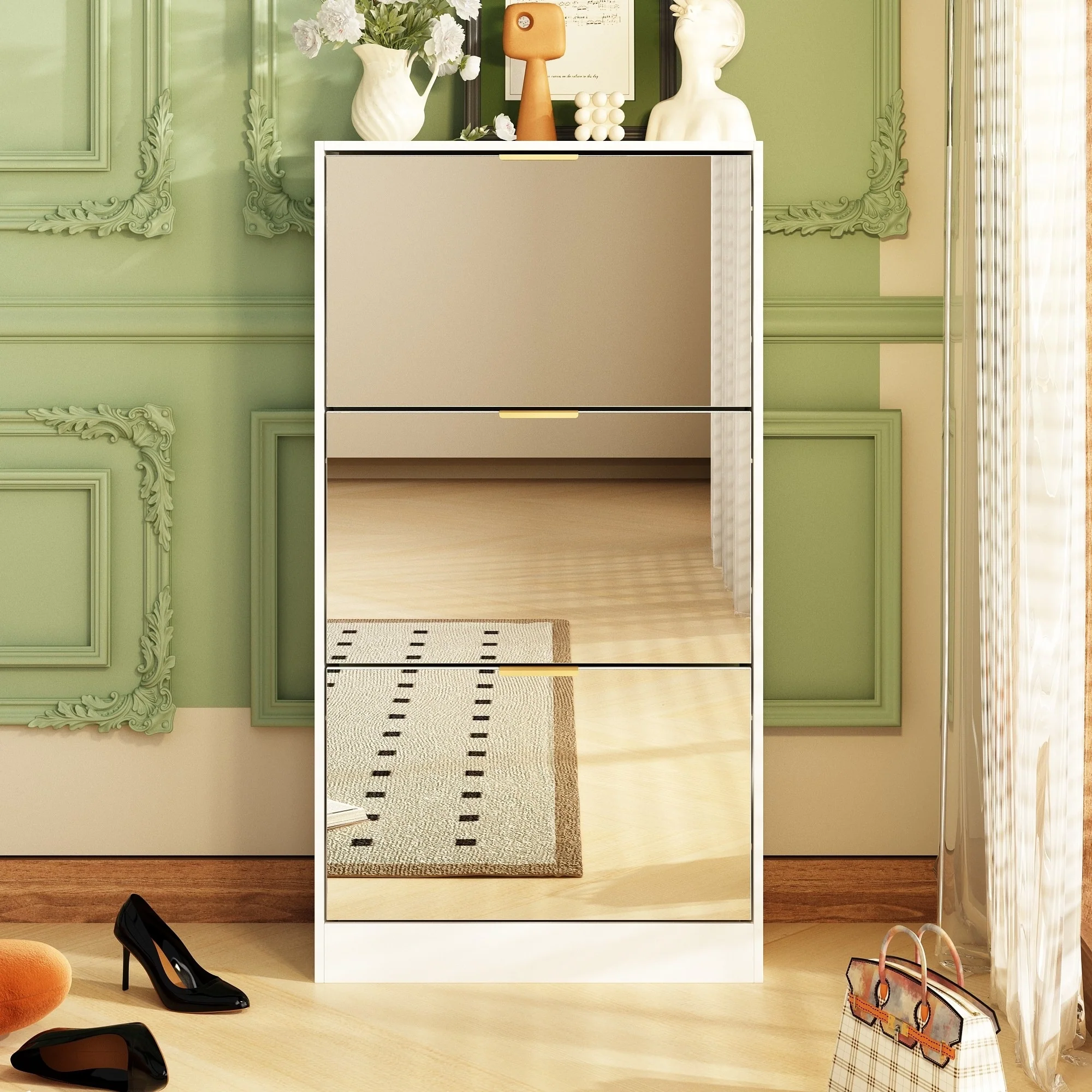 Keep your entryway organized and stylish with the Timechee Mirrored Flip Drawer Shoe Cabinet. The unique mirrored flip drawer design adds a touch of elegance and convenience to your daily routine. This shoe cabinet boasts ample storage with 3 spacious flip drawers and 1 divider in each, providing flexible storage space for your shoes. Constructed with safety and solid MDF board, this shoe cabinet is durable and stable, while the smooth veneer surface makes it easy to clean. With detailed instructions and labeled pieces, assembly is a breeze. Dimensions: 22.4”(W) x 9.6”(D) x 42.1”(H).