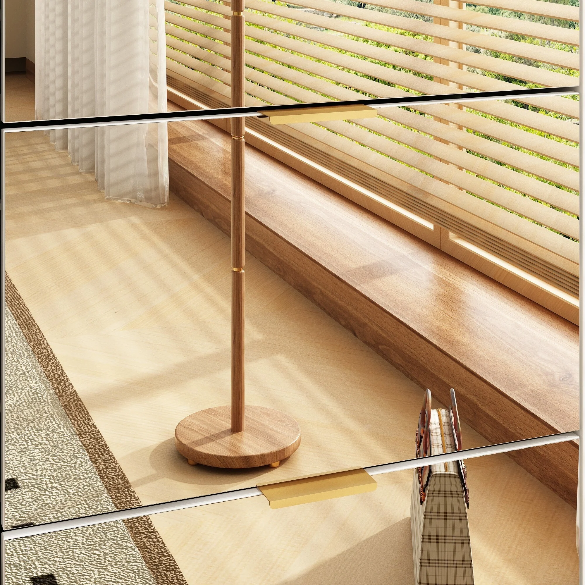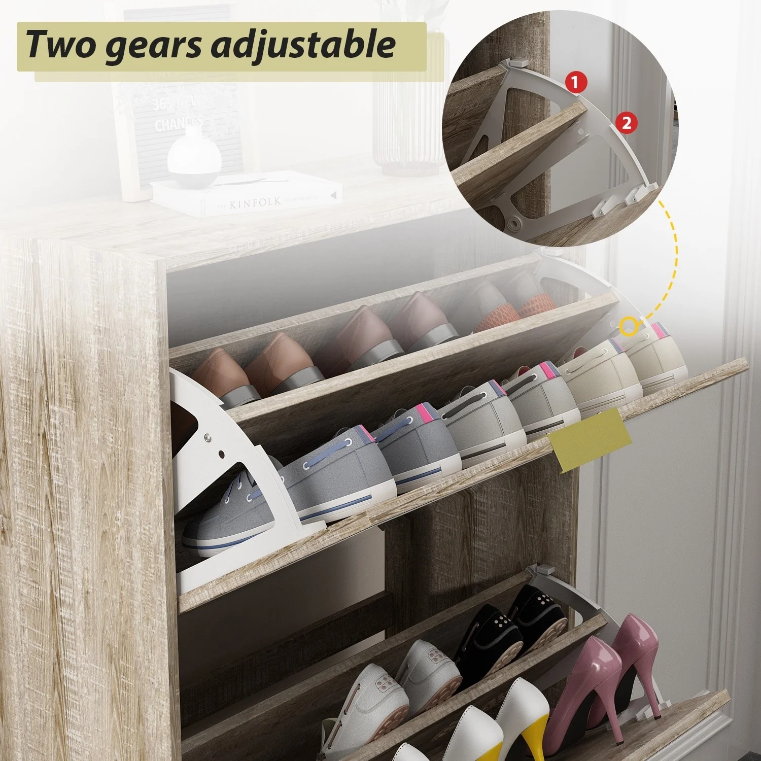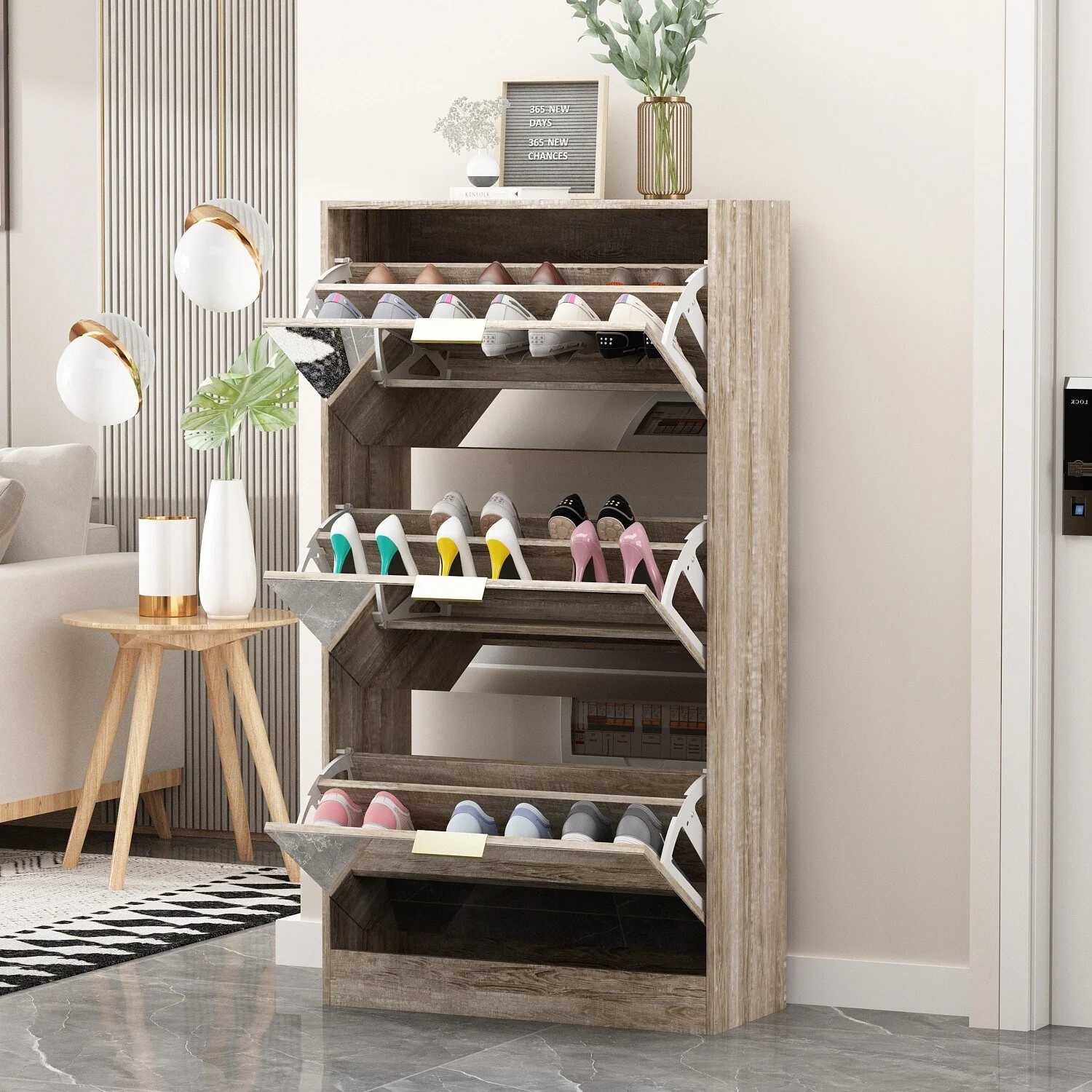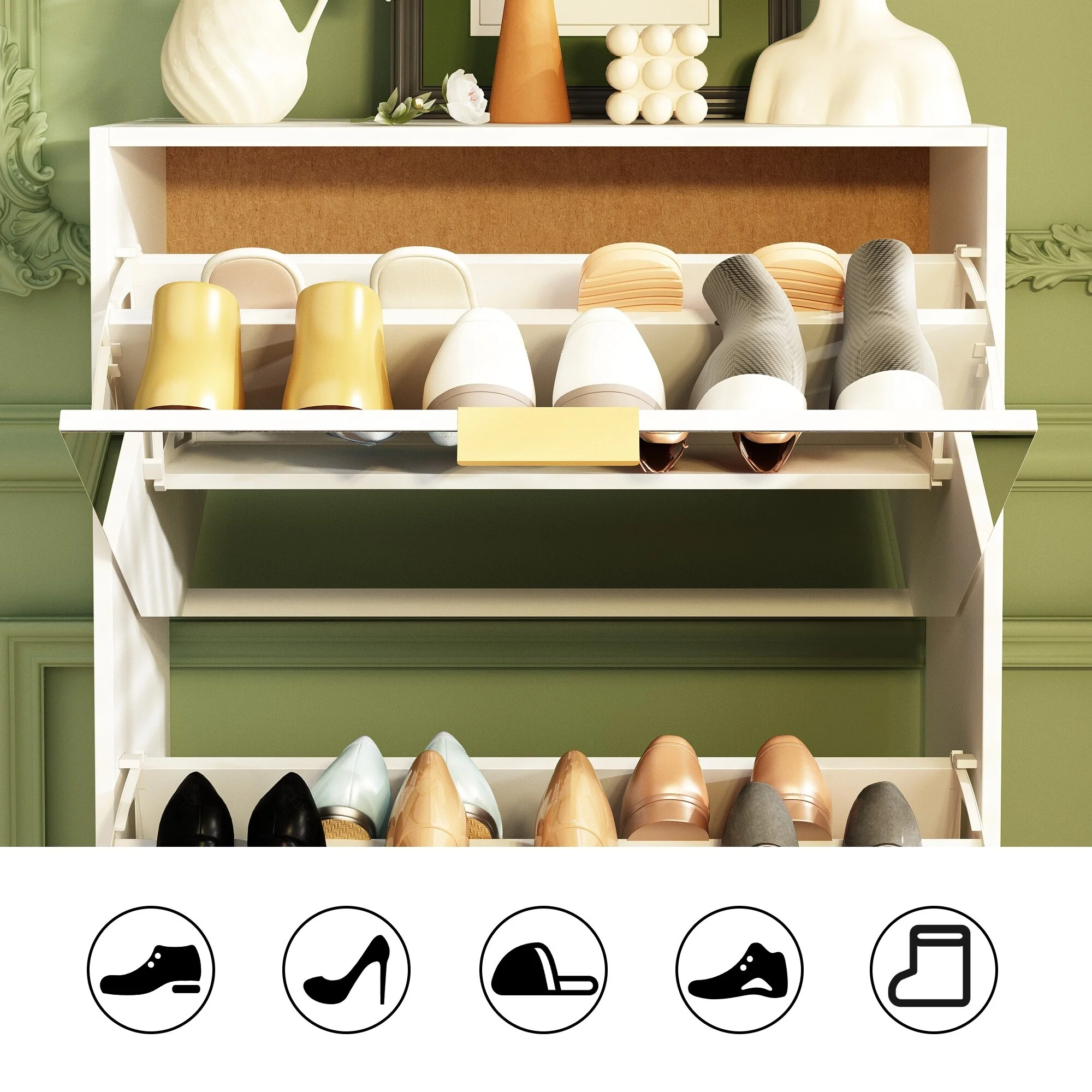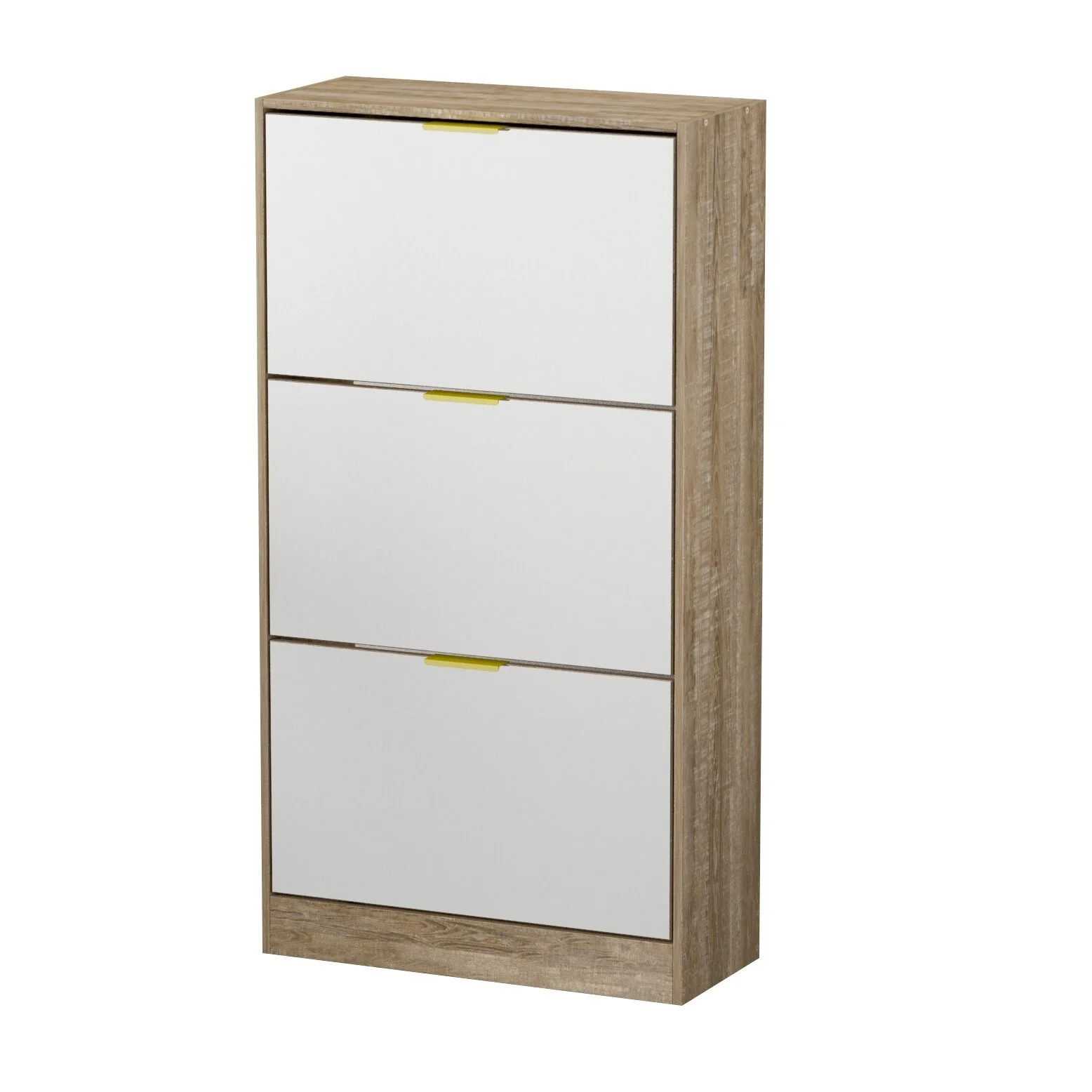 Keep your entryway organized and stylish with the Timechee Mirrored Flip Drawer Shoe Cabinet. The unique mirrored flip drawer design adds a touch of elegance and convenience to your daily routine. This shoe cabinet boasts ample storage with 3 spacious flip drawers and 1 divider in each, providing flexible storage space for your shoes. Constructed with safety and solid MDF board, this shoe cabinet is durable and stable, while the smooth veneer surface makes it easy to clean. With detailed instructions and labeled pieces, assembly is a breeze. Dimensions: 22.4”(W) x 9.6”(D) x 42.1”(H).