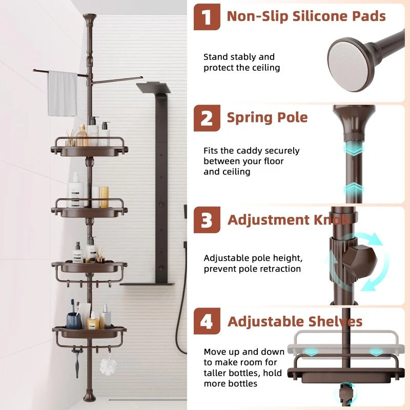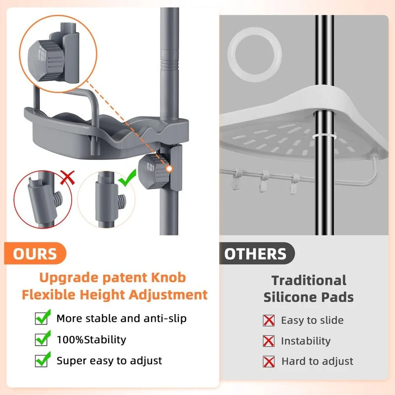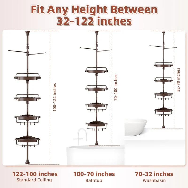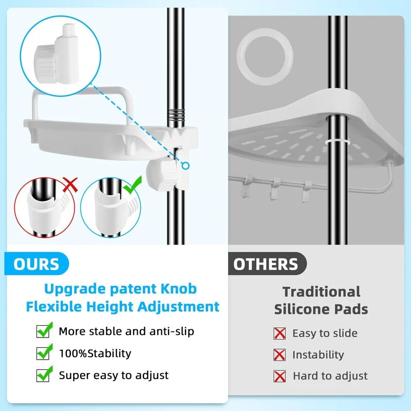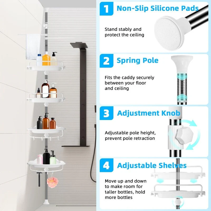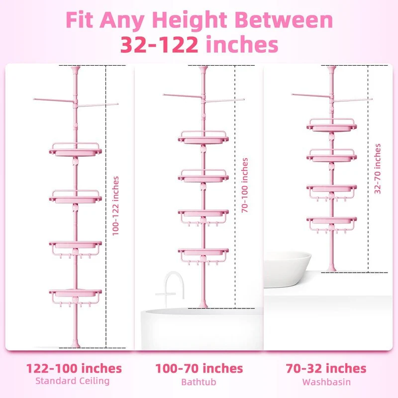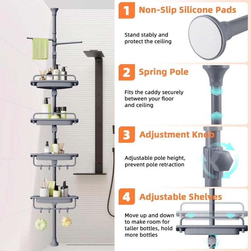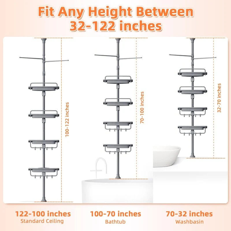 - 【𝐀𝐝𝐣𝐮𝐬𝐭𝐚𝐛𝐥𝐞 𝐭𝐨 𝐅𝐢𝐭 𝐘𝐨𝐮𝐫 𝐒𝐡𝐨𝐰𝐞𝐫-𝐍𝐨𝐭 𝐟𝐨𝐫 𝐒𝐥𝐨𝐩𝐞 𝐂𝐞𝐢𝐥𝐢𝐧𝐠】: The rustproof telescopic pole of the shower caddy has a stable lock knob design, an Upgraded screw pole design EASY TO INSTALL and STABLE, which can adjust the height from 32 to 122 inches. Adjustable shower shelf The top built-in spring has very strong pressure, more stable. The shower corner caddy organizer is ideal for containing bath supplies like shampoo, conditioner, body wash, hook razor, sponge, and more