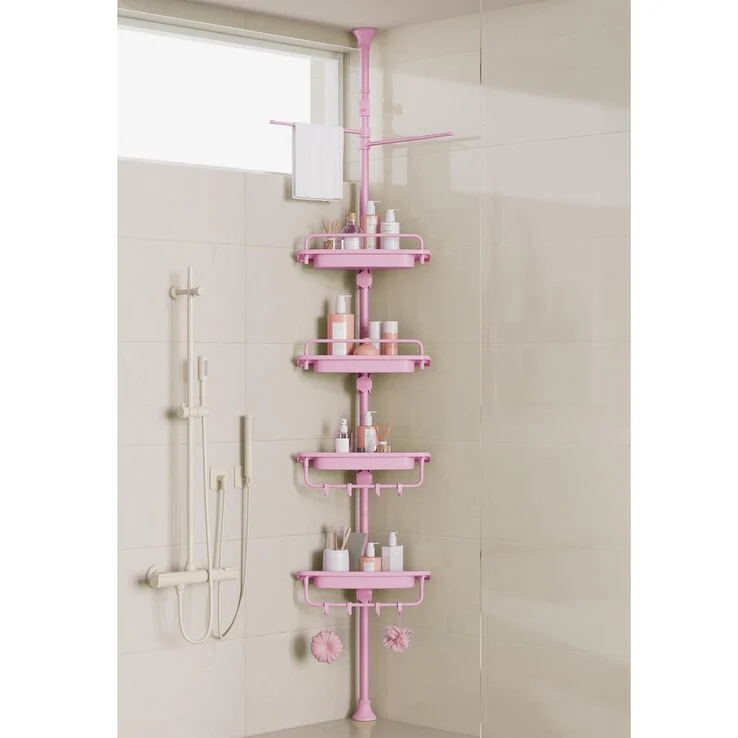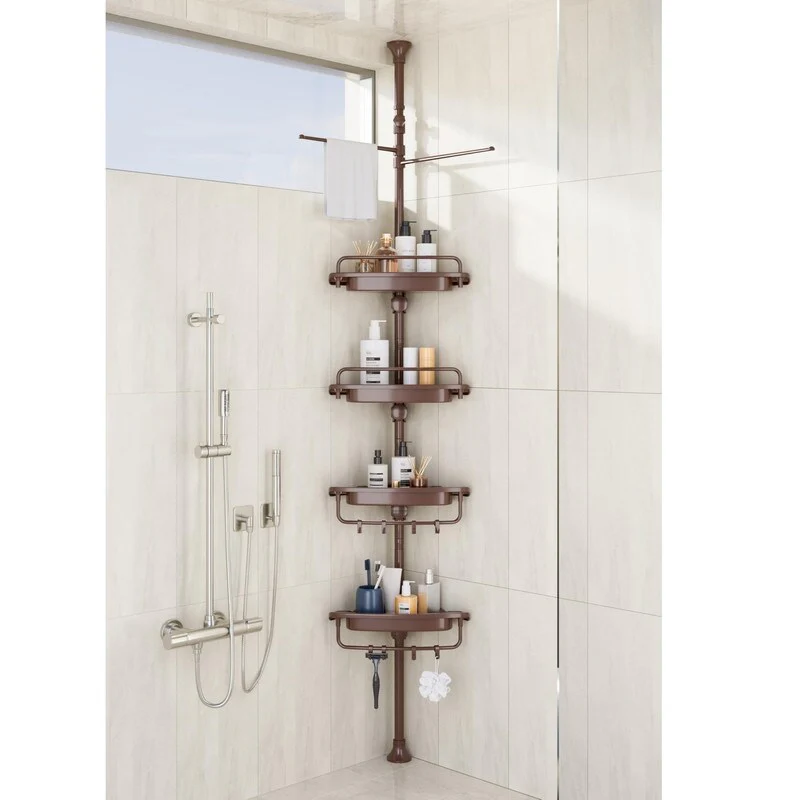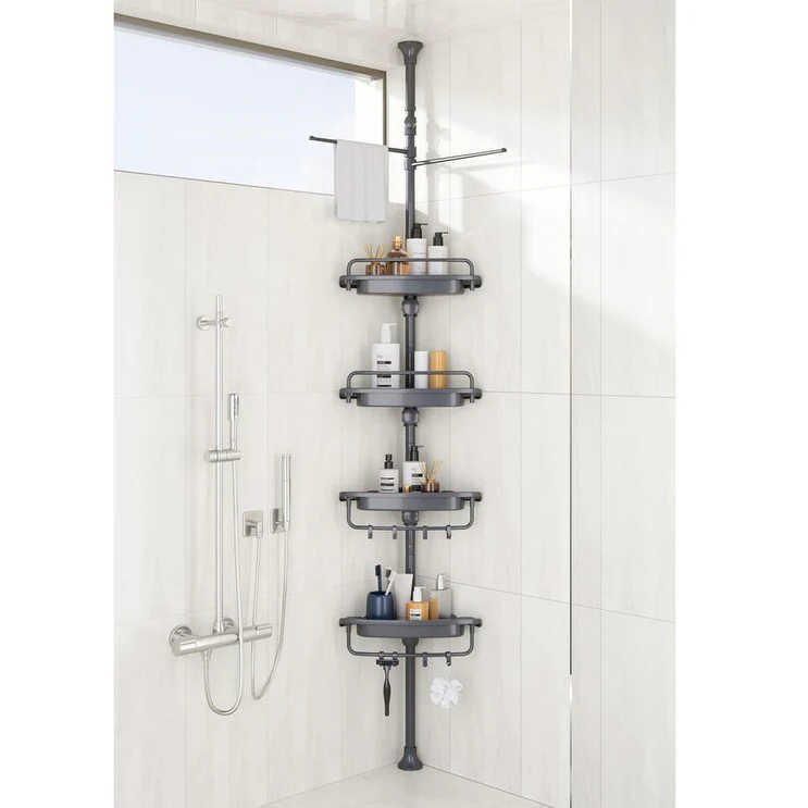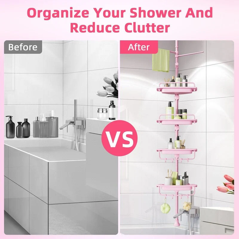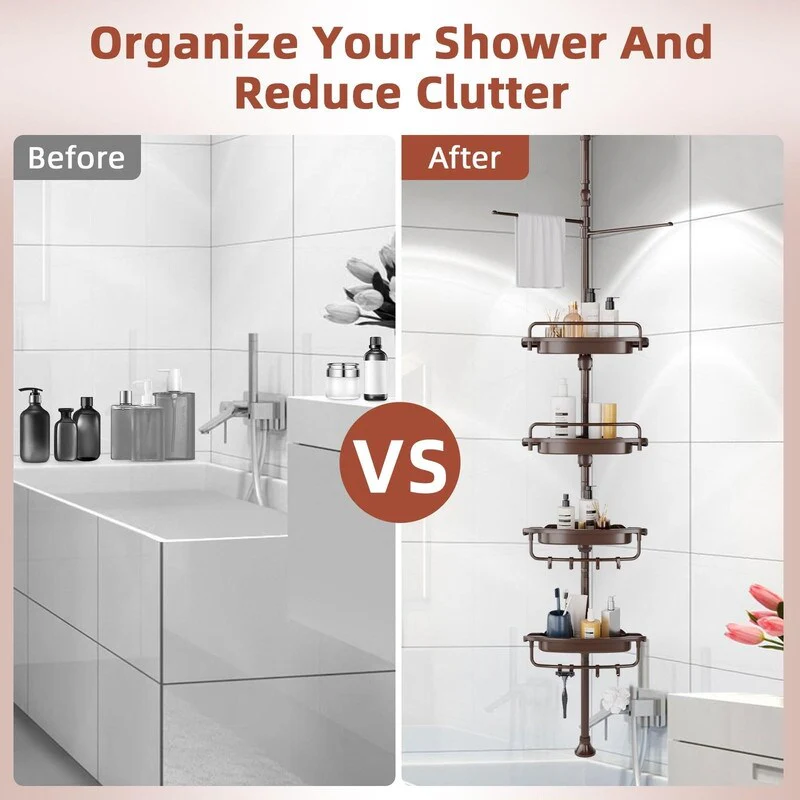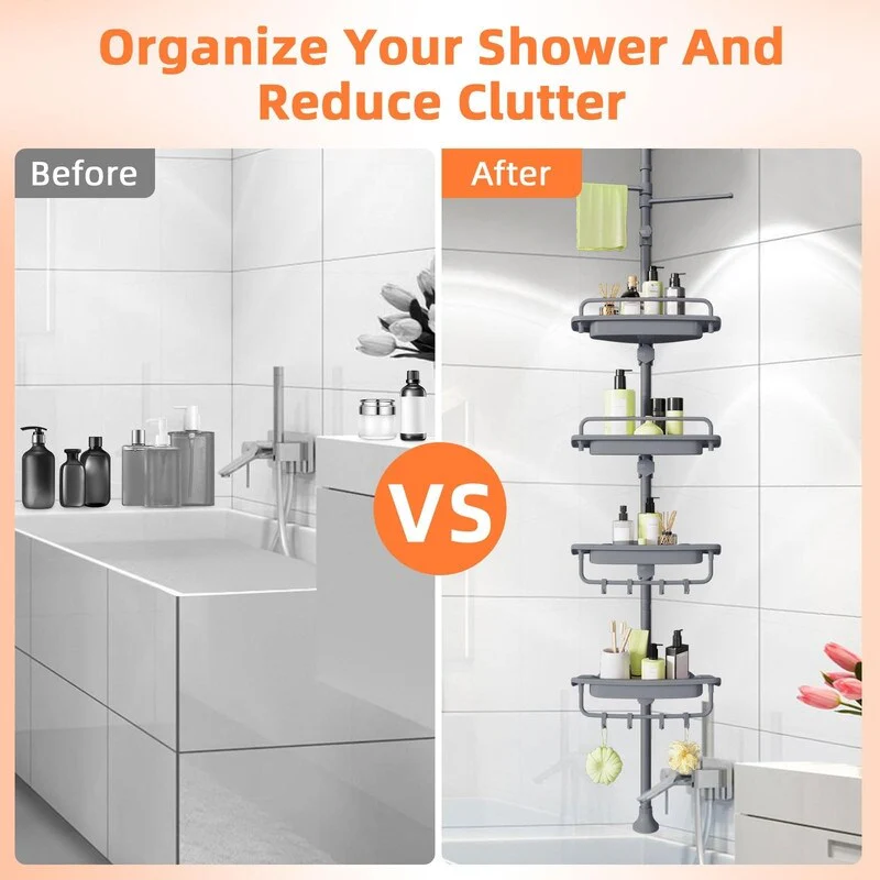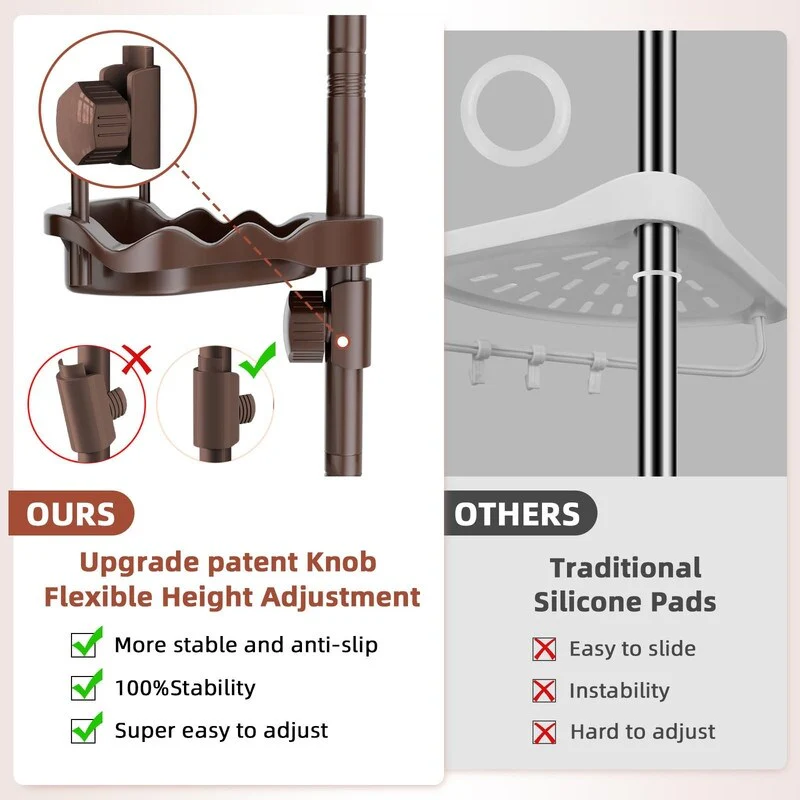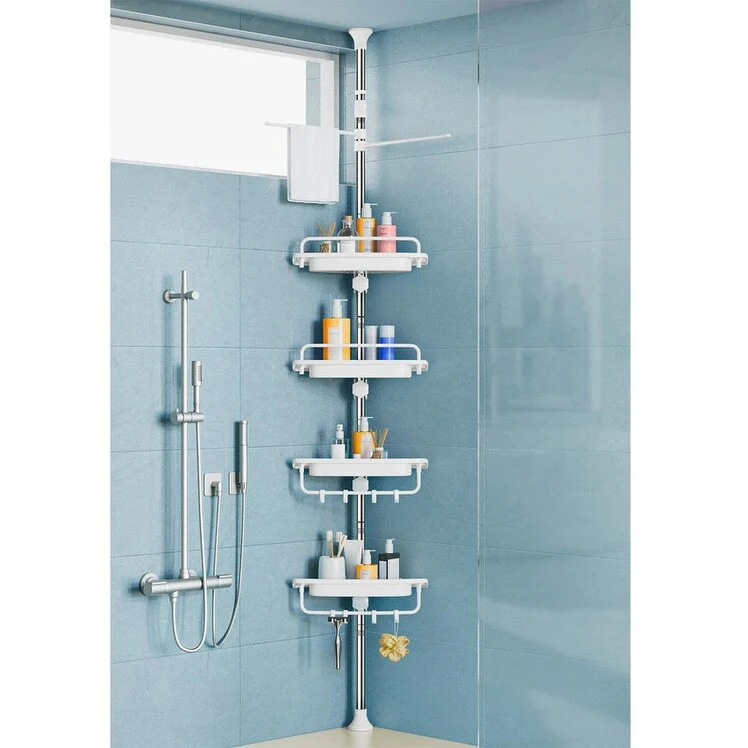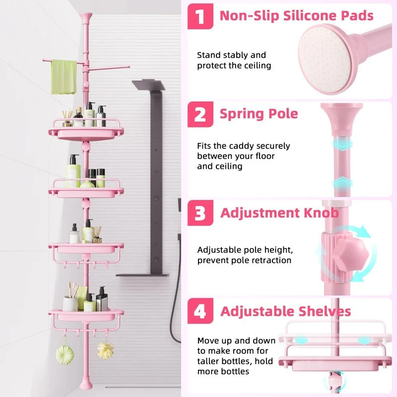 - 【𝐀𝐝𝐣𝐮𝐬𝐭𝐚𝐛𝐥𝐞 𝐭𝐨 𝐅𝐢𝐭 𝐘𝐨𝐮𝐫 𝐒𝐡𝐨𝐰𝐞𝐫-𝐍𝐨𝐭 𝐟𝐨𝐫 𝐒𝐥𝐨𝐩𝐞 𝐂𝐞𝐢𝐥𝐢𝐧𝐠】: The rustproof telescopic pole of the shower caddy has a stable lock knob design, an Upgraded screw pole design EASY TO INSTALL and STABLE, which can adjust the height from 32 to 122 inches. Adjustable shower shelf The top built-in spring has very strong pressure, more stable. The shower corner caddy organizer is ideal for containing bath supplies like shampoo, conditioner, body wash, hook razor, sponge, and more