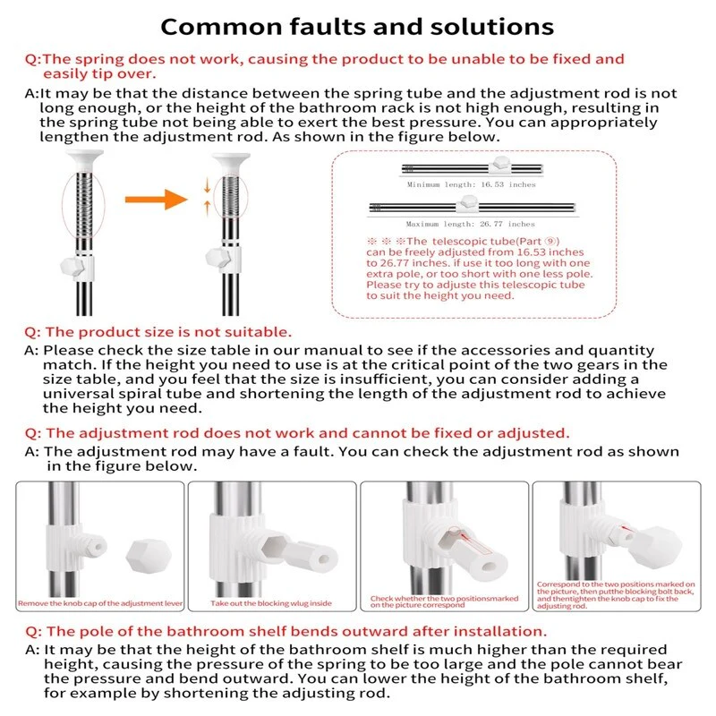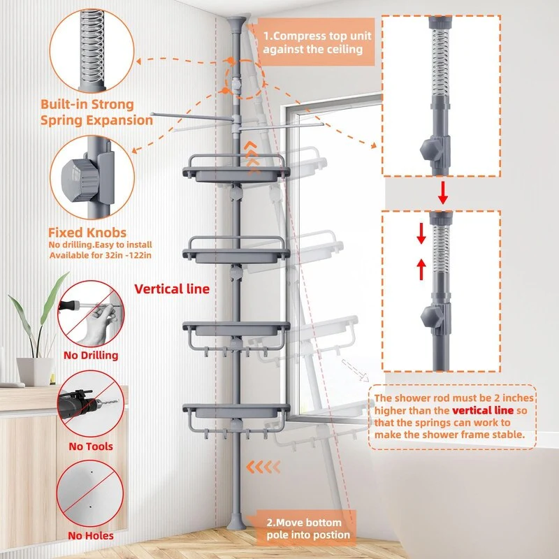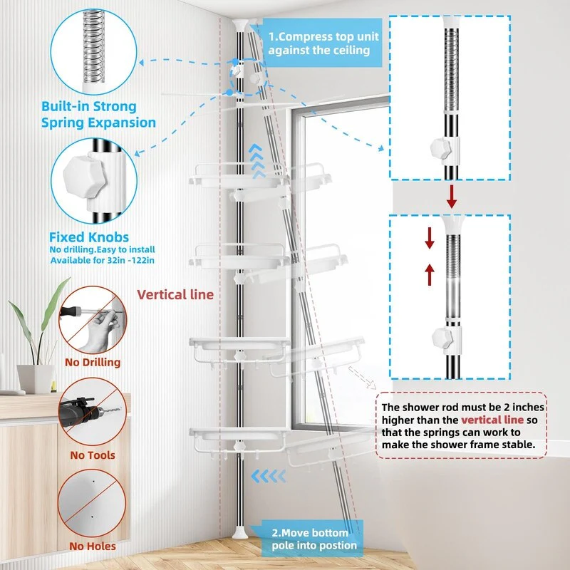 - 【𝐅𝐚𝐬𝐭 𝐚𝐧𝐝 𝐄𝐚𝐬𝐲 𝐈𝐧𝐬𝐭𝐚𝐥𝐥𝐚𝐭𝐢𝐨𝐧】: Drill free shower rack, no drilling, can be installed within minutes without tools and no cutting rods. Rubber caps feet hold it securely. Won’t damage the floor and ceiling. With this shower shelf organizer, you always have all of your bathroom accessories right within easy reach when you're in the shower in any bathroom! A detailed installation manual is in the box, and we will send you an installation video immediately if you contact us