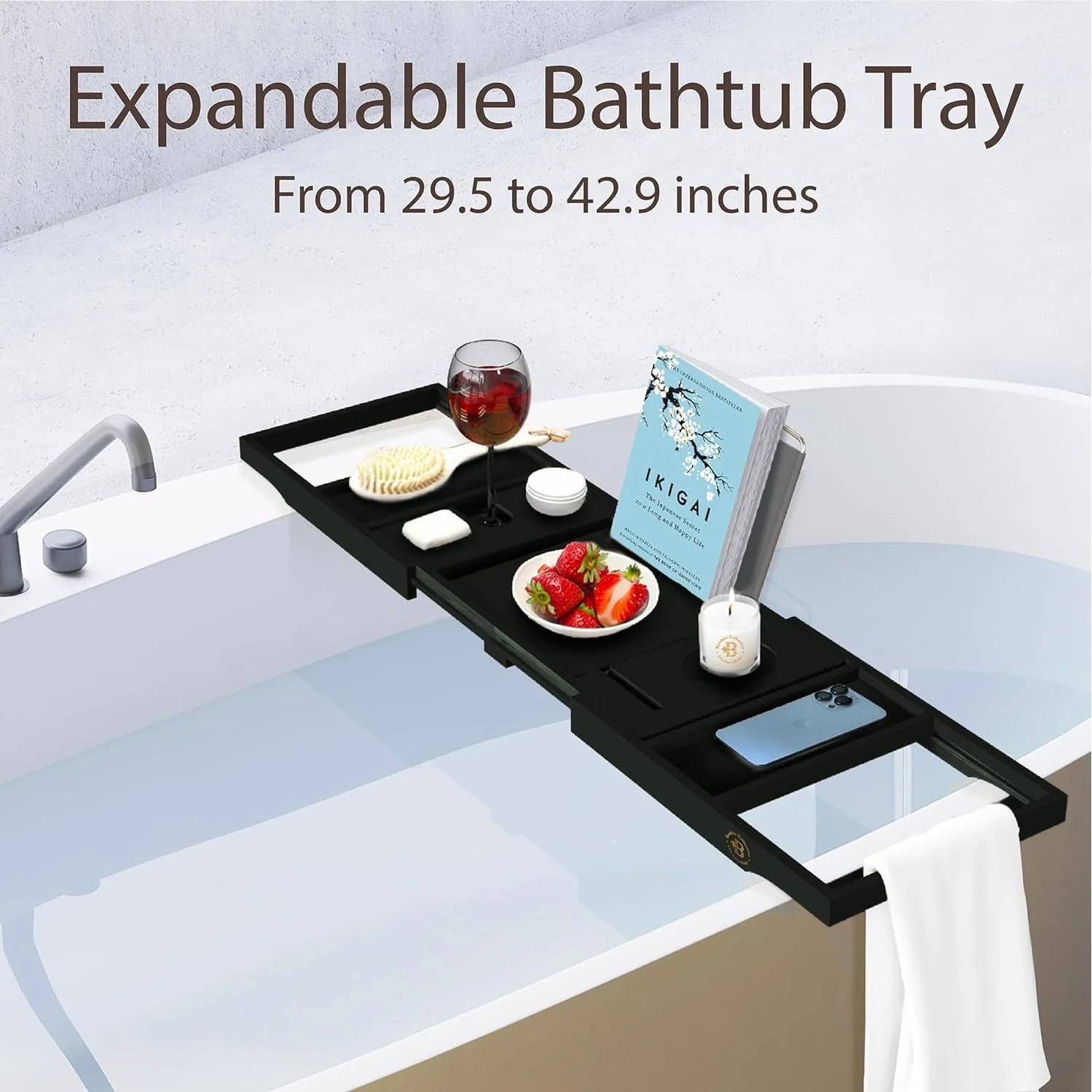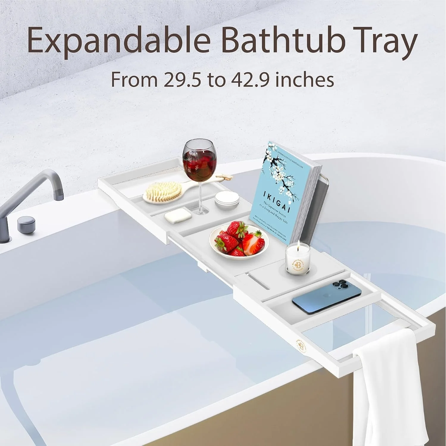 - ULTIMATE CONVENIENCE & ELEGANCE: This bath tray for tub is thoughtfully designed compartments for your wine glass, phone, tablet, and luxurious items that are meticulously arranged. Indulge in an elegant and uninterrupted soak with everything you desire right at your fingertips.