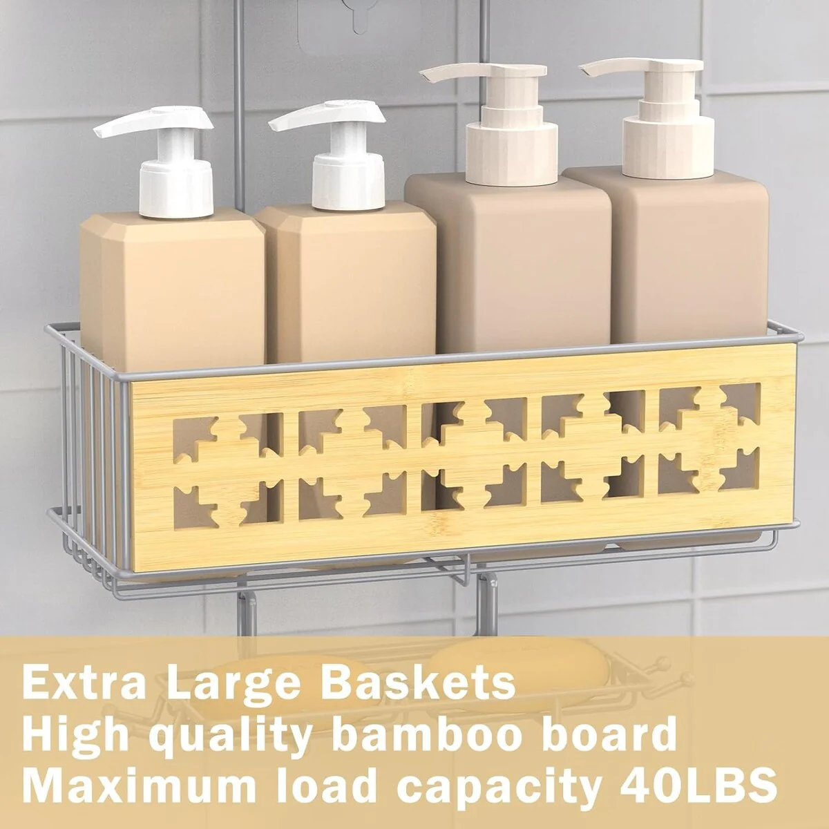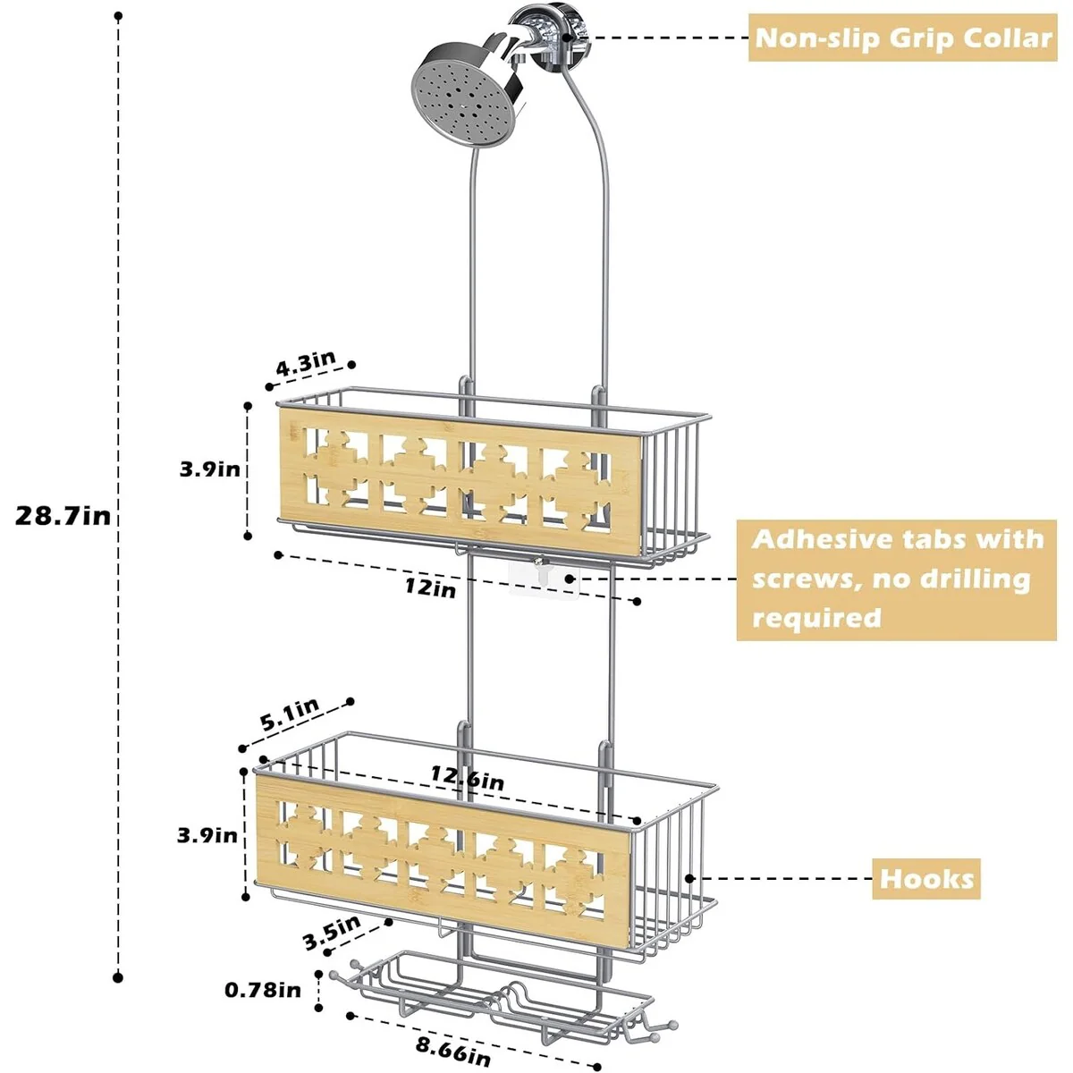 - 【Size & Unique Design】The height of the whole hanging shower organizer is suitable for the vast majority of bathrooms, and can make your toiletries within reach. Classic size:5.1'D x 12.6'W x 28.7'H. With a load capacity of up to 40 pounds, it can perfectly solve your storage need