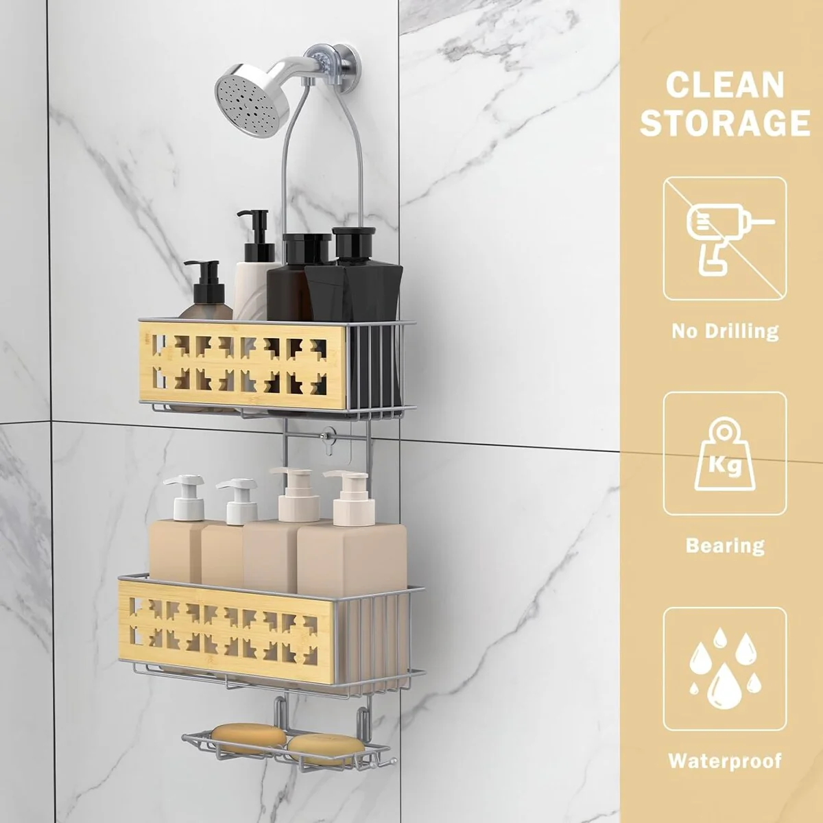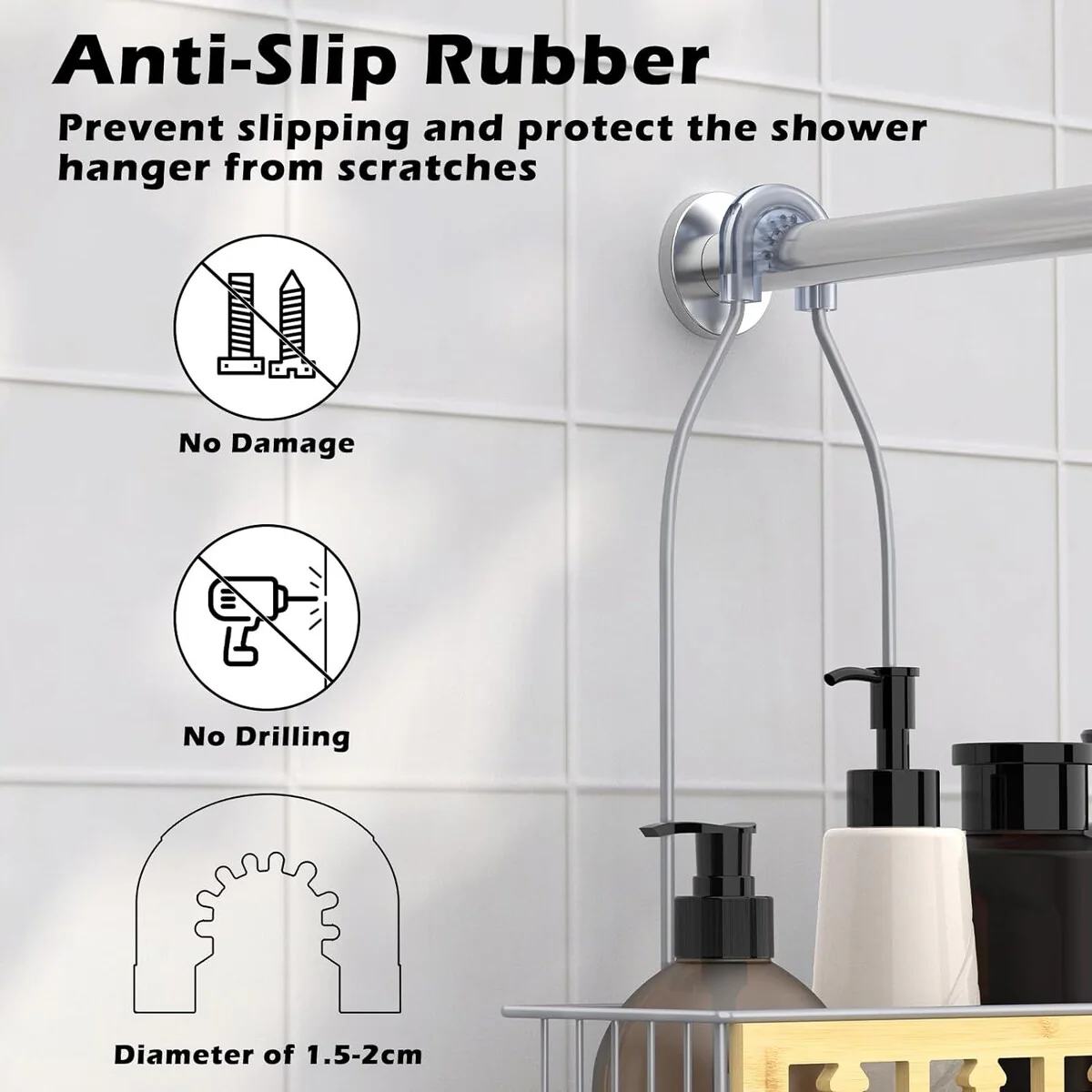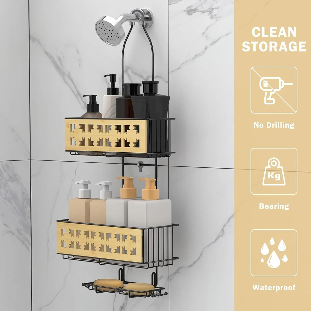 - 【With hooks & Large Capacity Shelves】This sleekly hanging shower organizer with 2 tiered design. Two layers can be used to place various shower gels and shampoos, and the lower layer has a soap holder specially designed for placing soap. Equipped with anti-slip rubber and strong adhesives, our shower racks hang firmly grips the wall, so it will not fall easily. There are also hooks designed for storing razors, bath balls, and towels.